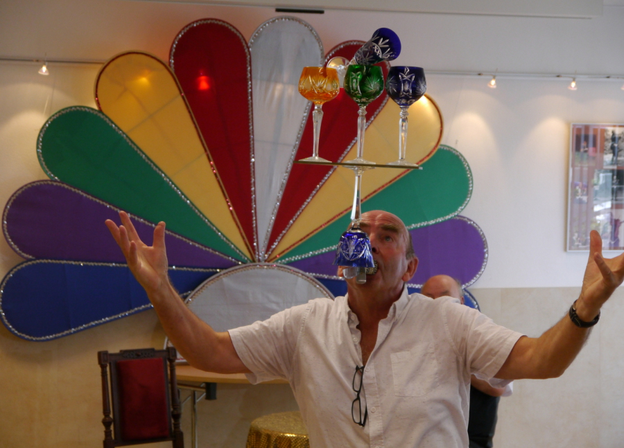Endlich war es so weit und wir durften den ersten Künstler des Clown-Museum Leipzig kennen lernen. Vergangenen Sonntag, den 26. Juli, stellte sich der Artist Gentleman Jongleur Gerd Voigt den Mitgliedern des Jugend- und Altenhilfeverein in Paunsdorf vor und erzählte im Rahmen des Projektes „Erinnern und Bewahren“ Geschichten aus seinem Leben. Selbstverständlich präsentierte er seinem Publikum im Anschluss ein paar seiner Kunststücke aus der Show „Balancen mit Kristall“.