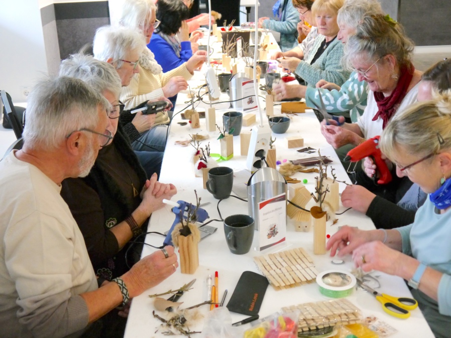 Mit viel Elan, Heißkleber, Schere und Phantasie entstanden an diesem Nachmittag liebevoll gestaltete kleine Rentiere aus Holz, Filz, Zweigen und Stoffresten. Ob klassisch mit roter Nase oder bunt verziert – jedes Rentier wurde ein Unikat. Dabei wurde nicht nur gebastelt, sondern auch viel gelacht, geredet und gemeinsam über kreative Ideen sinniert.