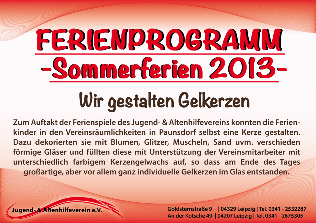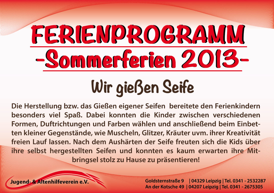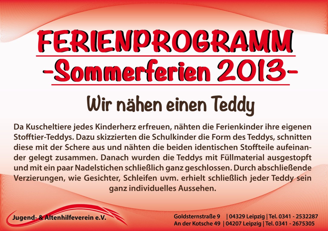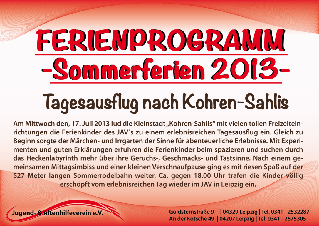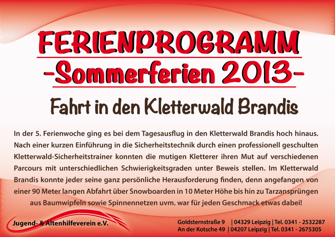 Aufgrund des positiven Feedbacks im vergangenen Jahr veranstaltete der Jugend- & Altenhilfeverein auch in diesem Sommer wieder das Feriencamp mitten im Wald der wunderschönen Dübener Heide. Durch die deutlich gestiegene Nachfrage bot der Verein diesmal zwei Durchgänge für jeweils 16 Ferienkinder in der Zeit vom 22.07.-26.07.2013 und vom 29.07.-02.08.2013 an. Die Ferienkids erwartete von Montag bis Freitag ein buntes Ferienprogramm in der freien Natur mit viel Spaß, Abenteuer und Bewegung, welches flexibel je nach Wetterlage und den Wünschen der Kids ausgestaltet wurde.