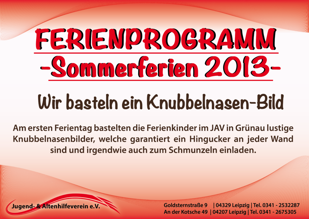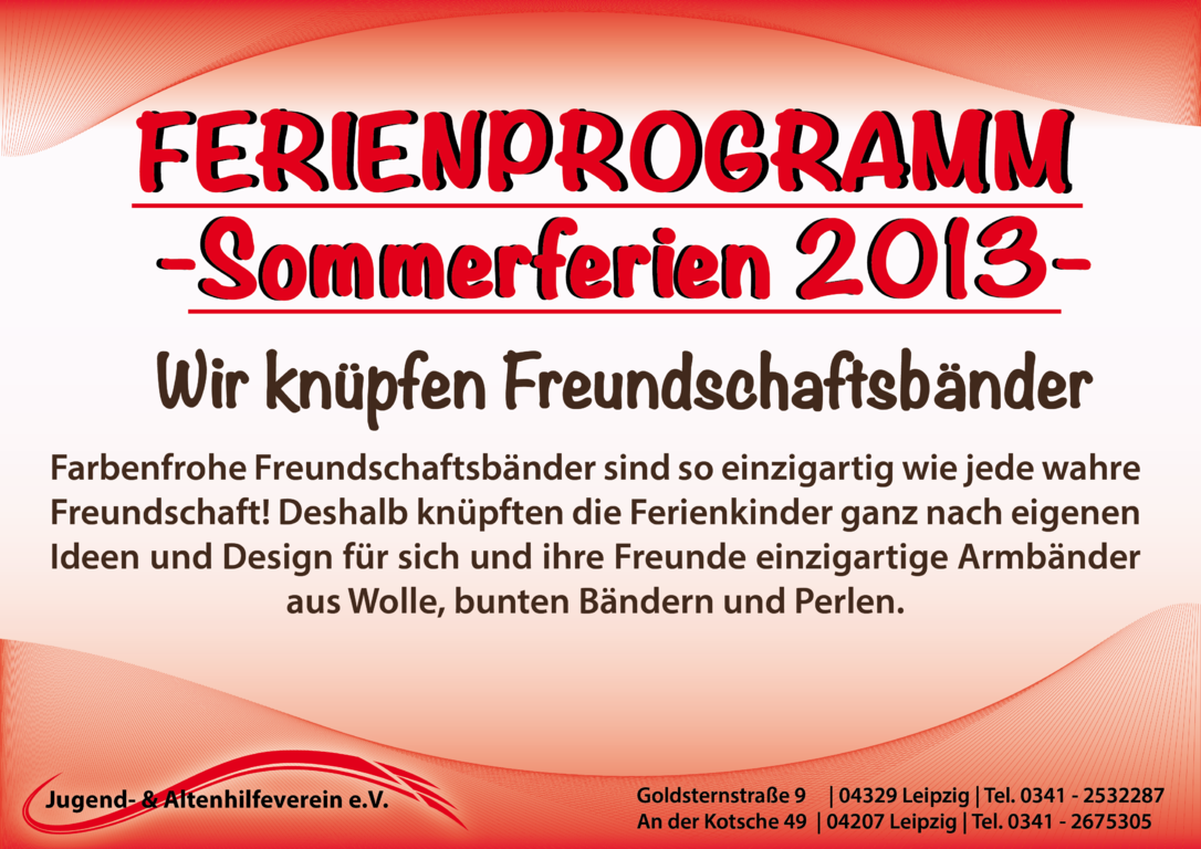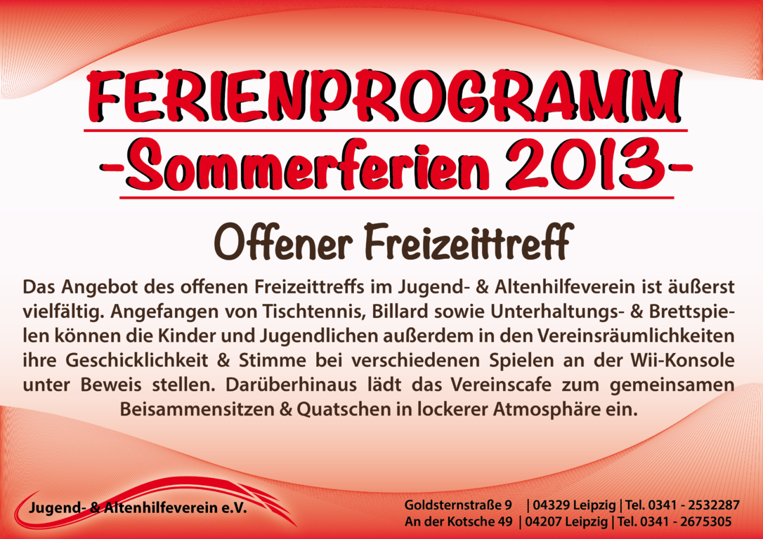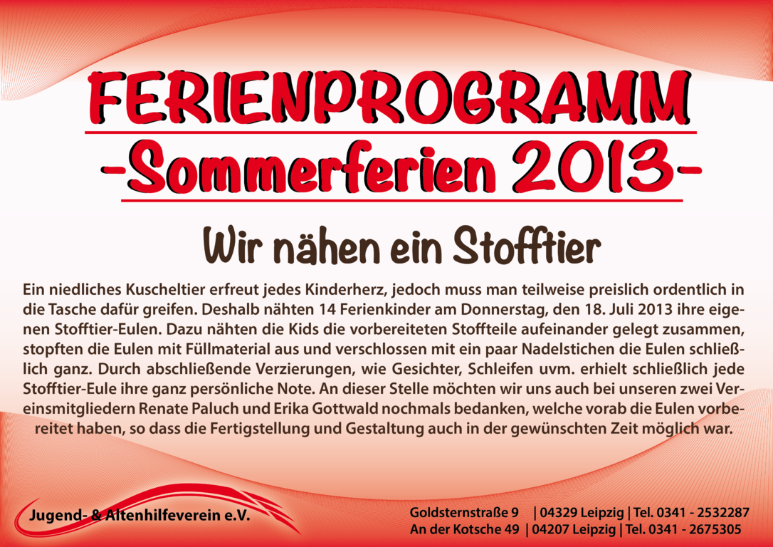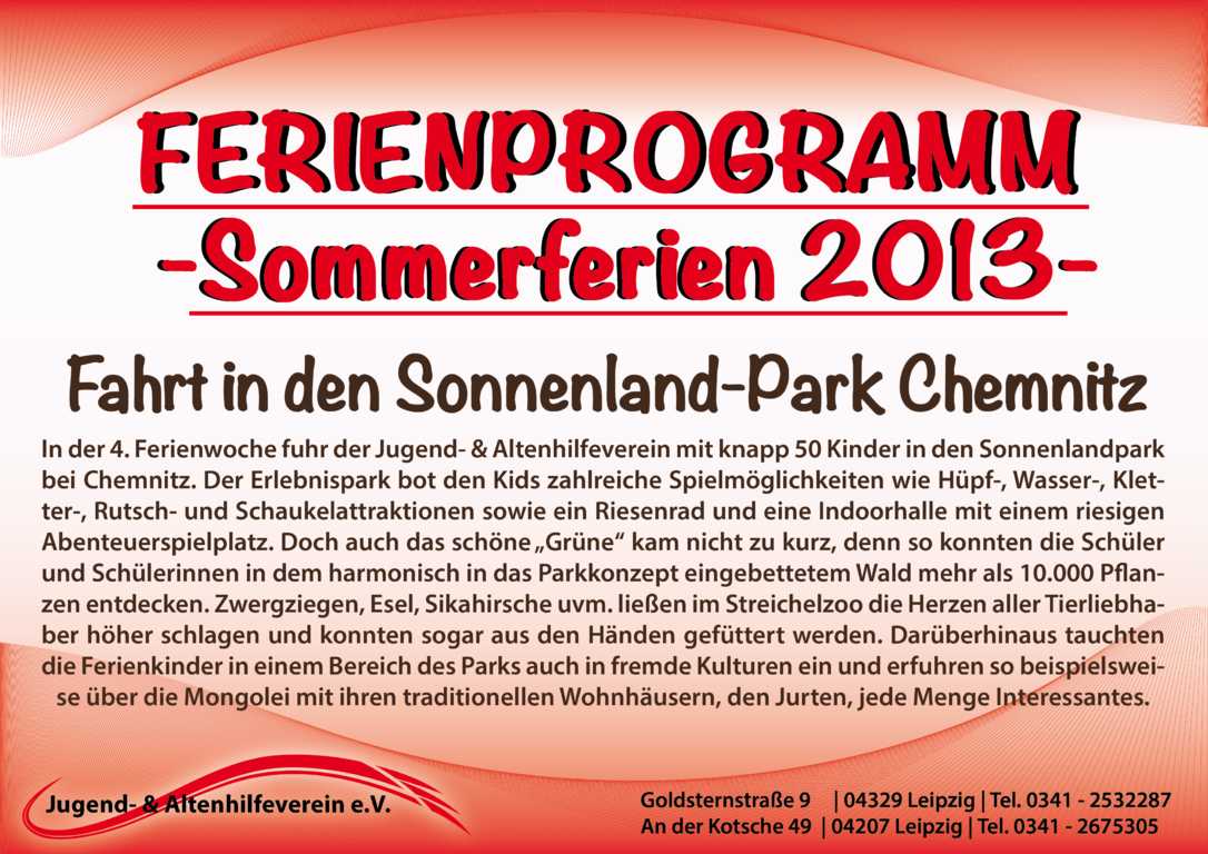Aufgrund des positiven Feedbacks im vergangenen Jahr veranstaltete der Jugend- & Altenhilfeverein auch in diesem Sommer wieder das Feriencamp mitten im Wald der wunderschönen Dübener Heide. Durch die deutlich gestiegene Nachfrage bot der Verein diesmal zwei Durchgänge für jeweils 16 Ferienkinder in der Zeit vom 22.07.-26.07.2013 und vom 29.07.-02.08.2013 an. Die Ferienkids erwartete von Montag bis Freitag ein buntes Ferienprogramm in der freien Natur mit viel Spaß, Abenteuer und Bewegung, welches flexibel je nach Wetterlage und den Wünschen der Kids ausgestaltet wurde.