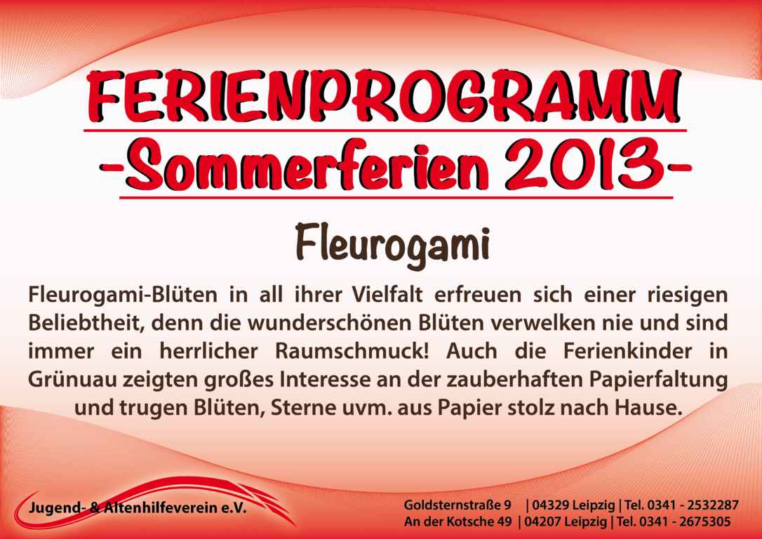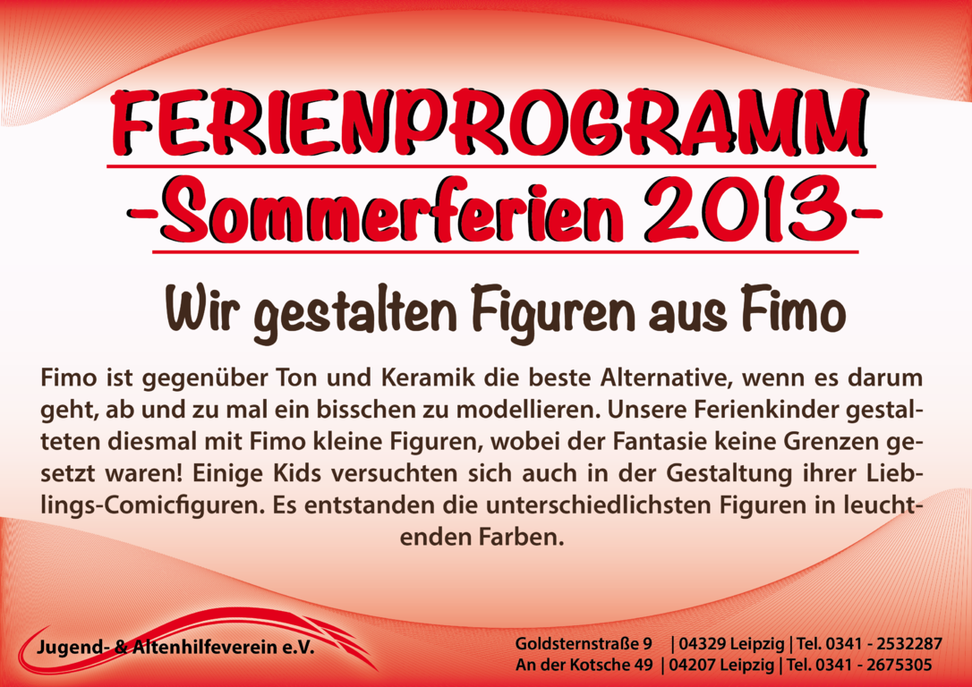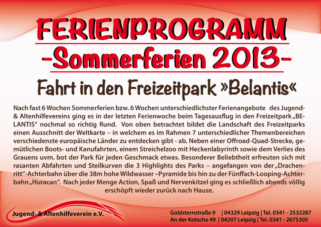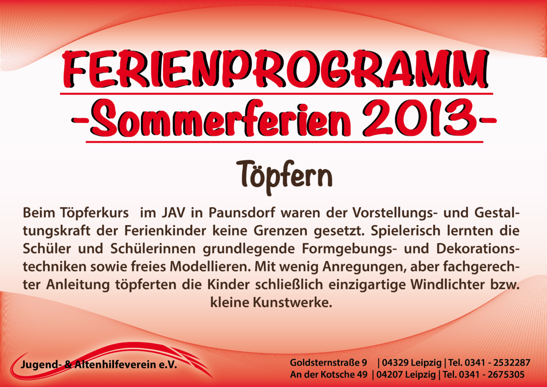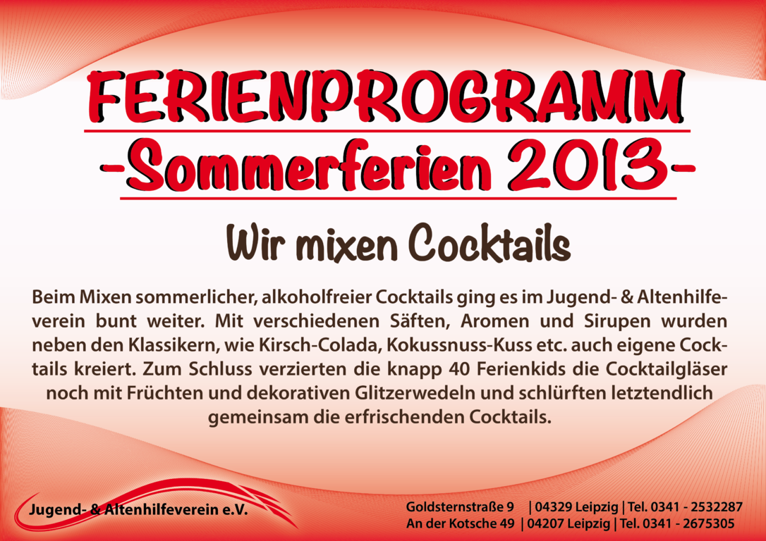 Aufgrund des positiven Feedbacks im vergangenen Jahr veranstaltete der Jugend- & Altenhilfeverein auch in diesem Sommer wieder das Feriencamp mitten im Wald der wunderschönen Dübener Heide. Durch die deutlich gestiegene Nachfrage bot der Verein diesmal zwei Durchgänge für jeweils 16 Ferienkinder in der Zeit vom 22.07.-26.07.2013 und vom 29.07.-02.08.2013 an. Die Ferienkids erwartete von Montag bis Freitag ein buntes Ferienprogramm in der freien Natur mit viel Spaß, Abenteuer und Bewegung, welches flexibel je nach Wetterlage und den Wünschen der Kids ausgestaltet wurde.