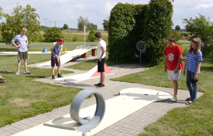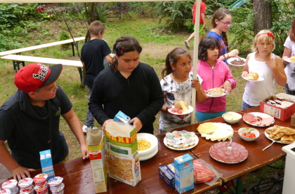 Nach der ersten Nacht im Zeltlager lud am Dienstagmorgen ein reichhaltiges Frühstücksbuffet mit Cornflakes, Brötchen, Joghurt uvm. zu einem gemütlichen Frühstück inmitten der Natur ein. Nach einem fast perfekten Start in den Tag brach die Camping-Gruppe gemeinsam zum Bergwitzsee auf, wo die Kinder mit Pool-Nudeln, Wasserbällen, Beachball-Schlägern und Wasserspritzpistolen ein paar spaßige Stunden im kühlen Nass verbrachten. Am Nachmittag konnten die Kinder entweder ihr Können bei einer Partie Minigolf unter Beweis stellen oder mit zurück ins Camp fahren und dort zum Beispiel Gesellschaftsspiele, Tischtennis, Federball oder Boccia spielen. Beim Minigolf traten die Kinder in kleinen Teams auf insgesamt 18 unterschiedlichen Bahnen gegeneinander an, wobei diese nicht nur für Abwechslung sorgten, sondern neben etwas Glück auch ein gewisses Maß an Taktik erforderten. Nach der ausgiebigen Minigolf-Runde ging es auch für die übrigen Kinder zurück ins Heidecamp zum gemeinsamen Spielen.