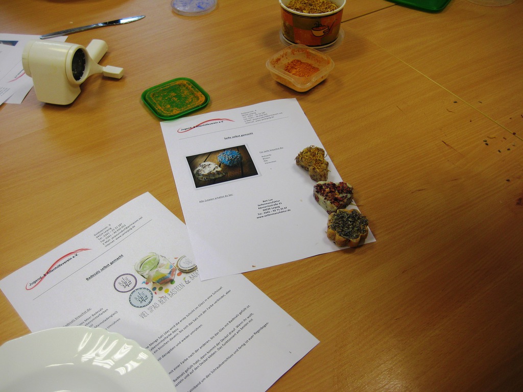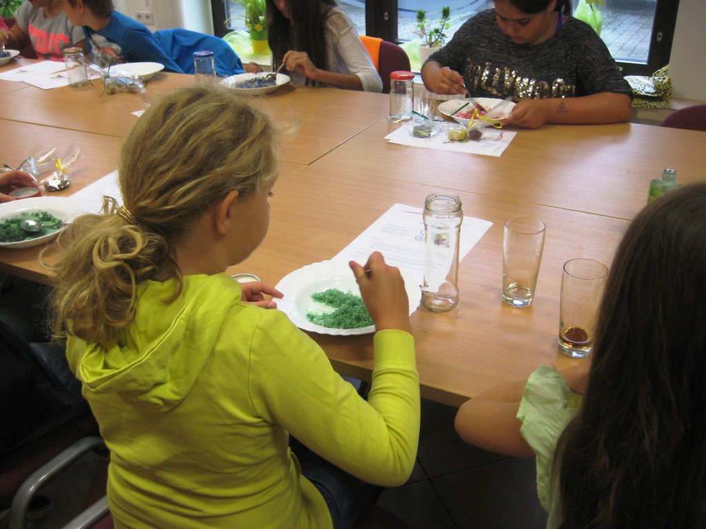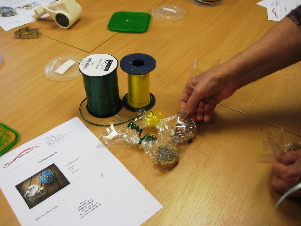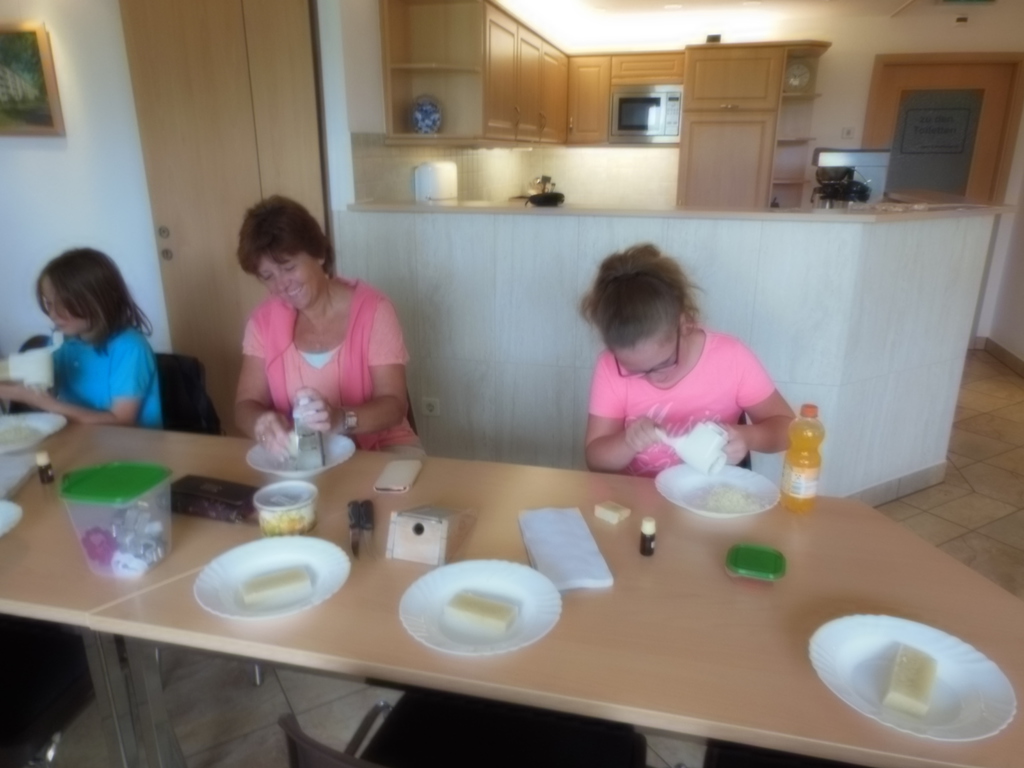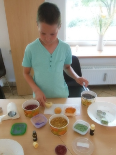 Nach den 2 Heide-Camp-Durchgängen ging es zu Beginn der dritten Ferienwoche im Jugend- und Altenhilfeverein bunt mit weiteren Ferienangeboten weiter. Am Montag, den 27. Juli 2015 lud der Jugend- und Altenhilfeverein in Grünau zur Herstellung von Badesalz und Seife ein. Für die Herstellung der Seife vermischten die Kinder je nach Belieben verschiedene Blüten und Öle mit geraspelter Rohseife und gaben das gut vermengte Gemisch in ein Förmchen. So entstanden kurzerhand ganz individuelle Seifenstückchen, welche im Anschluss noch hübsch eingepackt wurden und somit als schönes Geschenk dienen!Passend zur Seife stellten die Kinder auch eigenes Badesalz her. Hierzu vermischten die Kinder kleine Mengen an Salz mit Lebensmittelfarbe und Körperöl und füllten zum Schluss die unterschiedlich gefärbten Salzmengen nacheinander in Schichten in ein Glas bis das Glas schließlich komplett mit farbenfrohen Schichten an Badesalz gefüllt ist. Einige Kinder verzierten ihr Regenbogen-Badesalz zum Abschluss noch mit hübsch bemalten Etiketten und Schleifenband. Mit selbst gemachter Seife und Badesalz wird das nächste Schaumbad sicherlich zu einem besonderen Genuss!