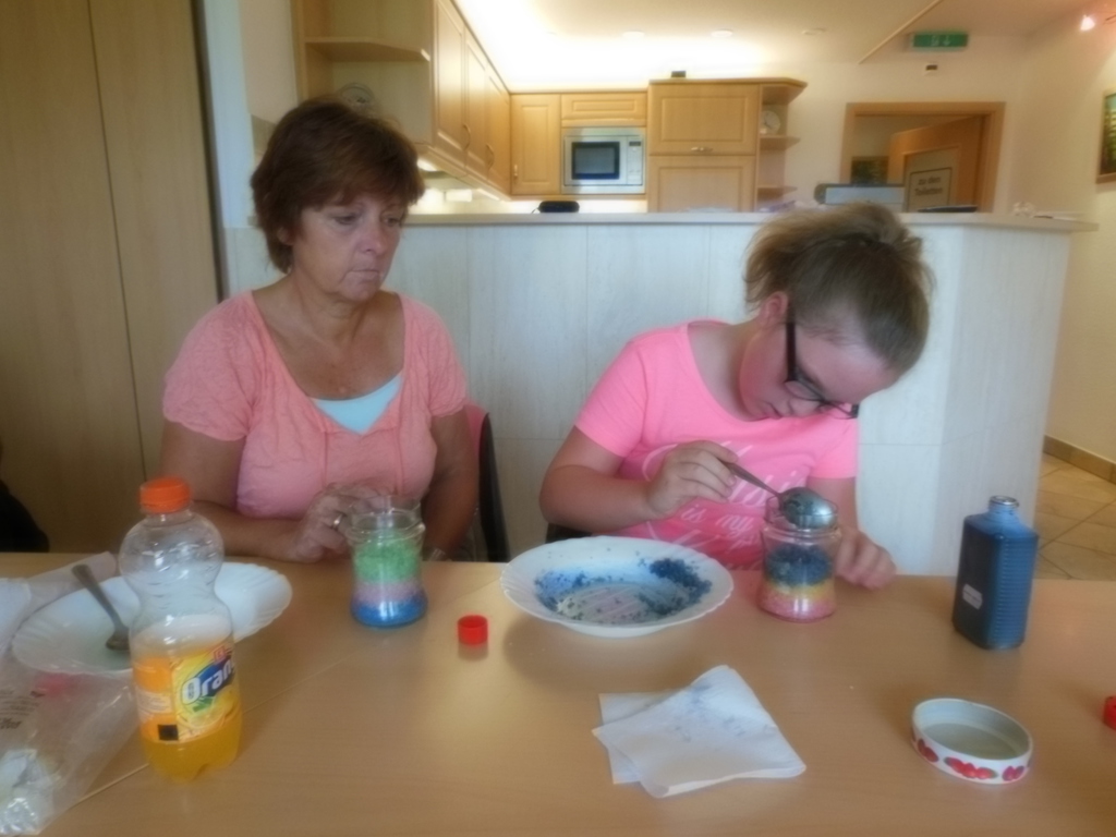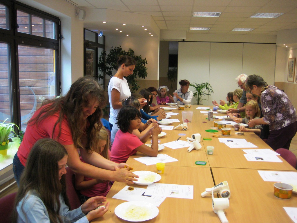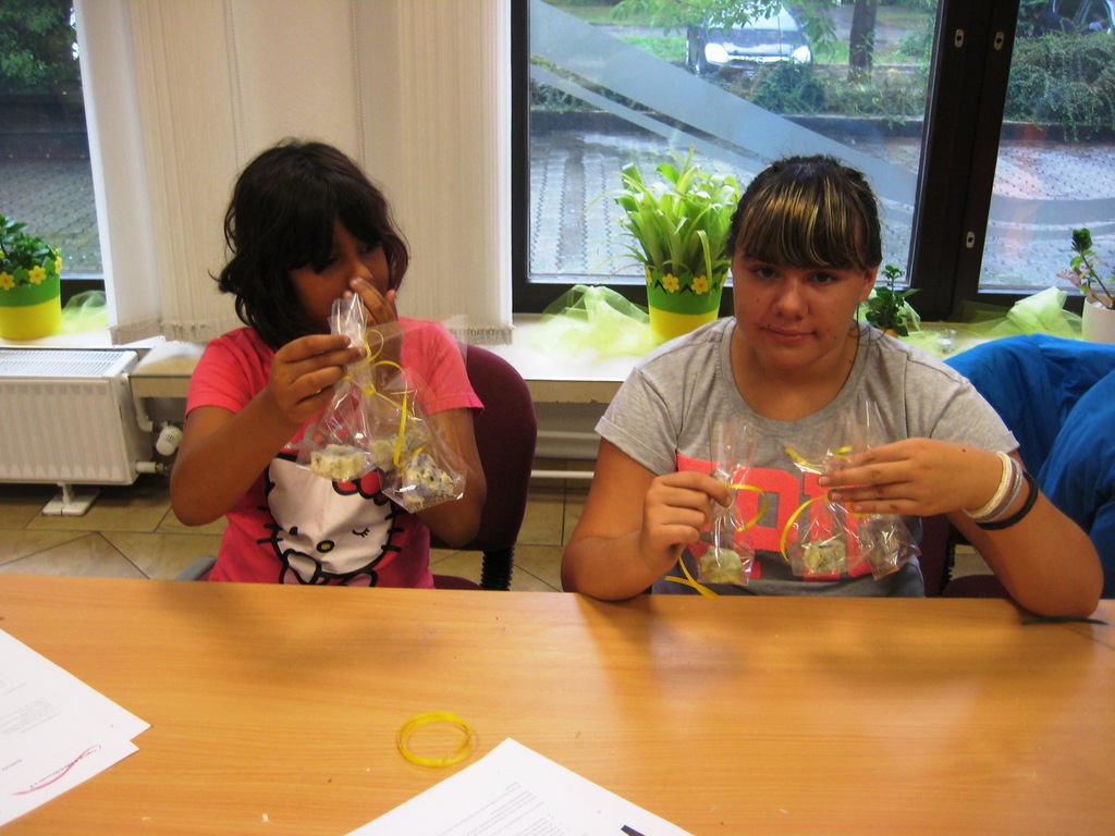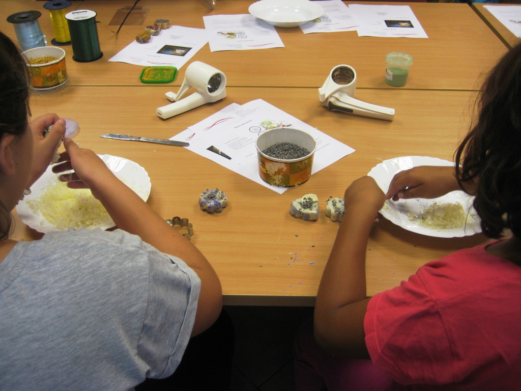 Nach den 2 Heide-Camp-Durchgängen ging es zu Beginn der dritten Ferienwoche im Jugend- und Altenhilfeverein bunt mit weiteren Ferienangeboten weiter. Am Montag, den 27. Juli 2015 lud der Jugend- und Altenhilfeverein in Grünau zur Herstellung von Badesalz und Seife ein. Für die Herstellung der Seife vermischten die Kinder je nach Belieben verschiedene Blüten und Öle mit geraspelter Rohseife und gaben das gut vermengte Gemisch in ein Förmchen. So entstanden kurzerhand ganz individuelle Seifenstückchen, welche im Anschluss noch hübsch eingepackt wurden und somit als schönes Geschenk dienen!Passend zur Seife stellten die Kinder auch eigenes Badesalz her. Hierzu vermischten die Kinder kleine Mengen an Salz mit Lebensmittelfarbe und Körperöl und füllten zum Schluss die unterschiedlich gefärbten Salzmengen nacheinander in Schichten in ein Glas bis das Glas schließlich komplett mit farbenfrohen Schichten an Badesalz gefüllt ist. Einige Kinder verzierten ihr Regenbogen-Badesalz zum Abschluss noch mit hübsch bemalten Etiketten und Schleifenband. Mit selbst gemachter Seife und Badesalz wird das nächste Schaumbad sicherlich zu einem besonderen Genuss!
