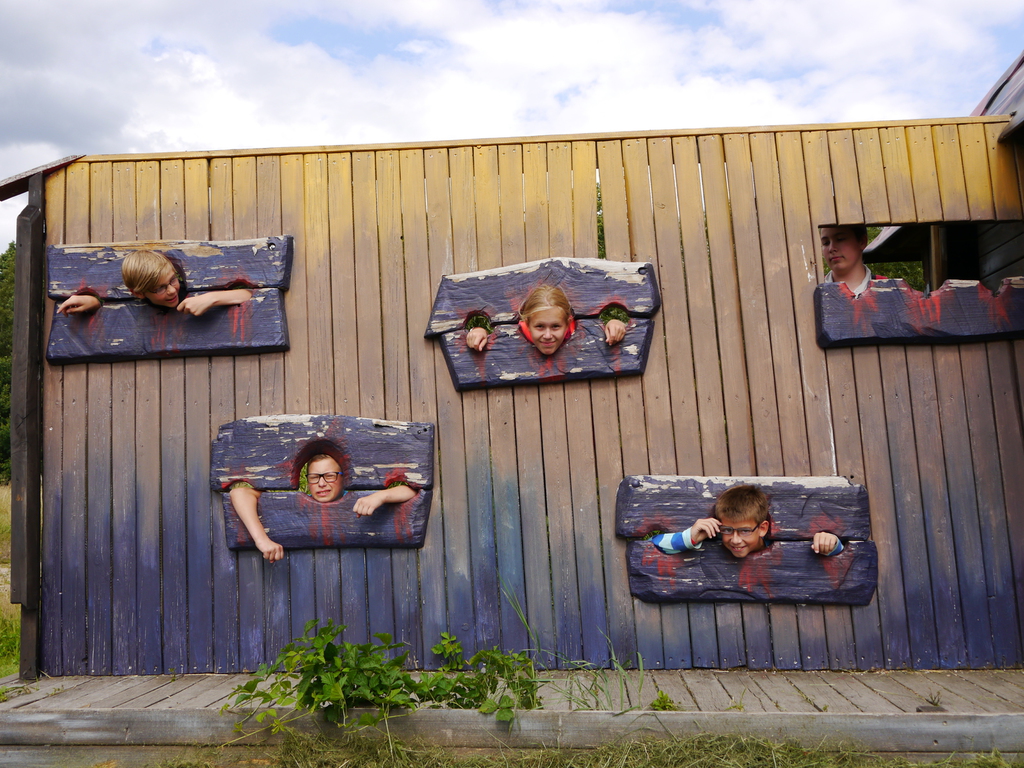 In mitten der schaurigen Finsternis des Waldes stellten sich die Kinder einem bisher ungelösten mysteriösen Rätsel. Knackende Geräusche, schaurige Musik, ein mit Kerzenschein angeleuchtetes Grab, eine aus dem Rauch erscheinende Geisterseele sowie ein verwilderter Mann mit Kettensäge ließen den Weg durch die unheimliche Finsternis unendlich wirken. Doch getreu der Devise „Gemeinsam sind wir stark!“ kämpften sich die Kinder tapfer durch den dunklen Wald und lüfteten schließlich gemeinsam das düstere Geheimnis der Dübener Heide! Nach der abenteuerlichen Nachtwanderung wurden die Kinder schließlich mit einem flackernden Lagerfeuer sowie Stockbrot und Marshmallows im Camp empfangen. Passend zur gruseligen Atmosphäre der Nachtwanderung zog über die Dübener Heide plötzlich ein kräftiger Regenschauer, so dass die gemütliche Lagerfeuer-Runde leider abgebrochen werden musste. Von der Nachtwanderung noch völlig aufgekratzt durften die Kinder sich im Gemeinschaftsbungalow erst einmal ins Trockene begeben und dort noch einen Film schauen. Während des Films bekamen unsere Kinder jedoch noch Besuch von unserem 8-köpfigen Statisten-Teams, welches für die eindrucksvollen Gruseleffekte während der Nachtwanderung gesorgt hatte. Dabei stürzten sich die Kinder, insbesonders auf das Geistermädchen namens „Elli“, welche mit gruseligen Make-Up und Kostüm für den größten Schrecken gesorgt hatte. Die Tatsache, dass unser Geistermädchen zwar gruselig aussieht, aber trotzdem ganz nett ist, hat die Kinder dann sehr beruhigt! Leider meinte es Petrus in dieser Nacht nicht sehr gut mit unserem Feriencamp, so dass aufgrund des anhaltenden Regens im Gemeinschaftsbungalow kurzerhand ein Nachtlager für die Kinder errichtet wurde. Nachdem für alle ein geeigneter Schlafplatz gefunden war, kristallisierte sich das aus der Not geborene Nachtlager schließlich doch noch als kleines Abendteuer für die Kinder heraus.