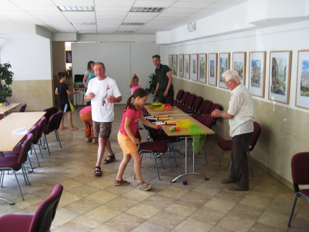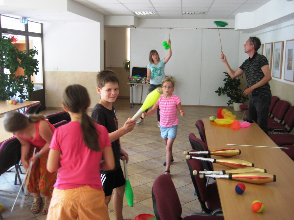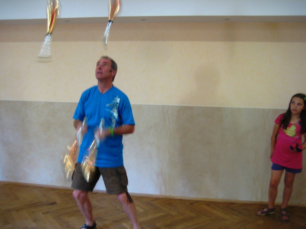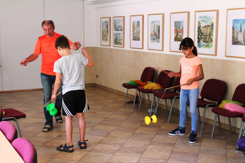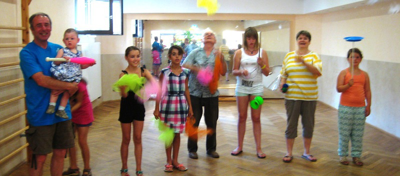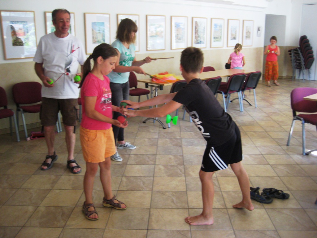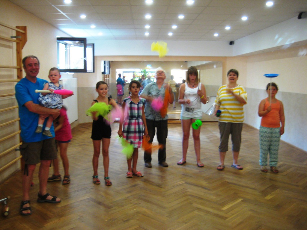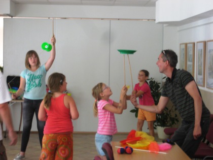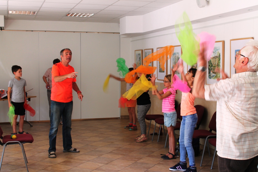 Begeistert wurde auch der 3. Tag mit Jonglage angenommen. Als Ferienangebot für Schulkinder geplant, hat es sich schnell als generationsübergreifendes Angebot bewährt. Es sieht alles so einfach aus, aber auch fliegende Tücher haben ihre Tücken. Einige Kinder wollen ihre erworbenen Fähigkeiten im Rahmen von Schulprojekten anwenden und werden sich Artikel, die man zur Jonglage benötigt, selbst zulegen. Der kleine Kreis war sich einig, dass man gern im nächsten Jahr die Übungen unter Anleitung fortsetzen möchte. Ein herzliches Dankeschön auch an den „Lehrmeister“ Michael Fritzsche, der mit Freude, Ausdauer und Einfühlungsvermögen sein Wissen vermittelt hat.