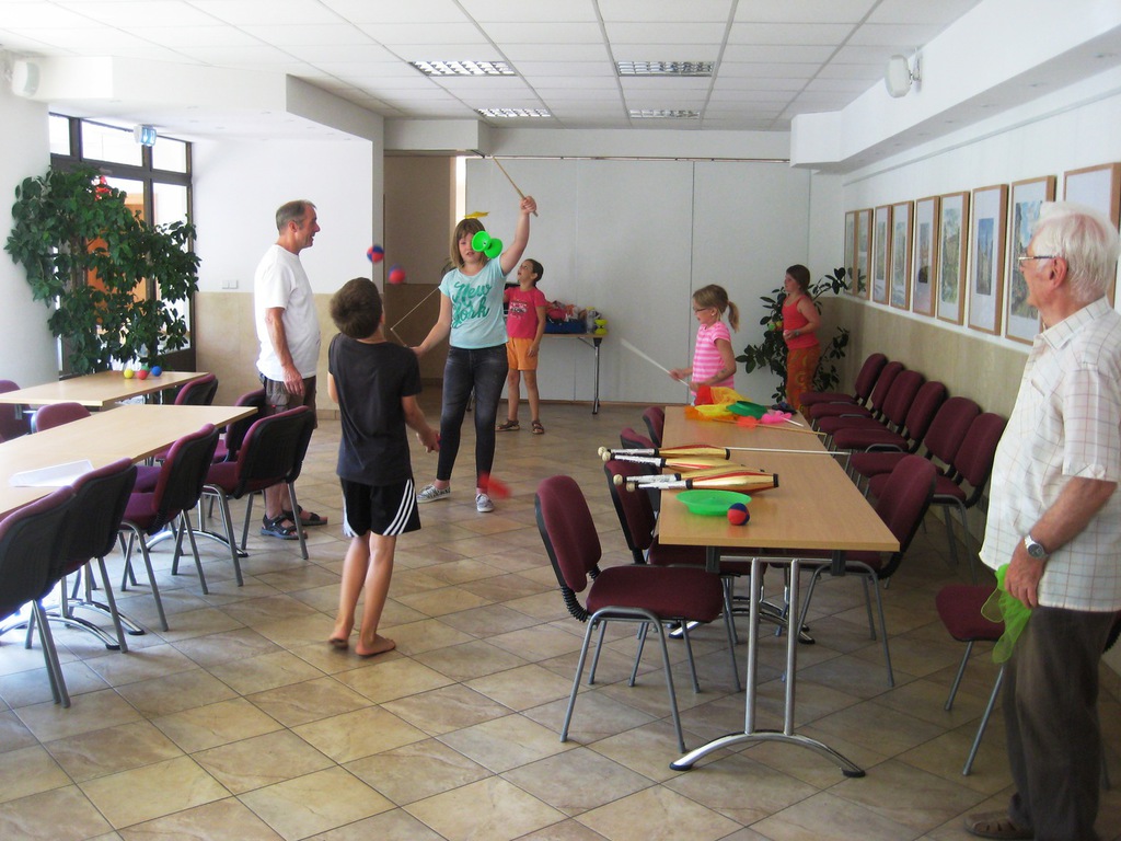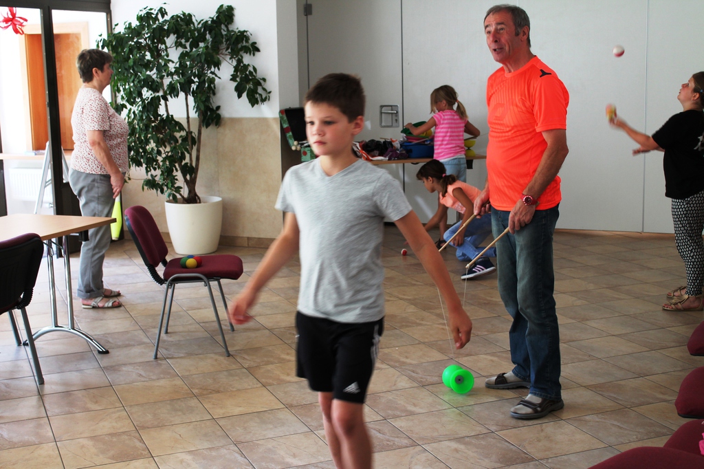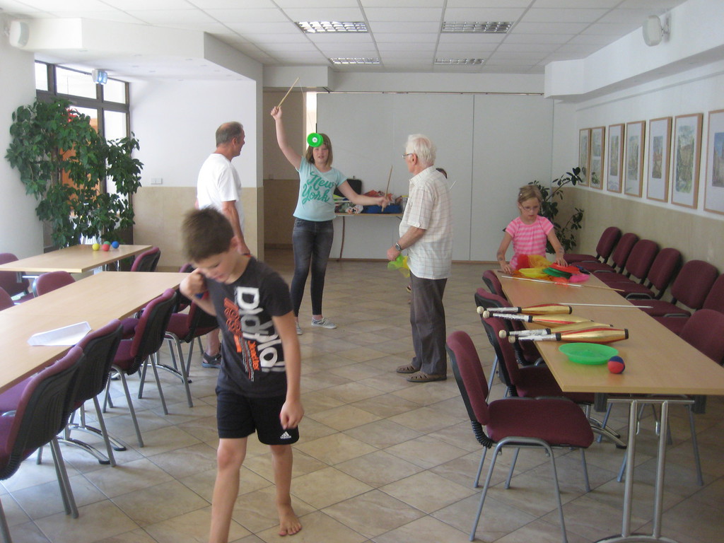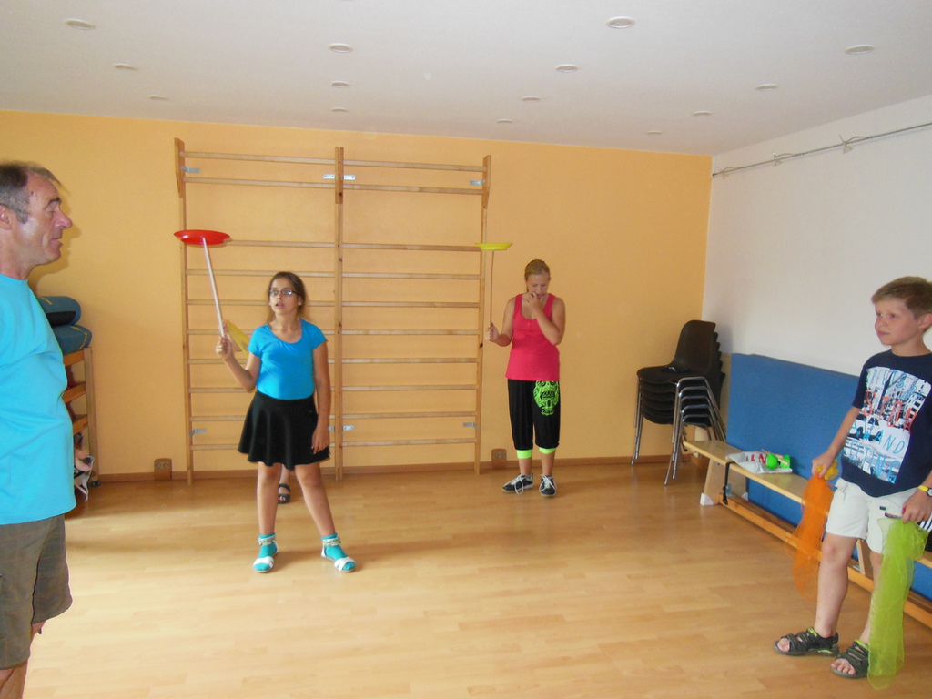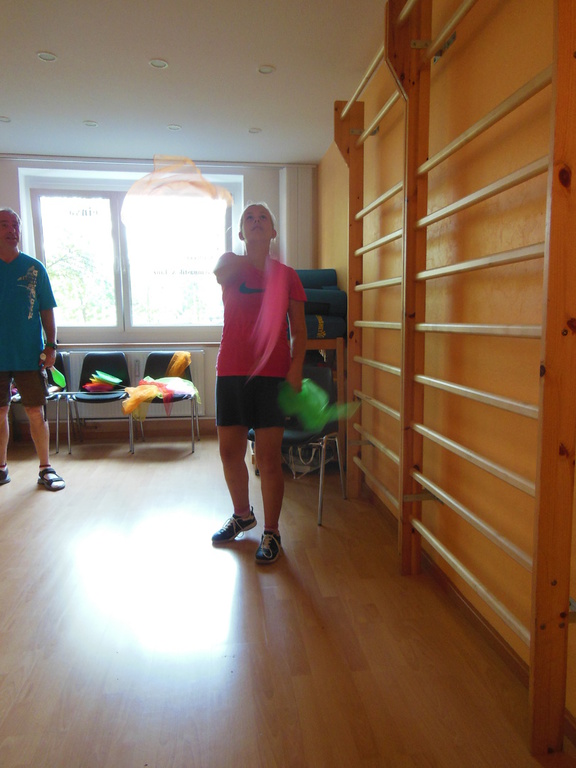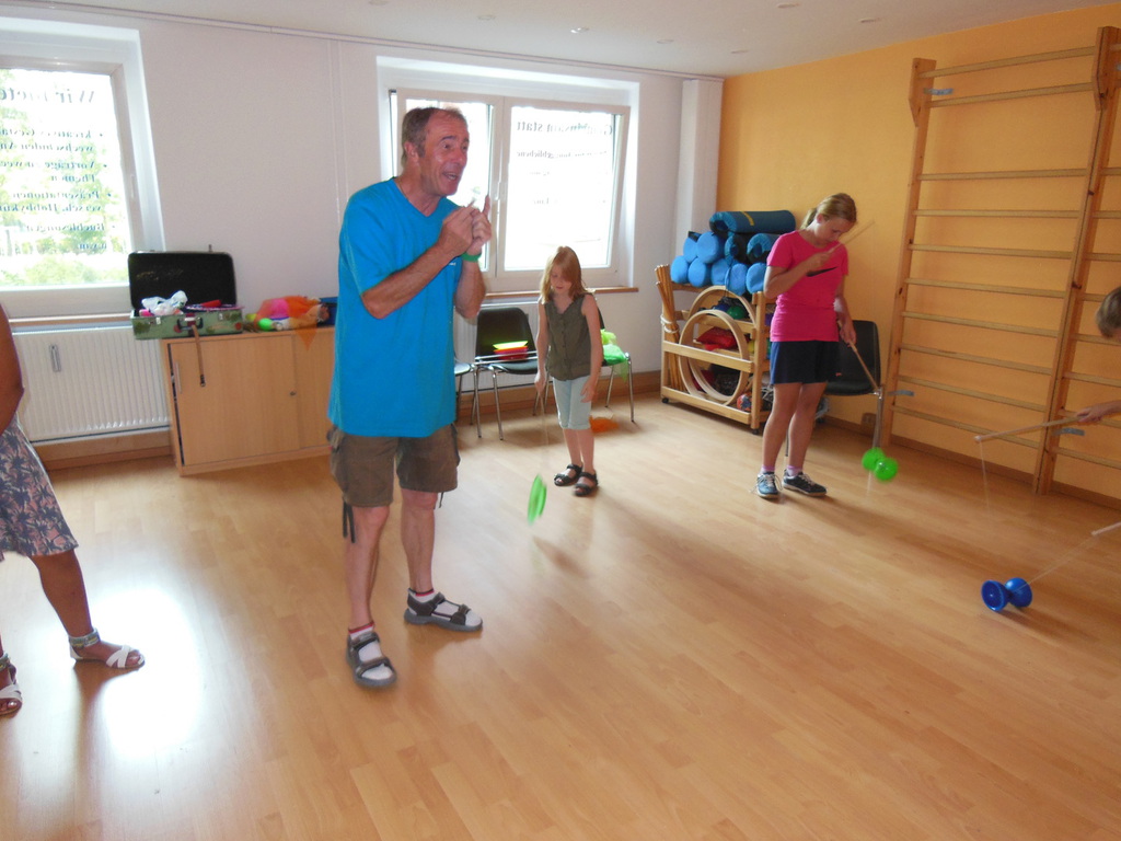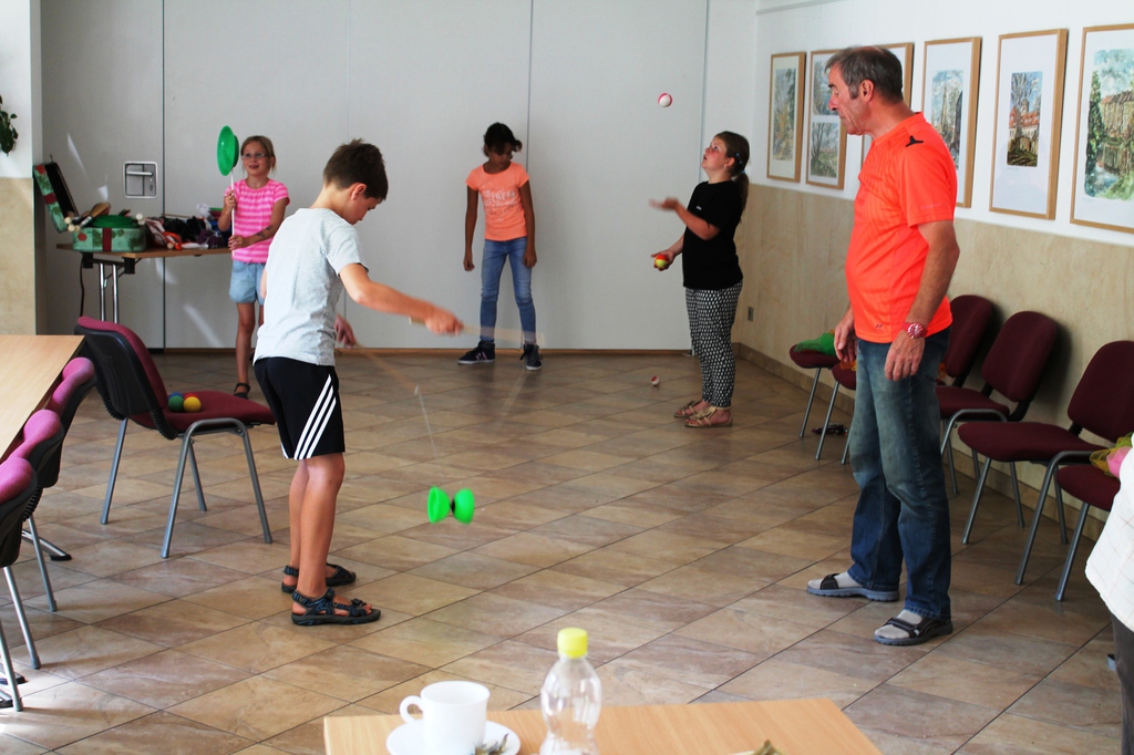 Gut gelaunt starteten die Kinder in Teil 2 des Jonglierkurses. Einige hatten zuhause geübt und konnten schon tolle Ergebnisse aufweisen. Zu dem Spiel mit Bällen kamen am heutigen Tag Übungen mit dem „Diabolo“ und Jonglage mit Tellern, was bei einigen auf Anhieb gut gelang. Auch unsere Senioren, die sich für das Thema interessierten waren mit Eifer dabei und hatten gemeinsam mit den Kindern viel Freude.