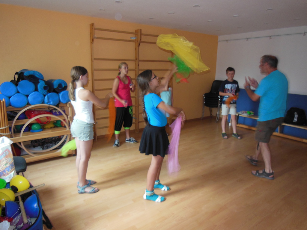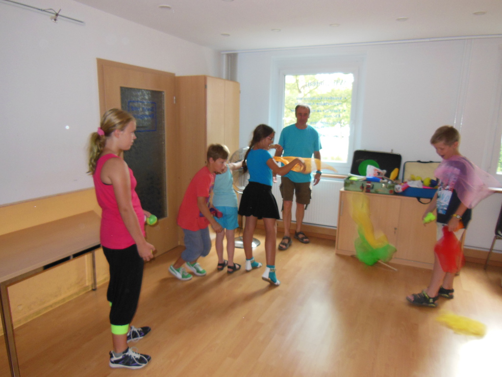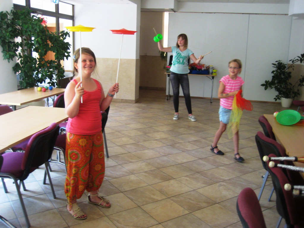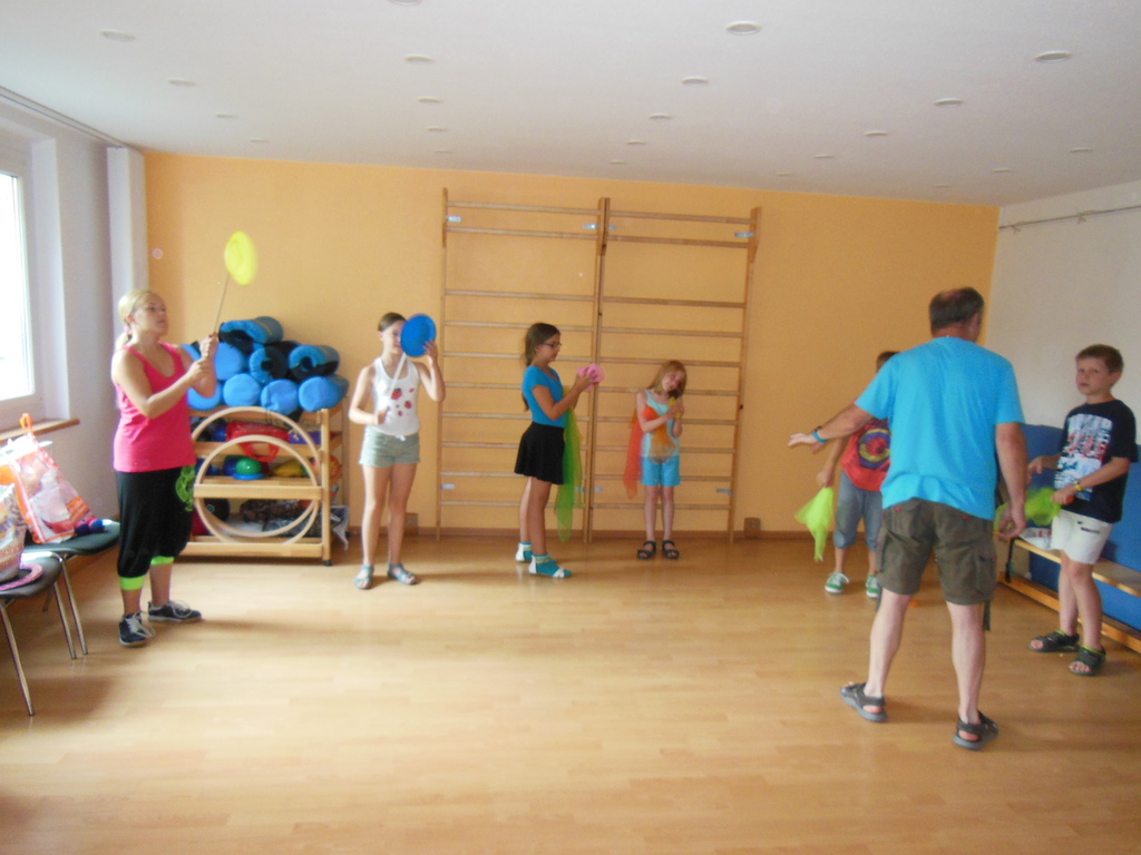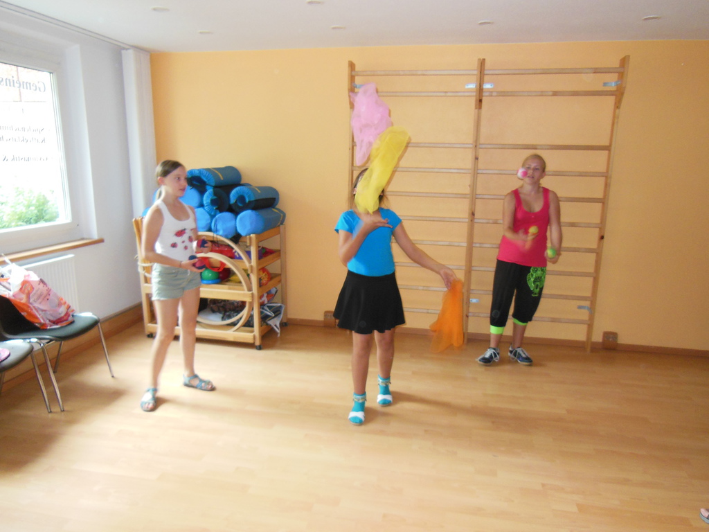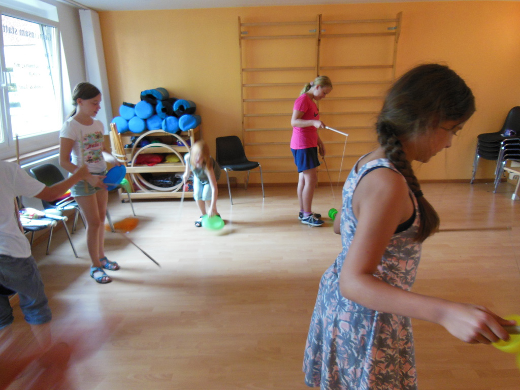 Zugegeben, aller Anfang ist schwer: Plumps – schon fällt der Ball zu Boden. Denn es ist gar nicht so leicht, mit zwei Händen drei Bälle in der Luft zu halten. Aber unsere Ferienkinder haben in einem 3-tägigen Jonglierkurs im Rahmen der Ferienspiele bewiesen, dass auch Jonglieren erlernbar ist. Angefangen mit Tüchern, welche langsamer fliegen als Bälle und sich somit auch leichter greifen lassen, konnten die Ferienkinder während der drei Tage nach und nach ihre Leistung steigern. Stück für Stück verbesserten die Kinder ihre Reaktionsfähigkeit sowie das Konzentrationsvermögen und Zusammenspiel von Augen und Händen. Mit den ersten Erfolgen, stellte sich auch die Motivation zur Fortsetzung des Trainings ein. Nach und nach stiegen die Kinder dann auch auf Bälle, Keulen und Sticks um und konnten erste Erfolge verzeichen. Wir sind uns sicher, dass ein Großteil der Ferienkinder zukünftig auch zuhause die erlernten Fähigkeiten weiter üben wird.