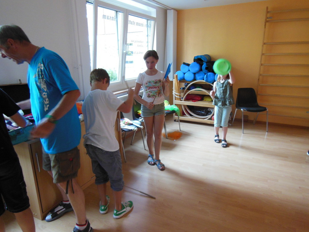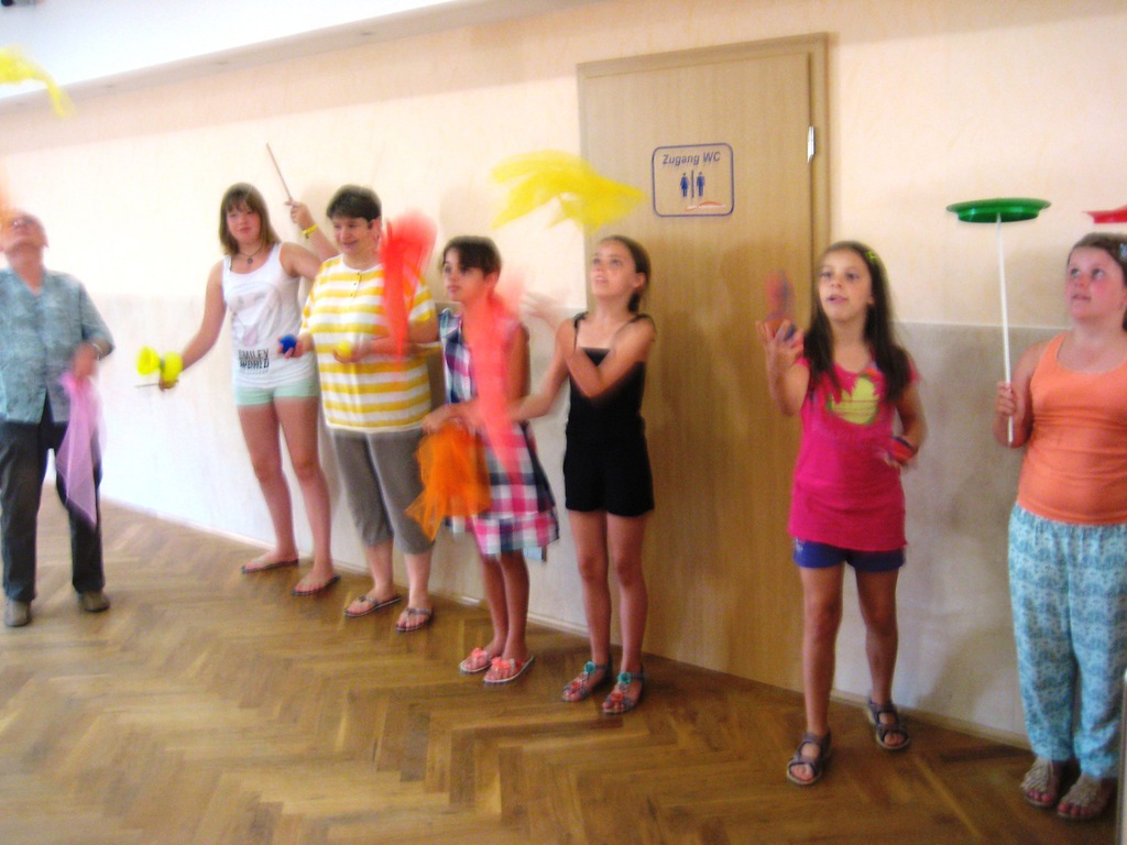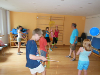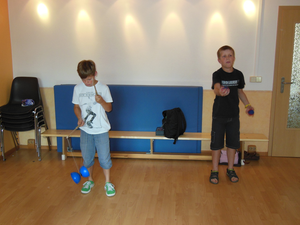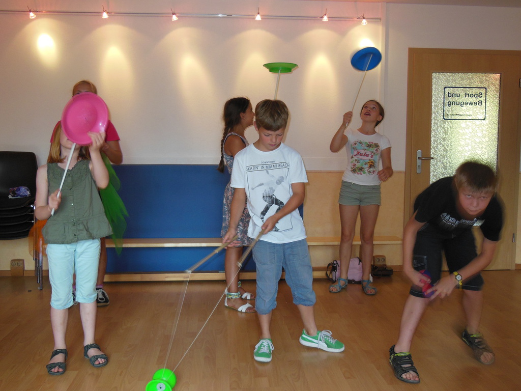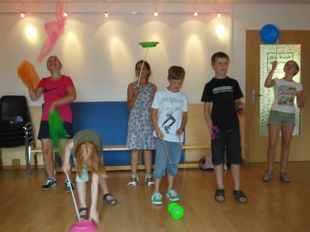 Zugegeben, aller Anfang ist schwer: Plumps – schon fällt der Ball zu Boden. Denn es ist gar nicht so leicht, mit zwei Händen drei Bälle in der Luft zu halten. Aber unsere Ferienkinder haben in einem 3-tägigen Jonglierkurs im Rahmen der Ferienspiele bewiesen, dass auch Jonglieren erlernbar ist. Angefangen mit Tüchern, welche langsamer fliegen als Bälle und sich somit auch leichter greifen lassen, konnten die Ferienkinder während der drei Tage nach und nach ihre Leistung steigern. Stück für Stück verbesserten die Kinder ihre Reaktionsfähigkeit sowie das Konzentrationsvermögen und Zusammenspiel von Augen und Händen. Mit den ersten Erfolgen, stellte sich auch die Motivation zur Fortsetzung des Trainings ein. Nach und nach stiegen die Kinder dann auch auf Bälle, Keulen und Sticks um und konnten erste Erfolge verzeichen. Wir sind uns sicher, dass ein Großteil der Ferienkinder zukünftig auch zuhause die erlernten Fähigkeiten weiter üben wird.