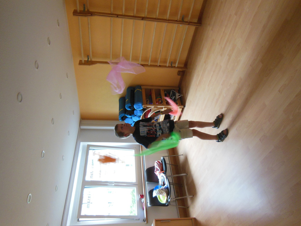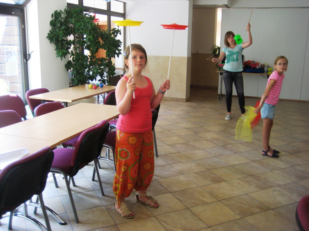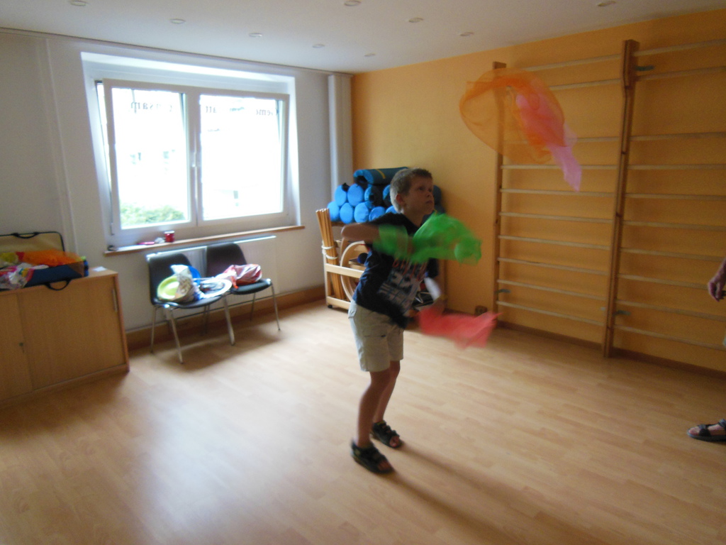 Beim ersten von drei Treffen des Jonglierkurs lernten die Kinder zunächst mit Hilfe von Tüchern und Bällen drei Gegenstände zu jonglieren. Zudem durften sie sich an weiteren Variationen und Requisiten wie dem Diabolo, Poi und Devilstick ausprobieren. Das spielerische Erlenen der Jonglage bereitete den Kindern nicht nur Freude, sondern ist auch positiv für die Motorik und eine beidseitige Hirnentwicklung, welche die kognitive Leistungsfähigkeit stärkt.
