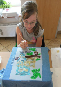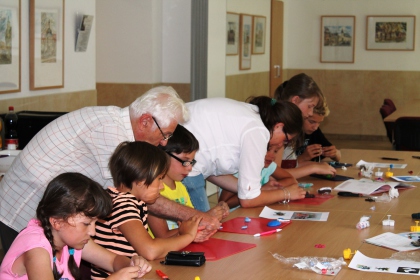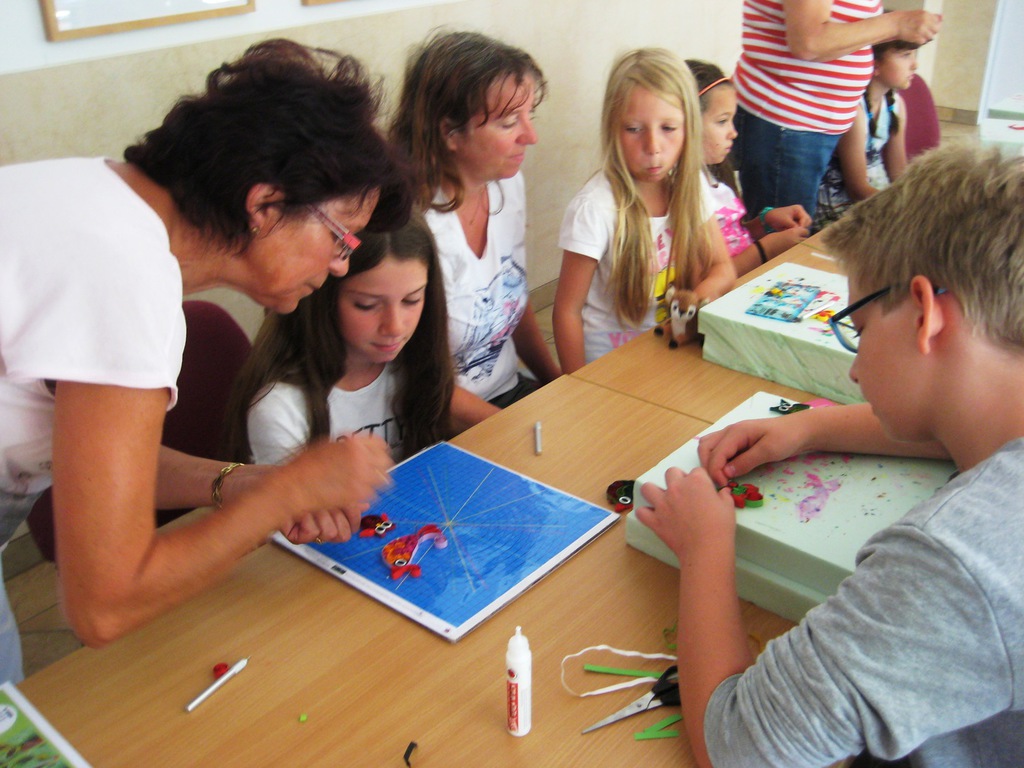 Quilling ist aktuell im Trend und dabei ist die alte Papiertechnik durchaus nicht neu. Erste Parallelen und Techniken sind bereits bei den alten Ägyptern zu erkennen. Ein Grund mehr, um die alte Papiertechnik auch im Rahmen der Ferienangebote im Jugend- und Altenhilfeverein einmal auszuprobieren. Mit liebevoller Unterstützung unserer Vereinsmitarbeiter und Senioren rollten und formten die Ferienkinder beim Quilling dünne Papierstreifen, welche sich durch Drehen in verschiedene Formen, wie z. B. Kreise, Tropfen, Blätter und Ranken, verwandelten. Die jeweiligen Enden der Papierstreifen wurden zum Schluss noch mit Kleber fixiert, so dass die Figuren ihre Form auch behielten. So entstanden relativ schnell hübsch anzusehende Blumen und Tiere.