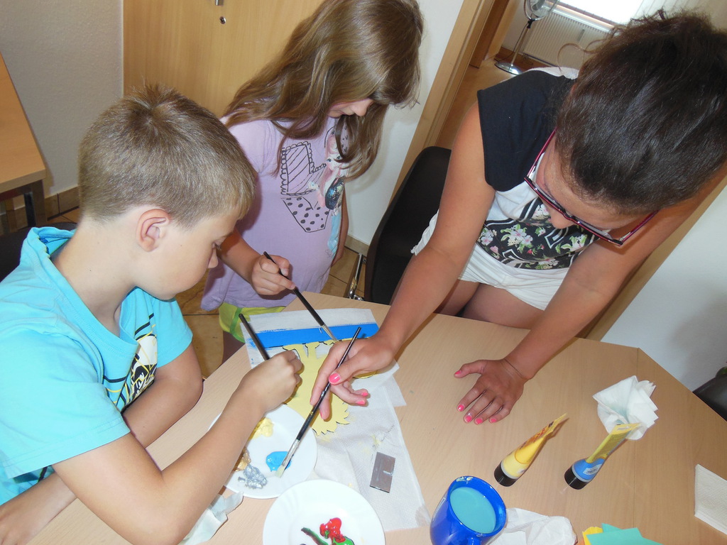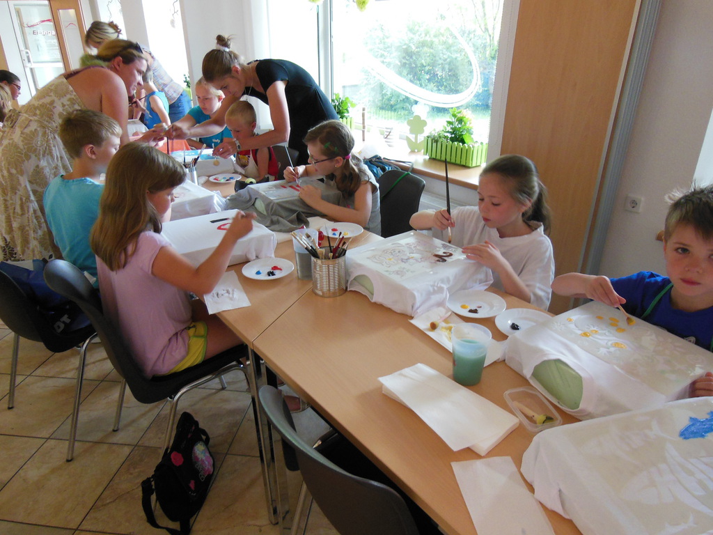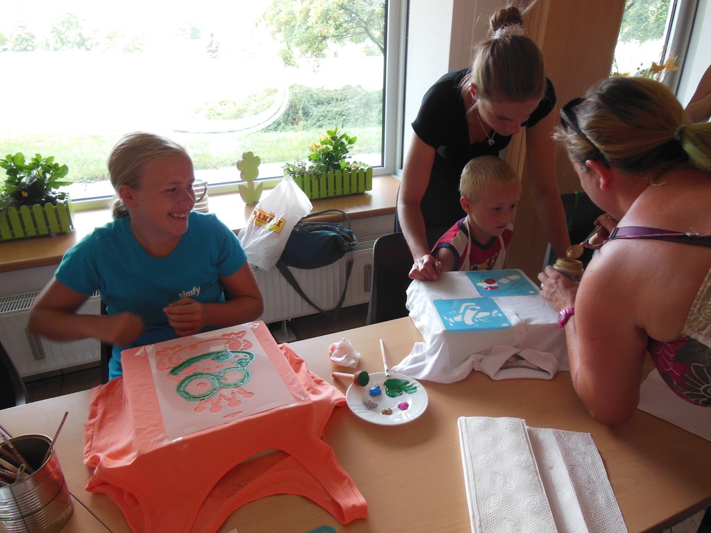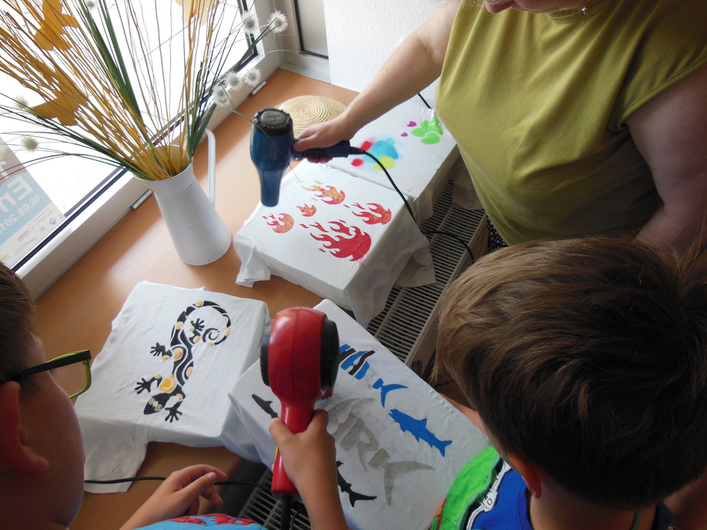 Mit einem selbst mitgebrachten hellem T-Shirt sowie vom Verein bereit gestellter Stofffarbe machten die Ferienkinder aus ihren alten langweiligen T-Shirts individuelle Designerstücke. Während der Großteil der Ferienkinder ihr T-Shirt mit Hilfe einer Schablone aufpeppte, bemalten manche Kinder ihr T-Shirt frei nach Belieben. So oder so bereitete das Gestalten der T-Shirts allen Freude. Wer keine Lust hatte ein T-Shirt zu bemalen, der konnte sich bei der vom Jugendamt der Stadt Leipzig initiierten kreativen Gestaltung von Jubiläums-Löwen zum Thema „1000 Jahre Leipzig“ beteiligen. Die Kinder gaben sich viel Mühe und sind nun gespannt, ob sie bei der Prämierung dabei sind.