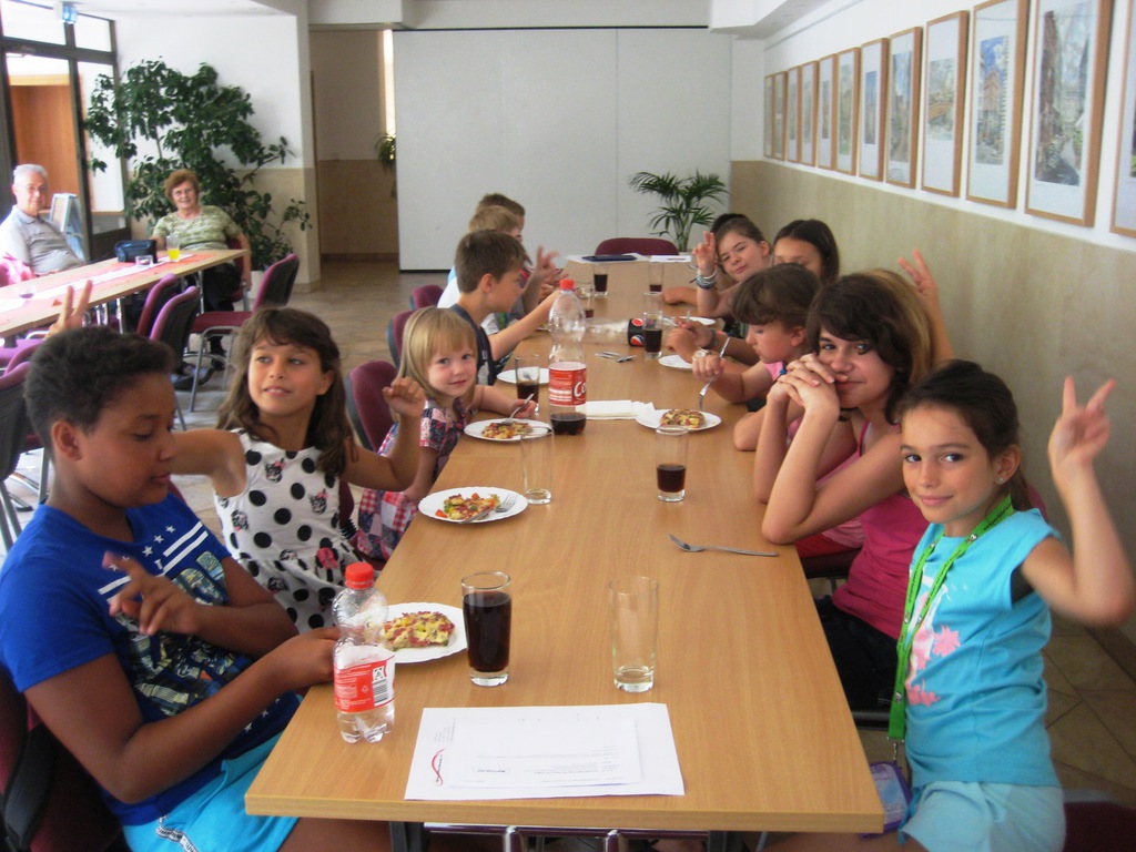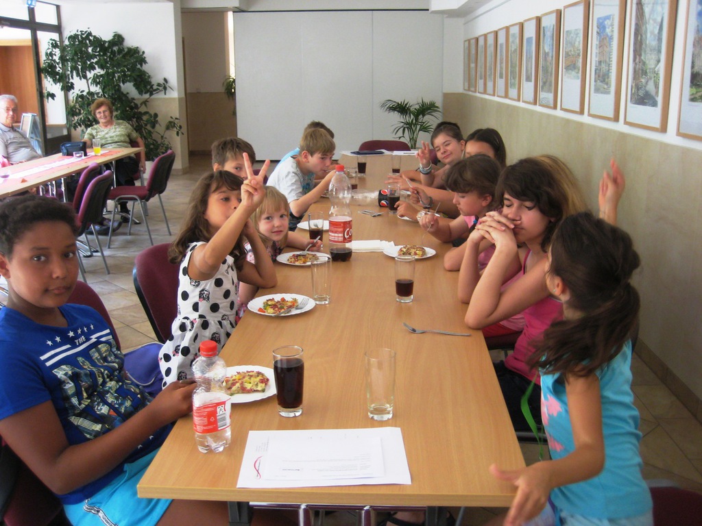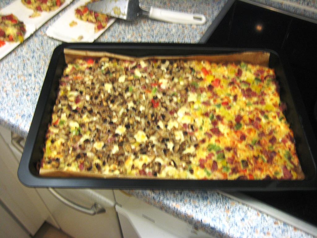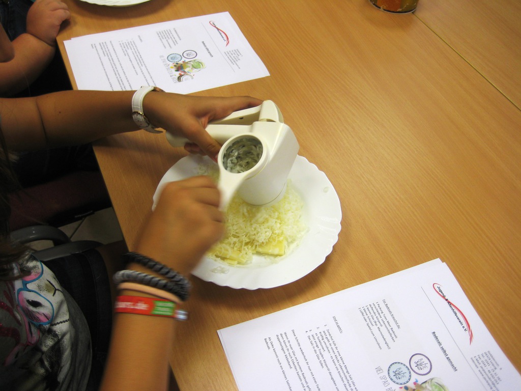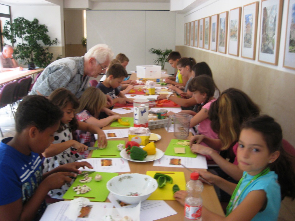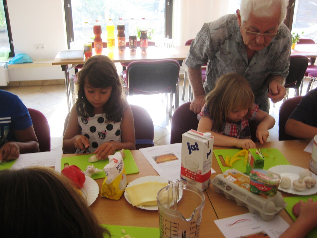 Pizza kennt jeder und es gibt unzählige Rezepte. Besonders beliebt und seit vielen Jahren in unserem Ferienprogramm ist die „Schüttelpizza“, die schnell und gemeinsam von vielen zubereitet werden kann. Die Zutaten sind variabel, man kann die Paprika durch Tomaten oder Zucchini ersetzen und auch mal verschiedene Käsesorten probieren. Für Salami kann auch Schinken oder andere Wurst verwendet werden und wer keine Wurst mag, lässt sie weg. So entstehen ohne Mühe leckere Rezepte und im Ergebnis wohlschmeckende Pizzen. Alles kleingeschnitten, in großer Schüssel durchgeschüttelt, aufs Backblech und dann in den Ofen gegeben, fertig ist die Pizza. Die Kinder ließen es sich noch gemeinsam schmecken und auch eine Kostprobe für Zuhause konnte mitgenommen werden.