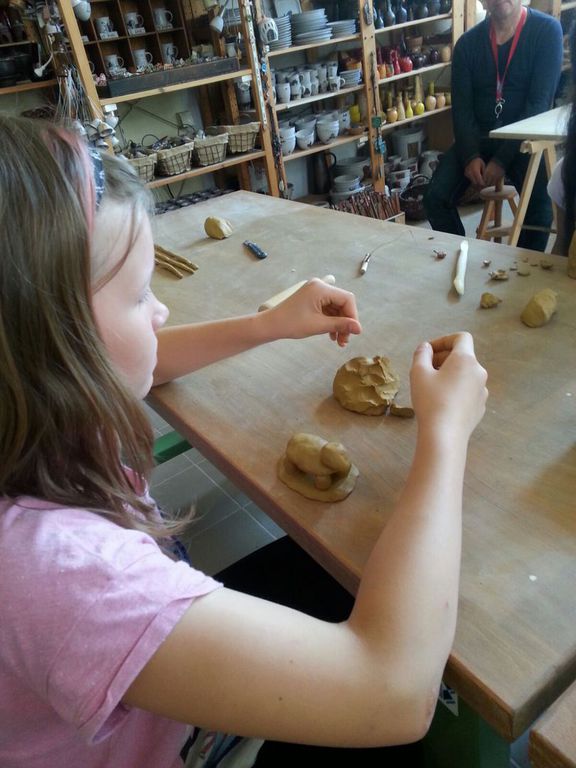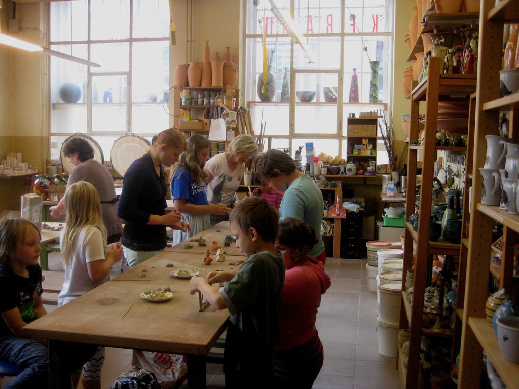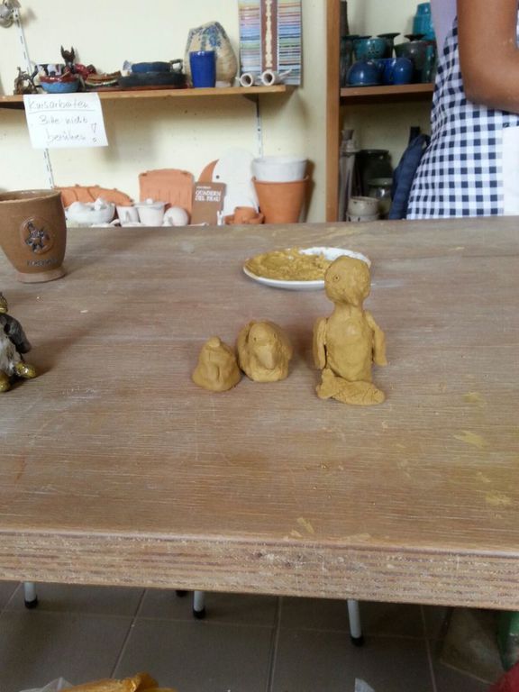 Mit Knete und Ton gestalten ist immer ein beliebtes Thema. So konnten wir interessierten Kindern mit den vereinseigenen Fahrzeug ein besonderes Erlebnis verschaffen, denn wir besuchten gemeinsam die Keramikwerkstatt „Andrea Doria“ auf dem Gelände Spinnereistraße in Leipzig. Zum Thema Tiere fiel den Kindern so allerlei ein und ohne große Pause wurde geknetet und geformt. Die Figuren bleiben jetzt ein paar Tage zum Trocknen in der Werkstatt und werden dann auch noch gebrannt. Später kann man sich auch dort noch zum farbigen Gestalten anmelden oder man nimmt zuhause Acrylfarbe und malt seine Figuren noch an. Ringsum gab es verschiedene Anregungen aus anderen Kursen zu betrachten, denn auch außerhalb der Ferien kann man in der Keramikwerkstatt seine kreativen Möglichkeiten testen.