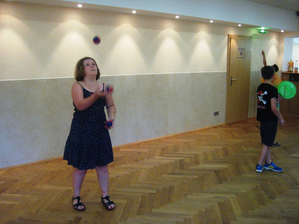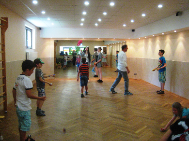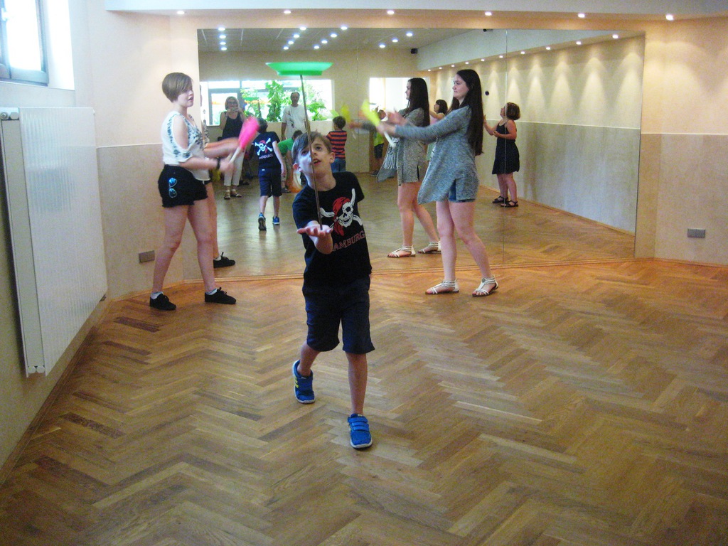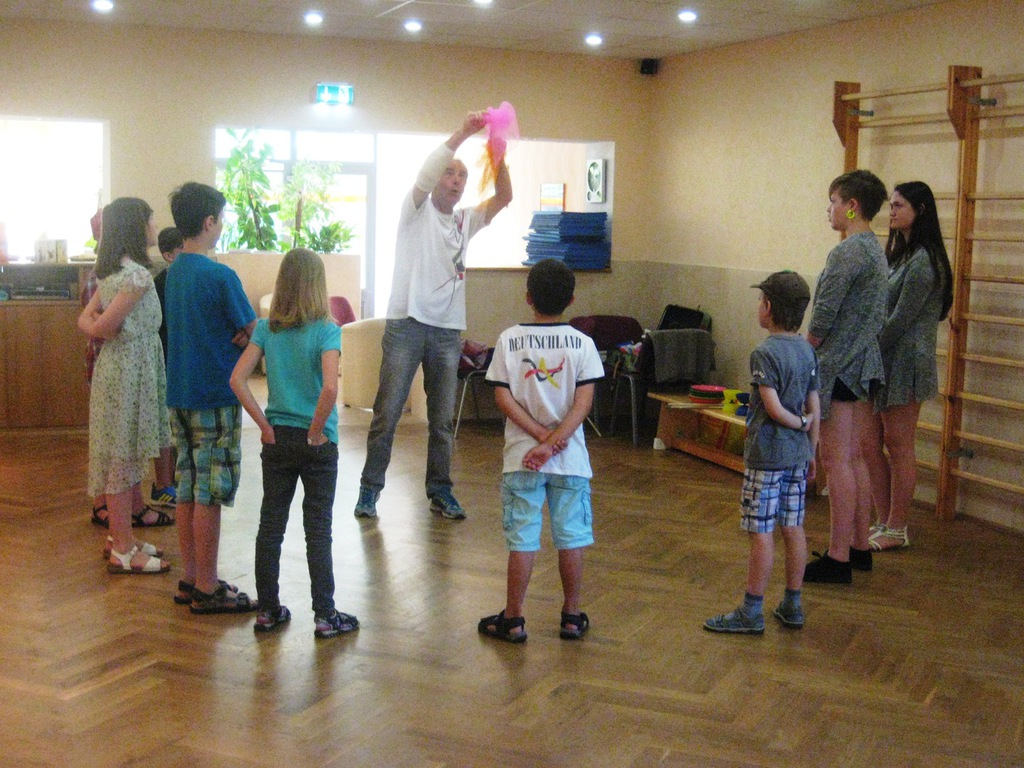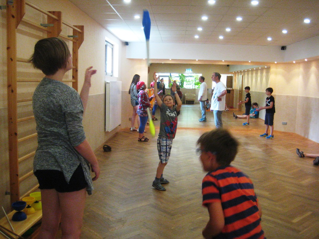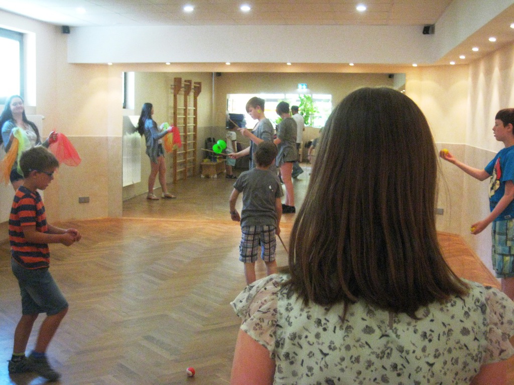 Geplant als 3-tägiger Workshop zog der Kurs auch in diesem Jahr viele Kinder in unsere Räumlichkeiten. Trotz des hervorragenden Badewetters übten alle fleißig mit verschiedenen Materialien. Einige waren im vergangenen Jahr schon dabei und zeigten, was sie inzwischen gelernt haben. Michael Fritzsche, der im Verein bereits über Jahre eine Vielzahl von Veranstaltungen gestaltete, hat mit viel Liebe, Geduld und besonderem Geschick für die Möglichkeiten der Kinder wieder alle motiviert, sich vielfältig auszuprobieren. Ob Tücher, Teller oder Keulen, es fand sich für jeden ein passendes Zubehör. Kleine Pausen zum Verschnaufen wurden eingelegt und nach einem Snack mit frischem Obst, Chips und Limonade ging es gestärkt weiter. Mal sehen, ob wir Miki, alias Michael Fritzsche für das nächste Jahr wieder gewinnen können.