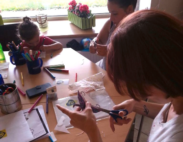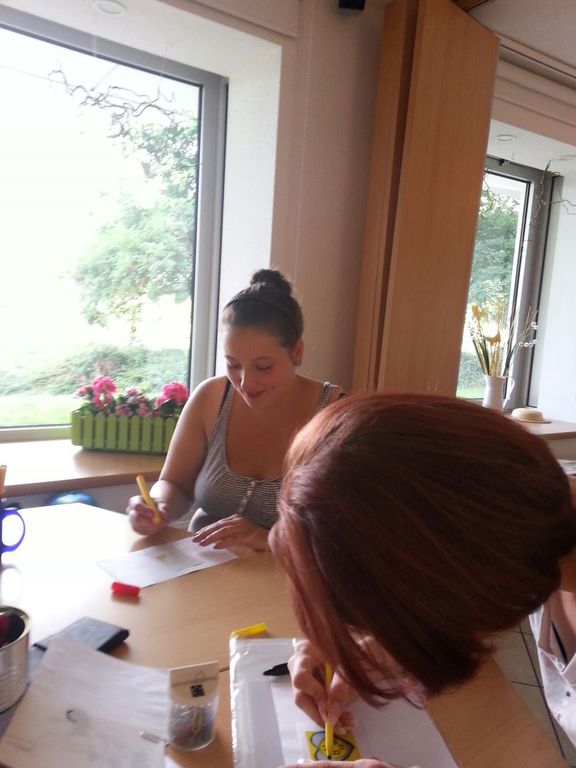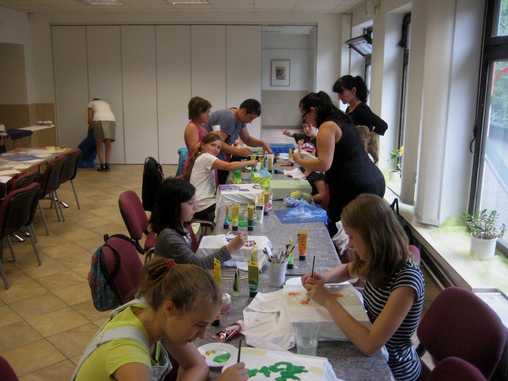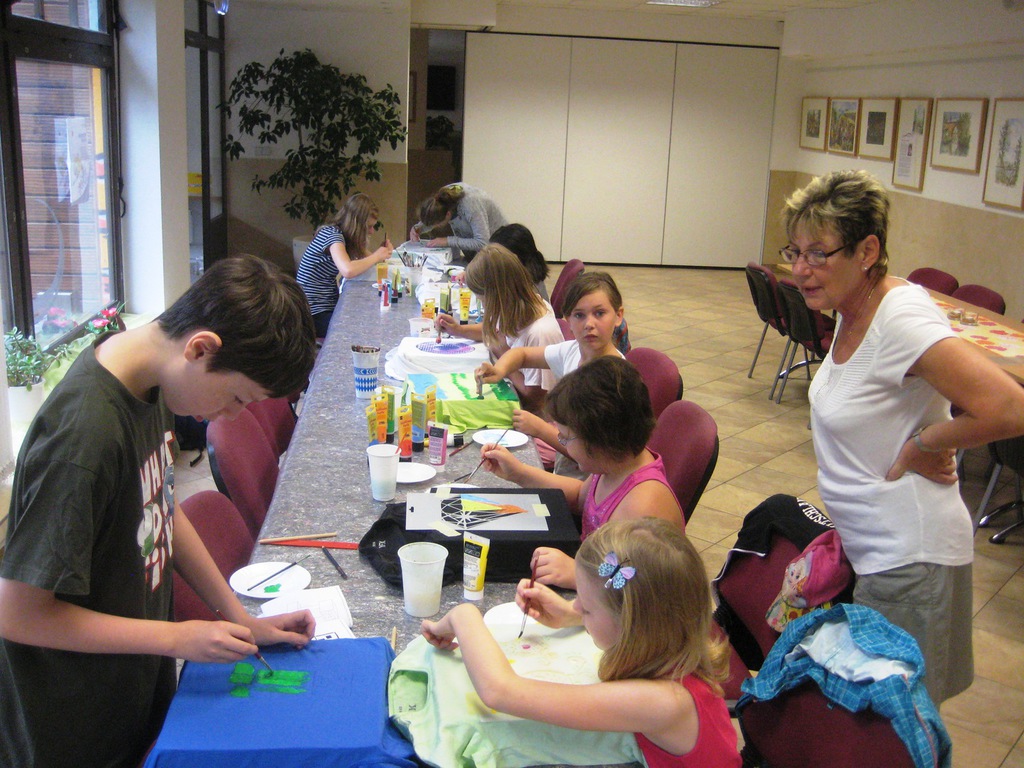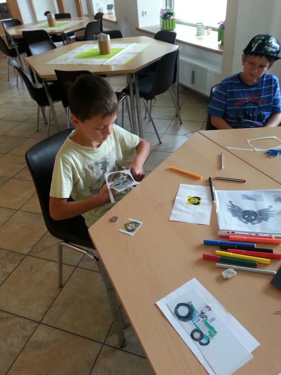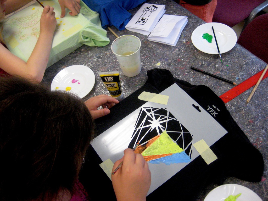 Das Bemalen von T-Shirts praktizieren wir seit vielen Jahren im Ferienangebot und man staunt, welche Ideen und Muster bei den Kindern immer wieder neu umgesetzt werden. Unterschiedlich geschickt, aber vor allem mit viel Freude machten sich die Kinder ans Werk und die Ergebnisse waren sehr vielseitig. Neben der kreativen Seite hatte dieses Angebot auch praktische Effekte, denn die T-Shirts müssen zur Versiegelung der Farben gebügelt werden. Nur wenige Kinder in dem Alter hatten schon einmal gebügelt und vor allem musste aufgepasst werden, dass man sich nicht am heißen Dampf verbrennt. Mit Unterstützung der Mitarbeiterinnen des Vereins gelang auch diese sehr gut und stolz wurden die Ergebnisse präsentiert.