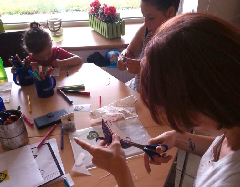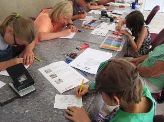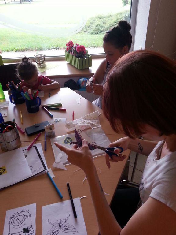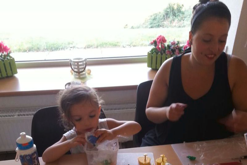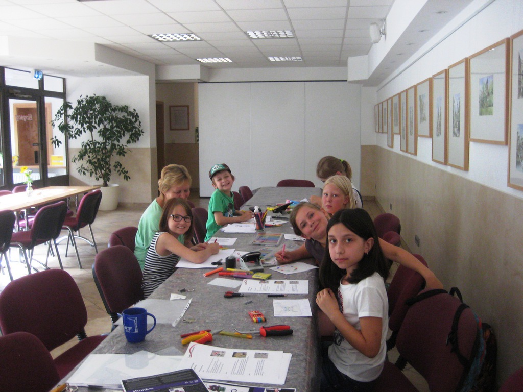 Mit Geschick und vielfältigen Ideen gestalteten die Ferien-kinder auch in Paunsdorf Schlüsselanhänger aus Schrumpffolie. Es wurden eigene Ideen oder nach Vorlagen Muster auf die Folie übertragen und farbig nach dem jeweiligen Geschmack bemalt. Eine relativ einfache Sache, die trotzdem Konzentration und Geduld erforderte. Unsere Objektleiterin Claudia Förtsch, die zur Zeit den Nachwuchs in Elternzeit betreut, unterstützte gern die Kinder bei der Umsetzung ihrer Ideen. Auch Baby Lieselotte mit inzwischen einem Alter von 10 Monaten schaute interessiert in den Backofen, in dem die Folie durch erhitzen auf die Hälfte geschrumpft wurde und die Farben dann richtig zur Geltung kamen.