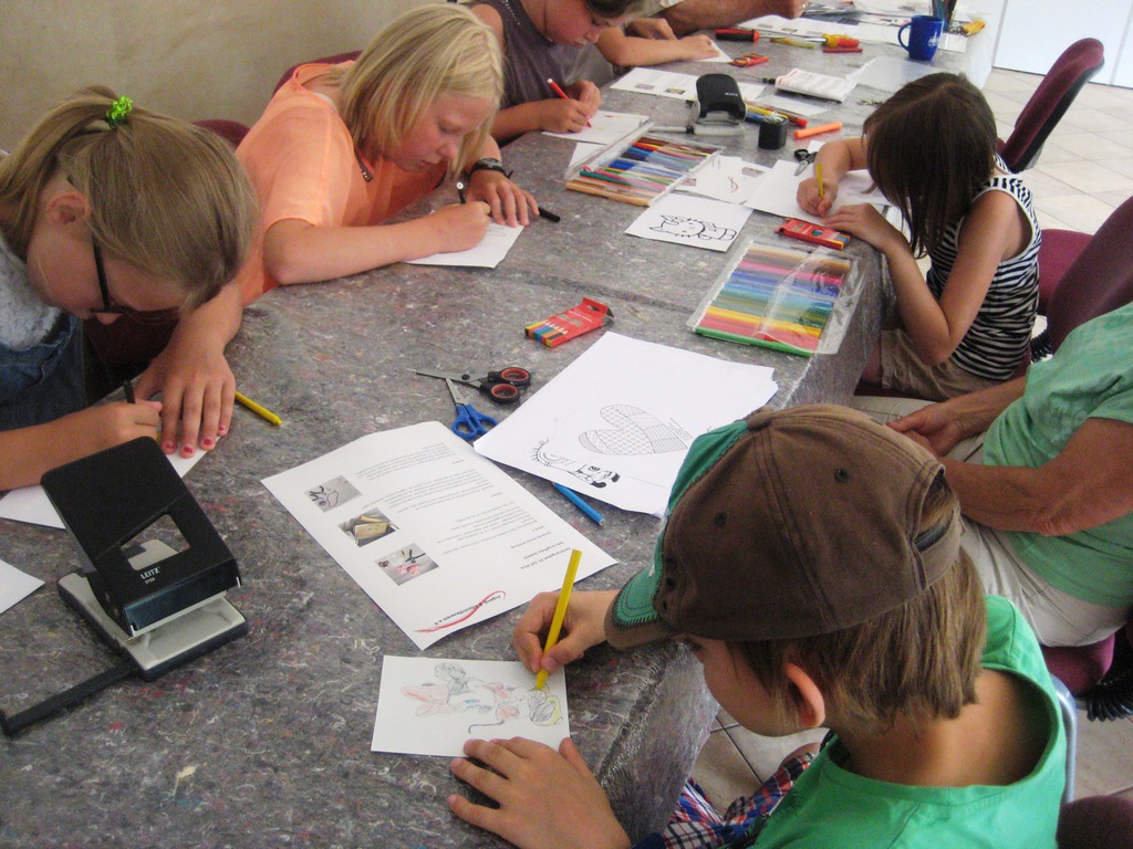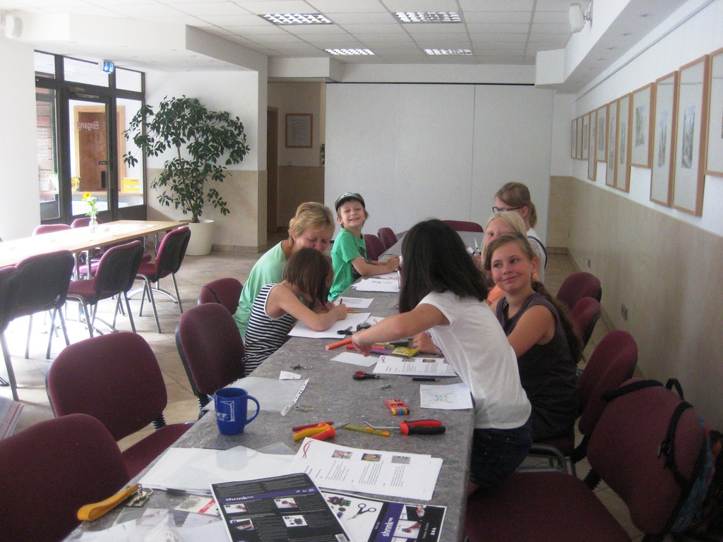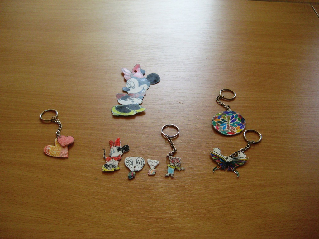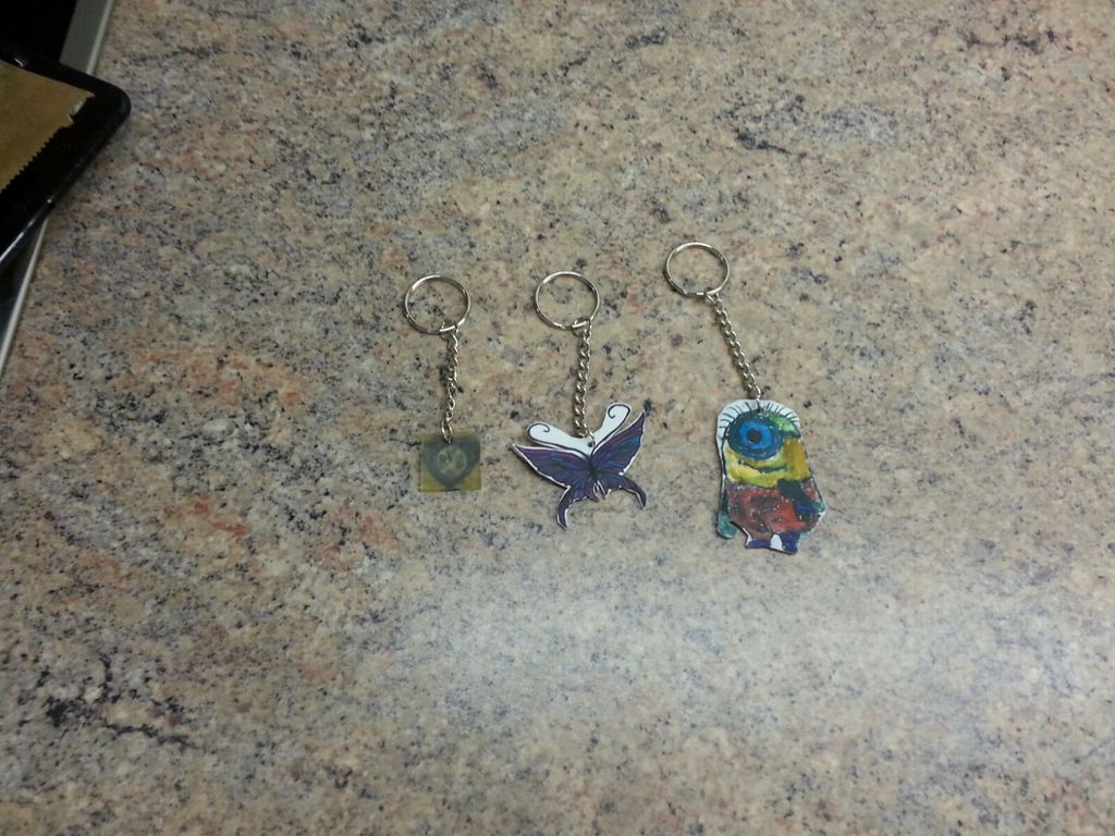 Aus Schrumpffolie lassen sich relativ einfach wunderschöne Schlüssel-anhänger realisieren. Zuerst zeichneten die Ferienkinder auf die raue Seite der Schrumpffolie ein Motiv und malten es aus. Da die Schrumpffolie durchsichtig ist, konnten die Kinder auch einfach ein beliebiges Motiv durch-pausen. Zum Schluss wurde das Motiv noch ausgeschnitten und gelocht. Danach wurden die fertig gestalteten Anhänger im Backofen mit der rauen Seite nach oben in den Backofen gelegt, so dass sich die Schrumpffolie zusammenzieht. Danach mussten die Anhänger nur noch abkühlen und fertig waren individuellen Schlüsselanhänger!