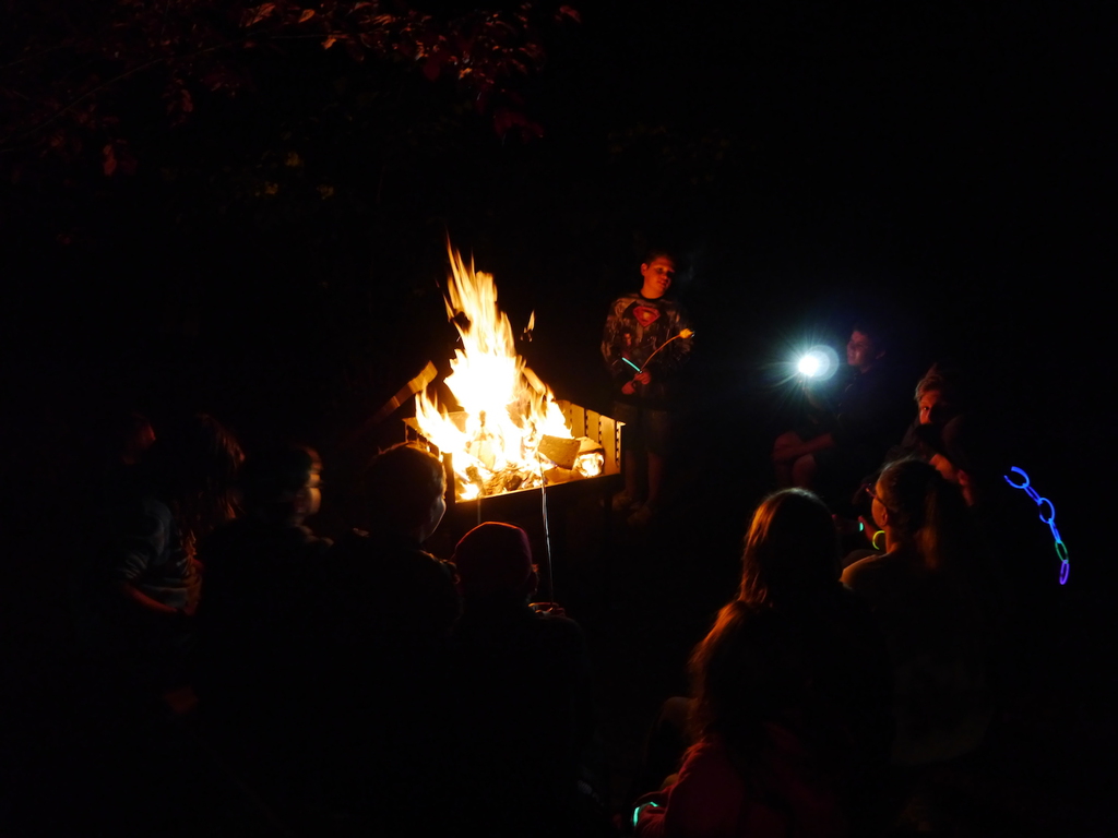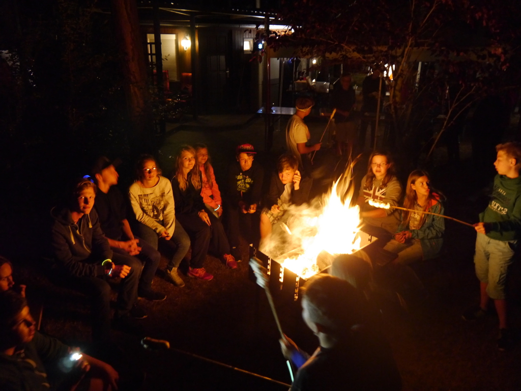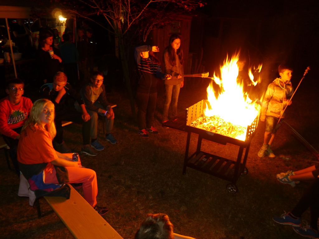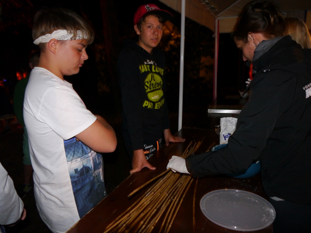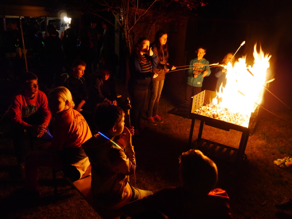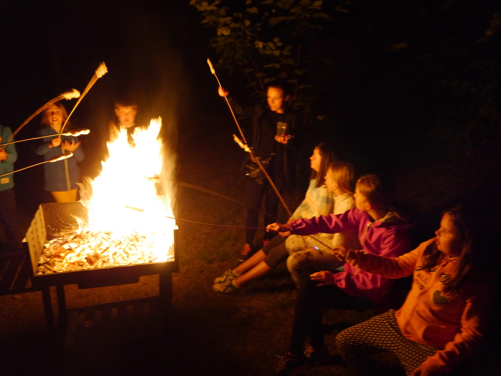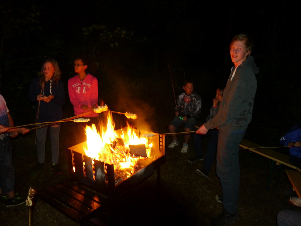 Am Abend war jedoch noch einmal Action angesagt, denn die von den Kindern lang ersehnte Nachtwanderung stand an. In drei kleinen Grüppchen begaben sich die Kinder in Begleitung eines Betreuers in tiefster Dunkelheit einem bislang ungelöstem Rätsel auf die Spur. Ein Knacken hier – ein Wasserspritzer da und ein im Nebelrauch gruselig spukende Geisterseele erschwerten den Weg durch den finsteren Wald. Mit plötzlich einsetzendem Wolfsgeheul und einem aus dem Gebüsch kommenden Wolf erreichte die Nachtwanderung schließlich ihren Höhepunkt. Nach der abenteuerlichen Nachtwanderung wurden die Kinder schließlich mit einem flackernden Lagerfeuer und Stockbrot im Camp empfangen. Während die Kinder noch alle aufgeregt von der Nachtwanderung erzählten, erhielten sie plötzlich von unserem 8-köpfigen Helfer-Team besuch, welches den Jugend- und Altenhilfeverein tatkräftig beim Spuken und Gruseln im Wald unterstützt hatte. Nachdem die Kinder sich in Ruhe mit unseren Helfen sowie mit dem verkleideten Geist und Wolf unterhalten konnten, wurde alles klar, dass alle Geschehnisse im Wald extra inszeniert wurden und sie nun ruhigen Gewissens in ihren Zelten schlafen können.