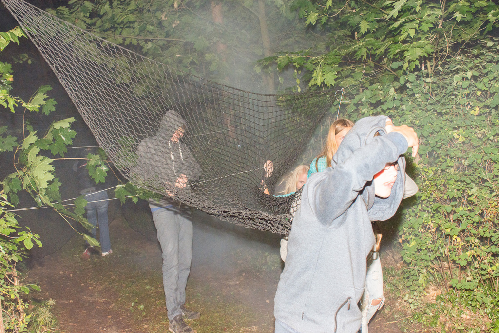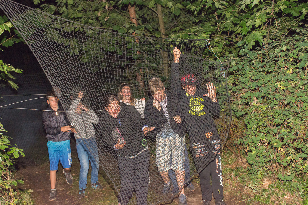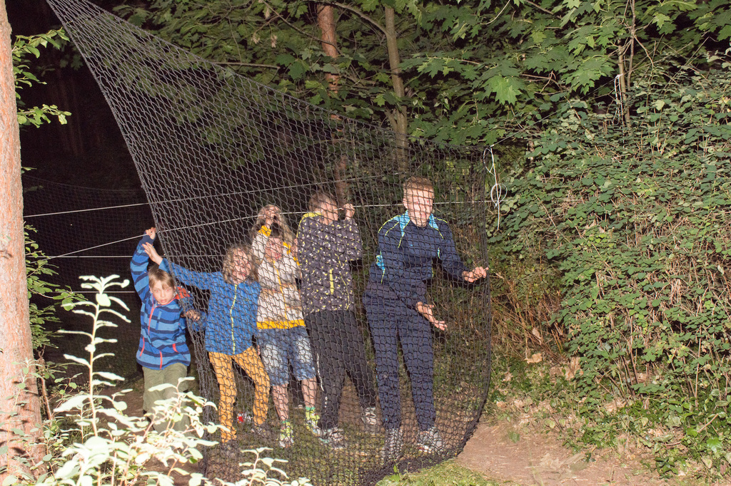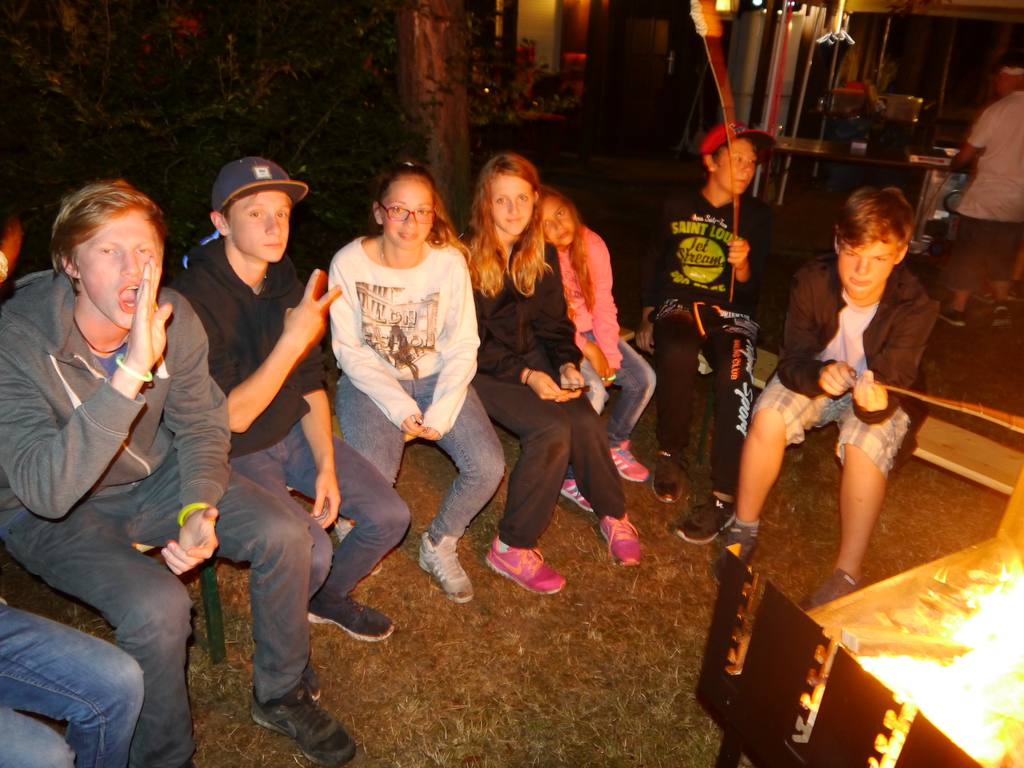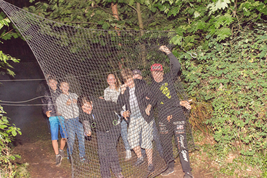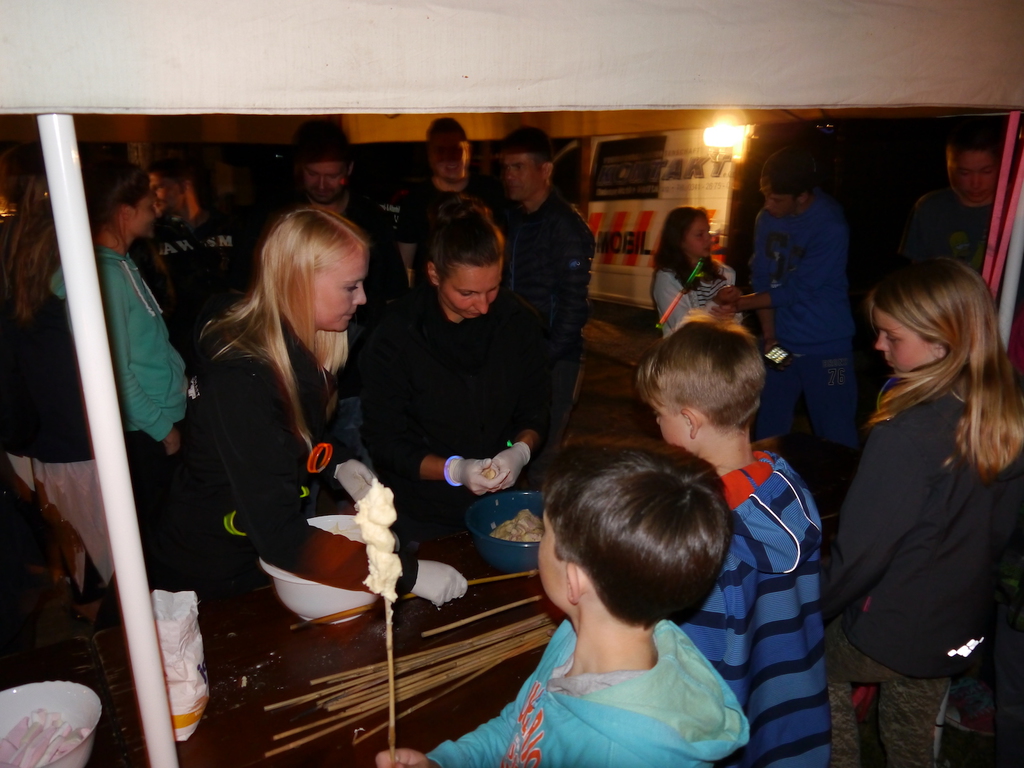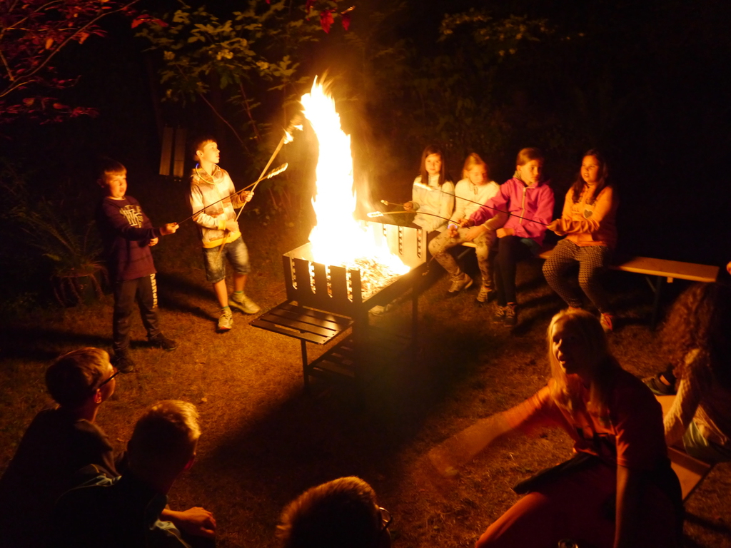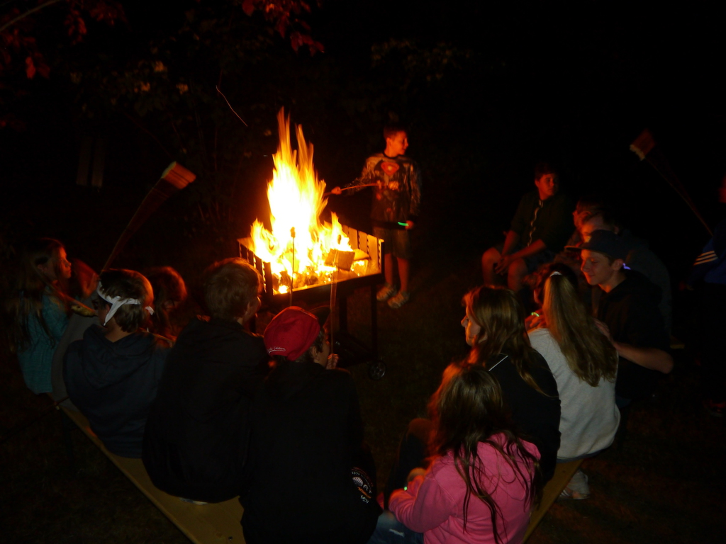 Am Abend war jedoch noch einmal Action angesagt, denn die von den Kindern lang ersehnte Nachtwanderung stand an. In drei kleinen Grüppchen begaben sich die Kinder in Begleitung eines Betreuers in tiefster Dunkelheit einem bislang ungelöstem Rätsel auf die Spur. Ein Knacken hier – ein Wasserspritzer da und ein im Nebelrauch gruselig spukende Geisterseele erschwerten den Weg durch den finsteren Wald. Mit plötzlich einsetzendem Wolfsgeheul und einem aus dem Gebüsch kommenden Wolf erreichte die Nachtwanderung schließlich ihren Höhepunkt. Nach der abenteuerlichen Nachtwanderung wurden die Kinder schließlich mit einem flackernden Lagerfeuer und Stockbrot im Camp empfangen. Während die Kinder noch alle aufgeregt von der Nachtwanderung erzählten, erhielten sie plötzlich von unserem 8-köpfigen Helfer-Team besuch, welches den Jugend- und Altenhilfeverein tatkräftig beim Spuken und Gruseln im Wald unterstützt hatte. Nachdem die Kinder sich in Ruhe mit unseren Helfen sowie mit dem verkleideten Geist und Wolf unterhalten konnten, wurde alles klar, dass alle Geschehnisse im Wald extra inszeniert wurden und sie nun ruhigen Gewissens in ihren Zelten schlafen können.
