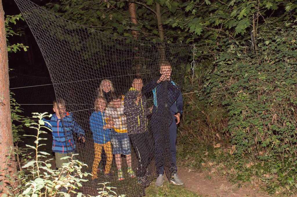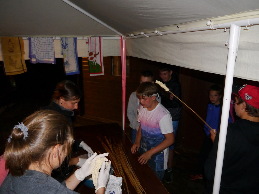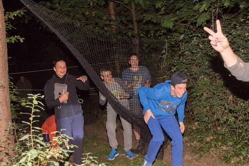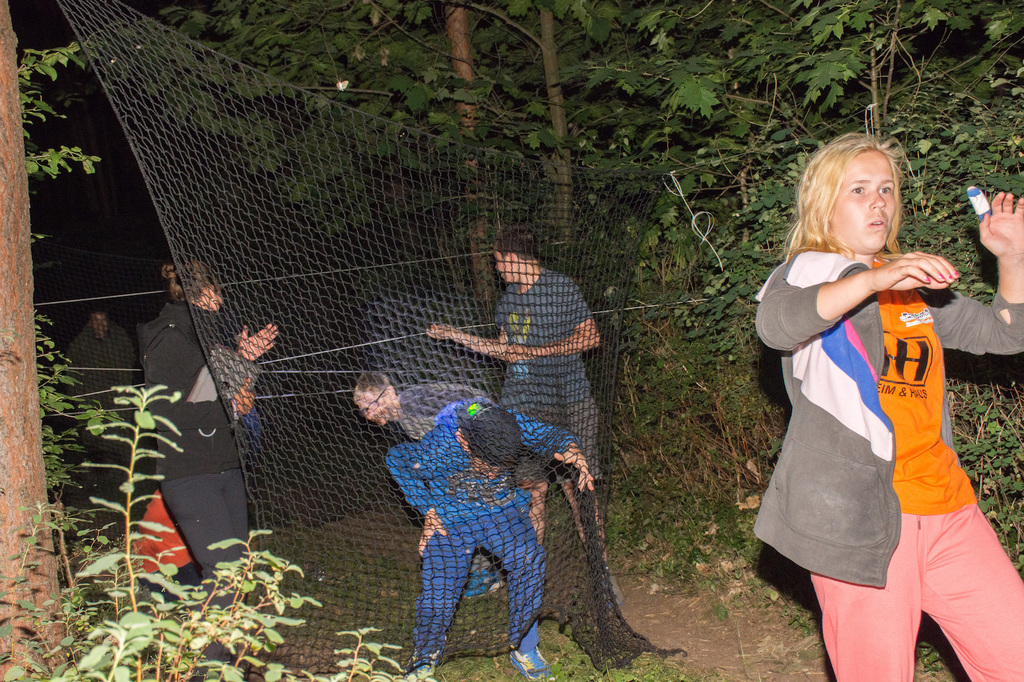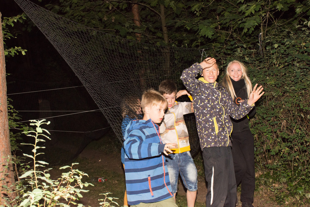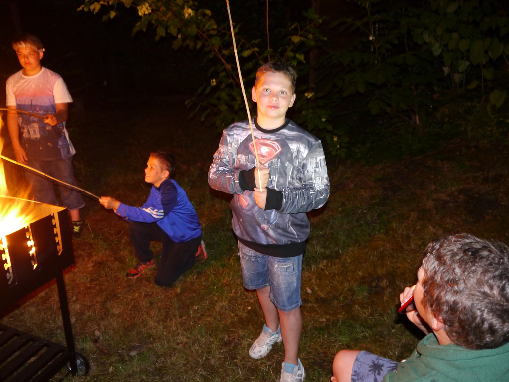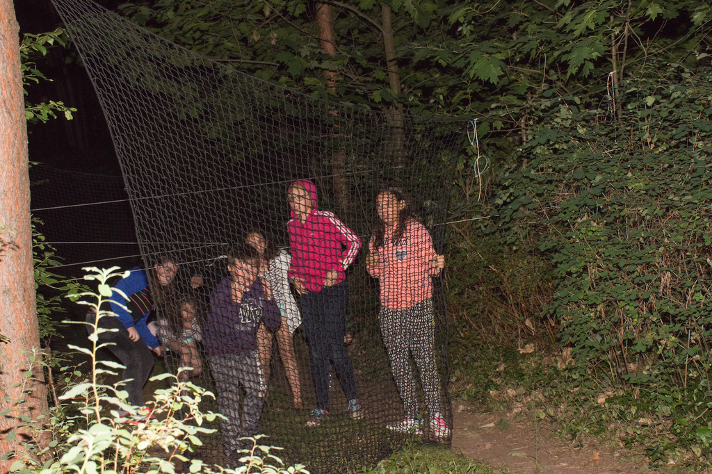 Am Abend war jedoch noch einmal Action angesagt, denn die von den Kindern lang ersehnte Nachtwanderung stand an. In drei kleinen Grüppchen begaben sich die Kinder in Begleitung eines Betreuers in tiefster Dunkelheit einem bislang ungelöstem Rätsel auf die Spur. Ein Knacken hier – ein Wasserspritzer da und ein im Nebelrauch gruselig spukende Geisterseele erschwerten den Weg durch den finsteren Wald. Mit plötzlich einsetzendem Wolfsgeheul und einem aus dem Gebüsch kommenden Wolf erreichte die Nachtwanderung schließlich ihren Höhepunkt. Nach der abenteuerlichen Nachtwanderung wurden die Kinder schließlich mit einem flackernden Lagerfeuer und Stockbrot im Camp empfangen. Während die Kinder noch alle aufgeregt von der Nachtwanderung erzählten, erhielten sie plötzlich von unserem 8-köpfigen Helfer-Team besuch, welches den Jugend- und Altenhilfeverein tatkräftig beim Spuken und Gruseln im Wald unterstützt hatte. Nachdem die Kinder sich in Ruhe mit unseren Helfen sowie mit dem verkleideten Geist und Wolf unterhalten konnten, wurde alles klar, dass alle Geschehnisse im Wald extra inszeniert wurden und sie nun ruhigen Gewissens in ihren Zelten schlafen können.