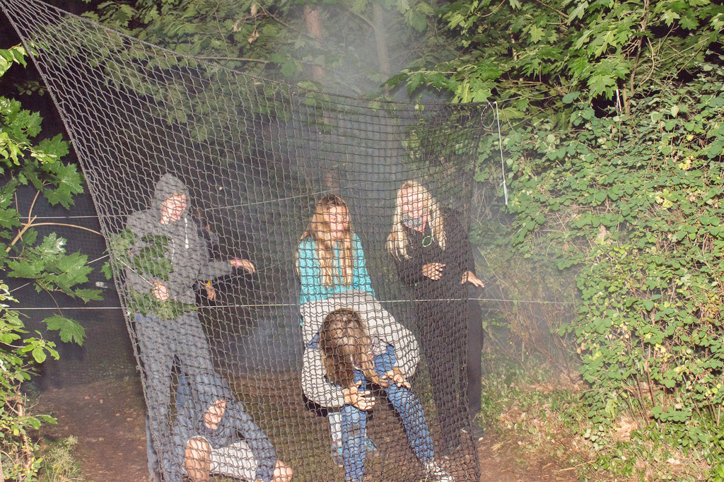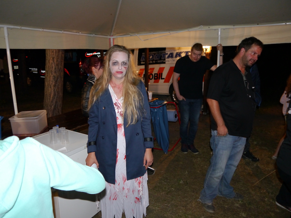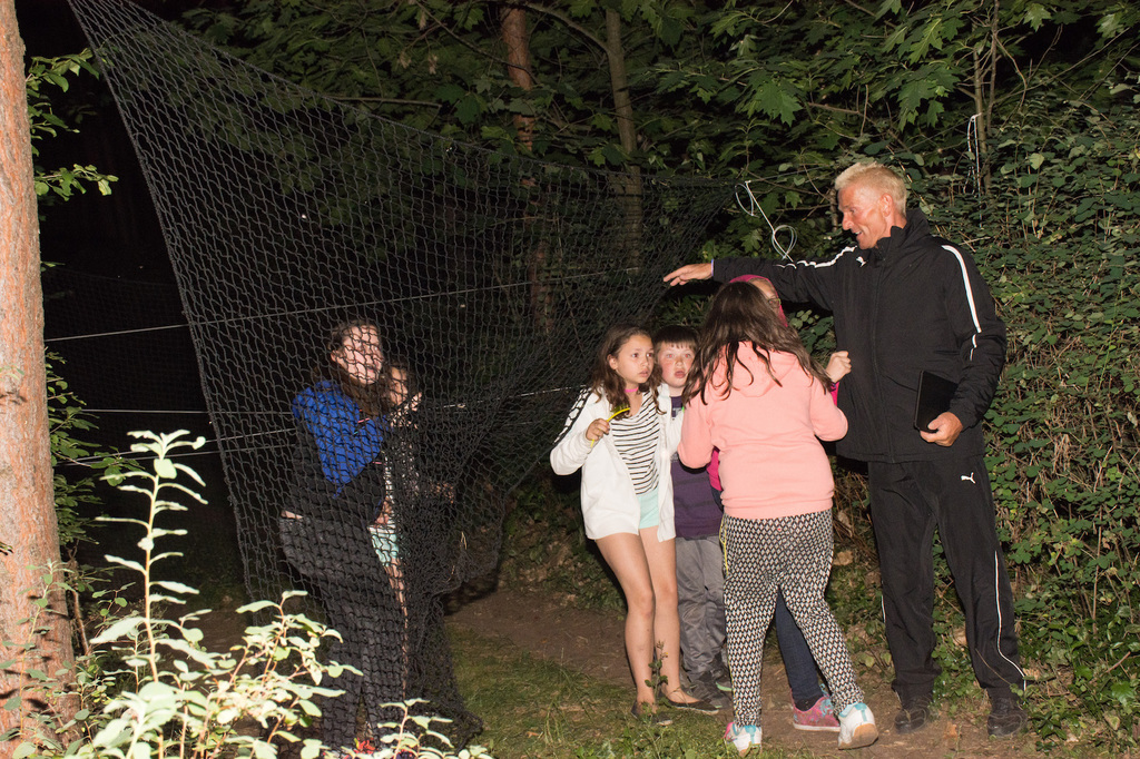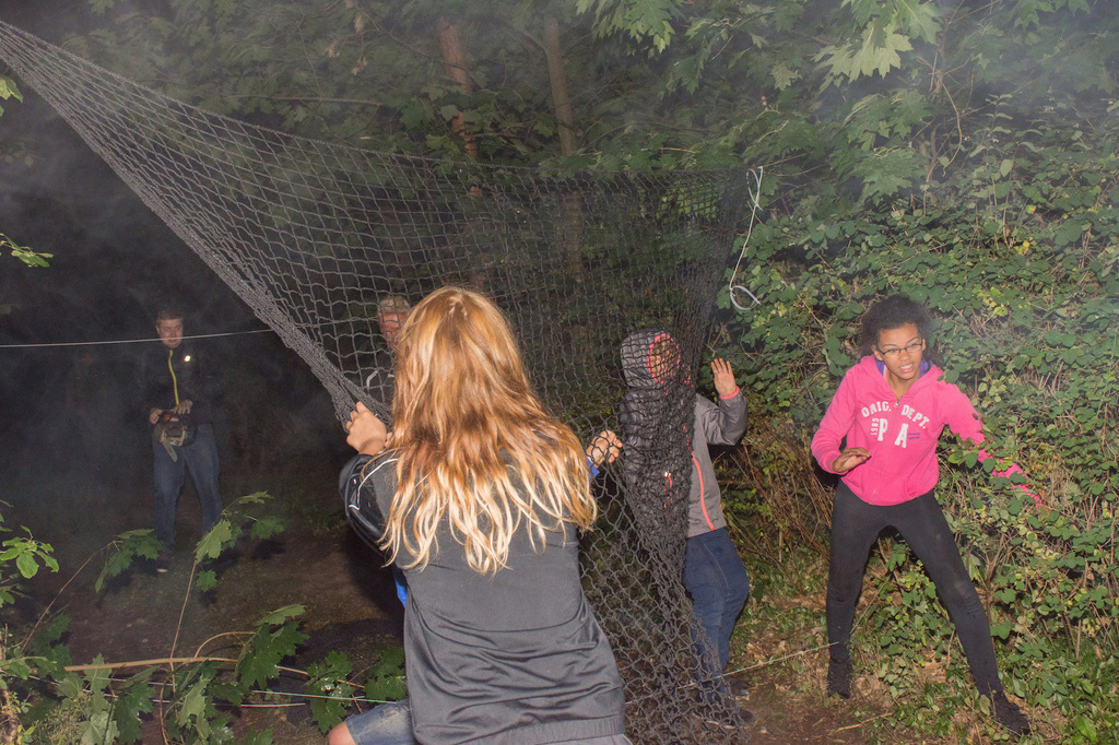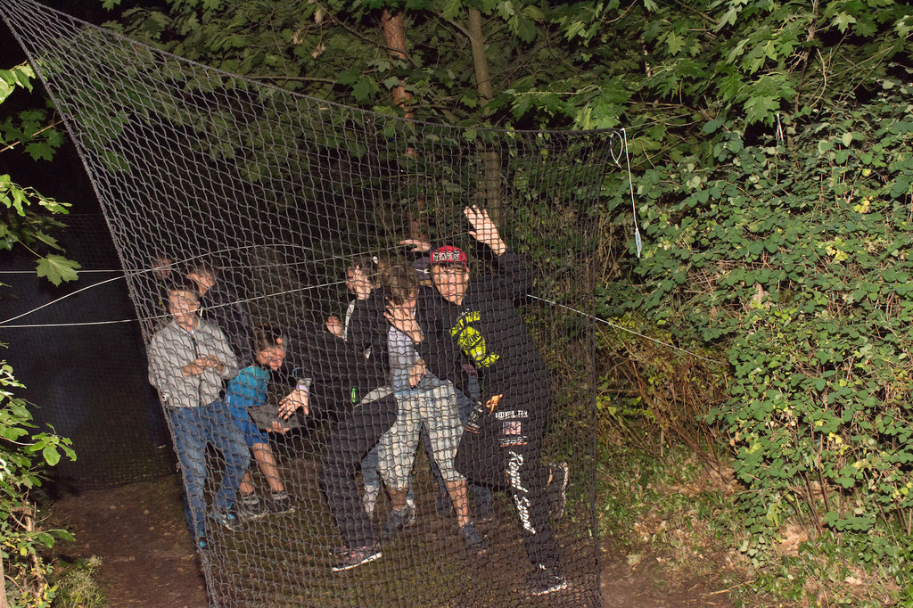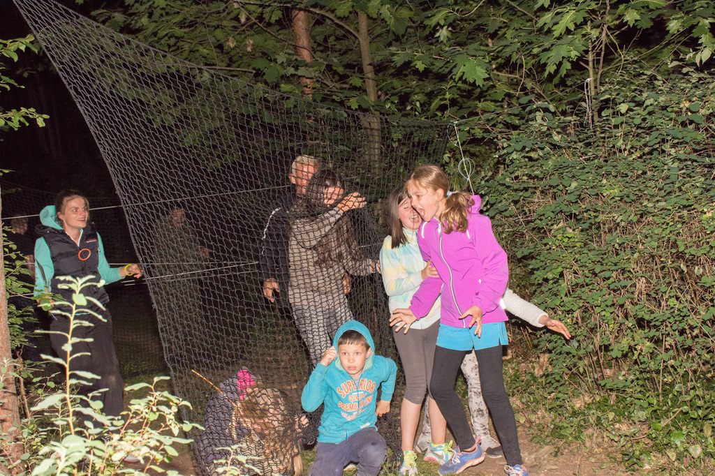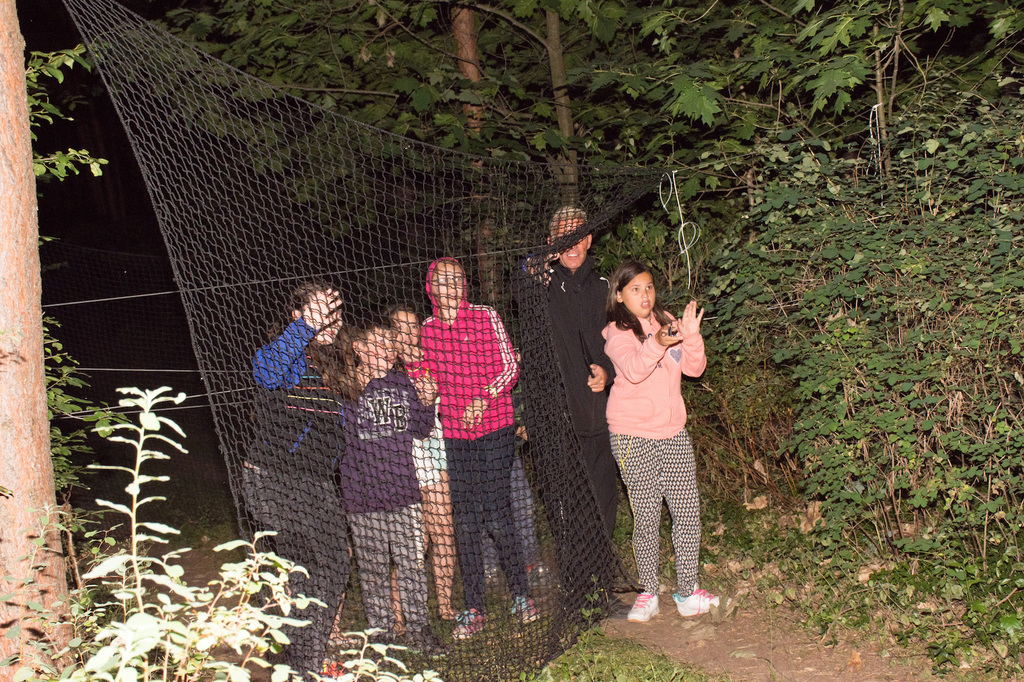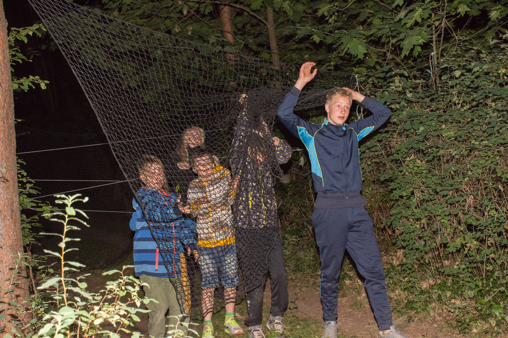 Am Abend war jedoch noch einmal Action angesagt, denn die von den Kindern lang ersehnte Nachtwanderung stand an. In drei kleinen Grüppchen begaben sich die Kinder in Begleitung eines Betreuers in tiefster Dunkelheit einem bislang ungelöstem Rätsel auf die Spur. Ein Knacken hier – ein Wasserspritzer da und ein im Nebelrauch gruselig spukende Geisterseele erschwerten den Weg durch den finsteren Wald. Mit plötzlich einsetzendem Wolfsgeheul und einem aus dem Gebüsch kommenden Wolf erreichte die Nachtwanderung schließlich ihren Höhepunkt. Nach der abenteuerlichen Nachtwanderung wurden die Kinder schließlich mit einem flackernden Lagerfeuer und Stockbrot im Camp empfangen. Während die Kinder noch alle aufgeregt von der Nachtwanderung erzählten, erhielten sie plötzlich von unserem 8-köpfigen Helfer-Team besuch, welches den Jugend- und Altenhilfeverein tatkräftig beim Spuken und Gruseln im Wald unterstützt hatte. Nachdem die Kinder sich in Ruhe mit unseren Helfen sowie mit dem verkleideten Geist und Wolf unterhalten konnten, wurde alles klar, dass alle Geschehnisse im Wald extra inszeniert wurden und sie nun ruhigen Gewissens in ihren Zelten schlafen können.