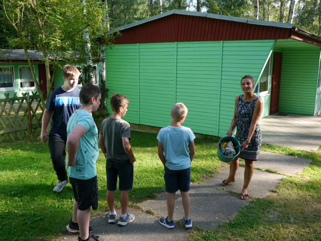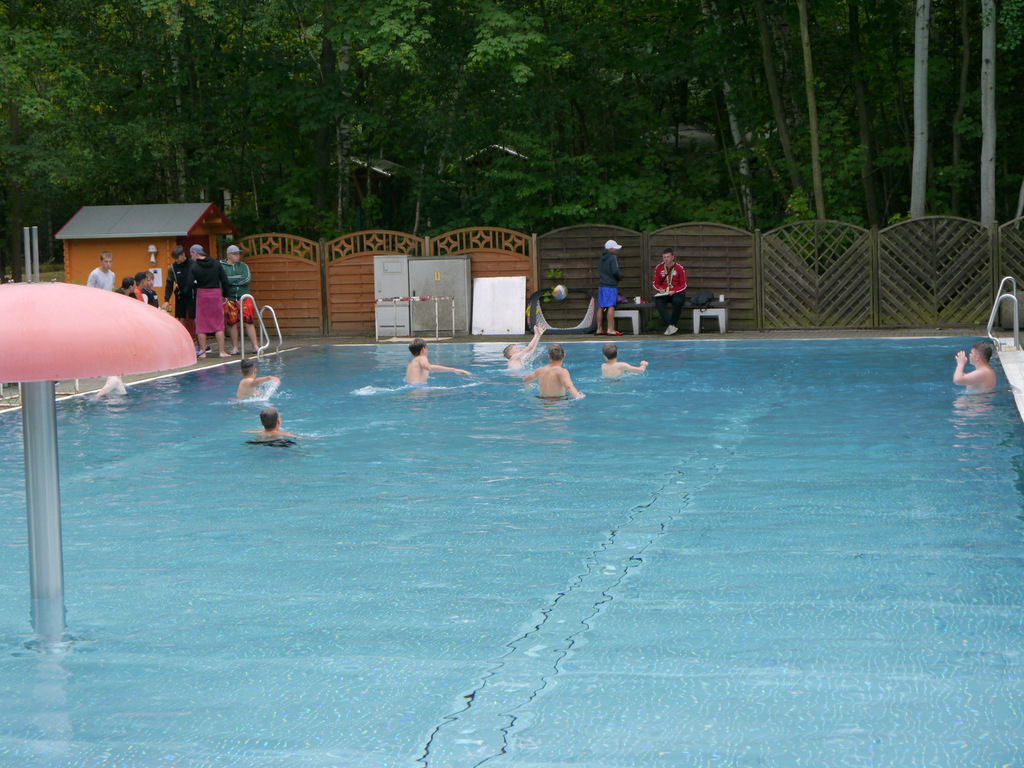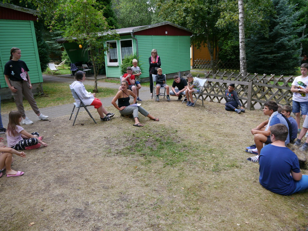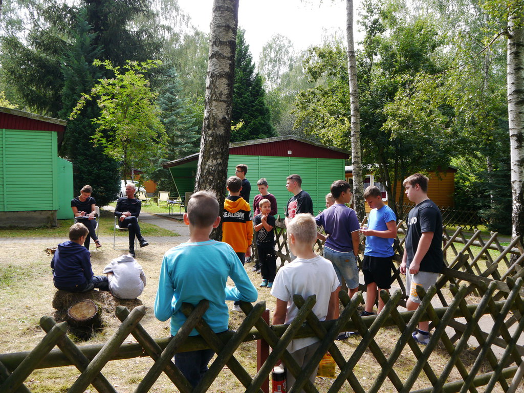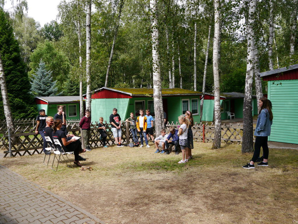Am Montagmorgen (03.08.) trafen wir uns alle in den Räumlichkeiten des Jugend- und Altenhilfevereins und verabschiedeten uns von den Eltern. Nach einer ca. einstündigen Busfahrt waren wir auch schon angekommen und erkundeten erstmal die Gegend. Inmitten eines Waldgebietes im landschaftlich schönen Vorerzgebirge bietet das Feriendorf neben komfortablen Unterkünften viele verschiedene Spiel- und Sportmöglichkeiten. Das haben wir direkt genutzt und am Nachmittag schon mal das Camp eigene Freibad unsicher gemacht.