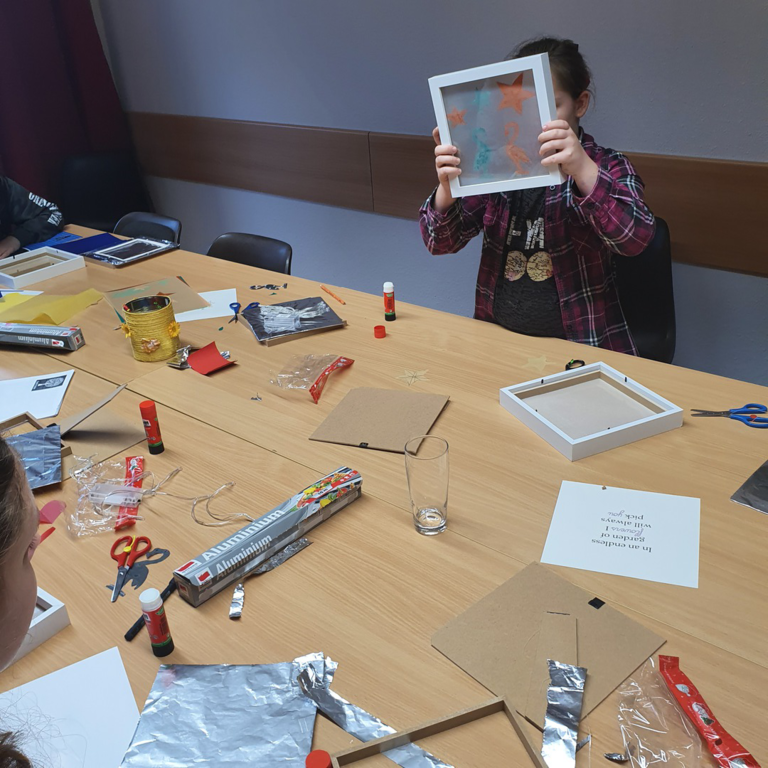 Wie bereits in Paunsdorf konnten nun auch die Ferienkinder in Grünau ihre ganz eigene Box aus einem Bilderrahmen gestalten und anschließend mit nach Hause nehmen.