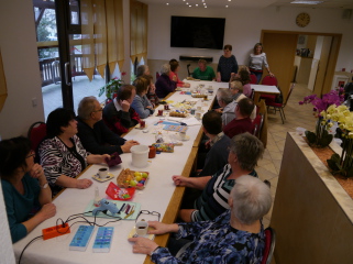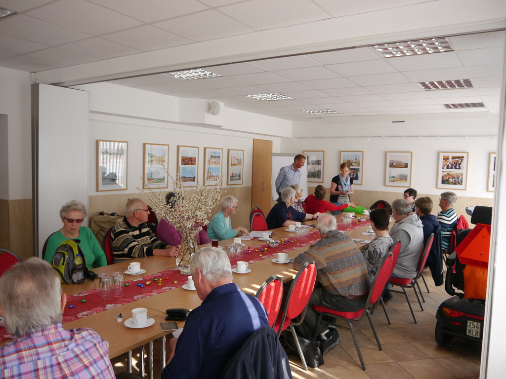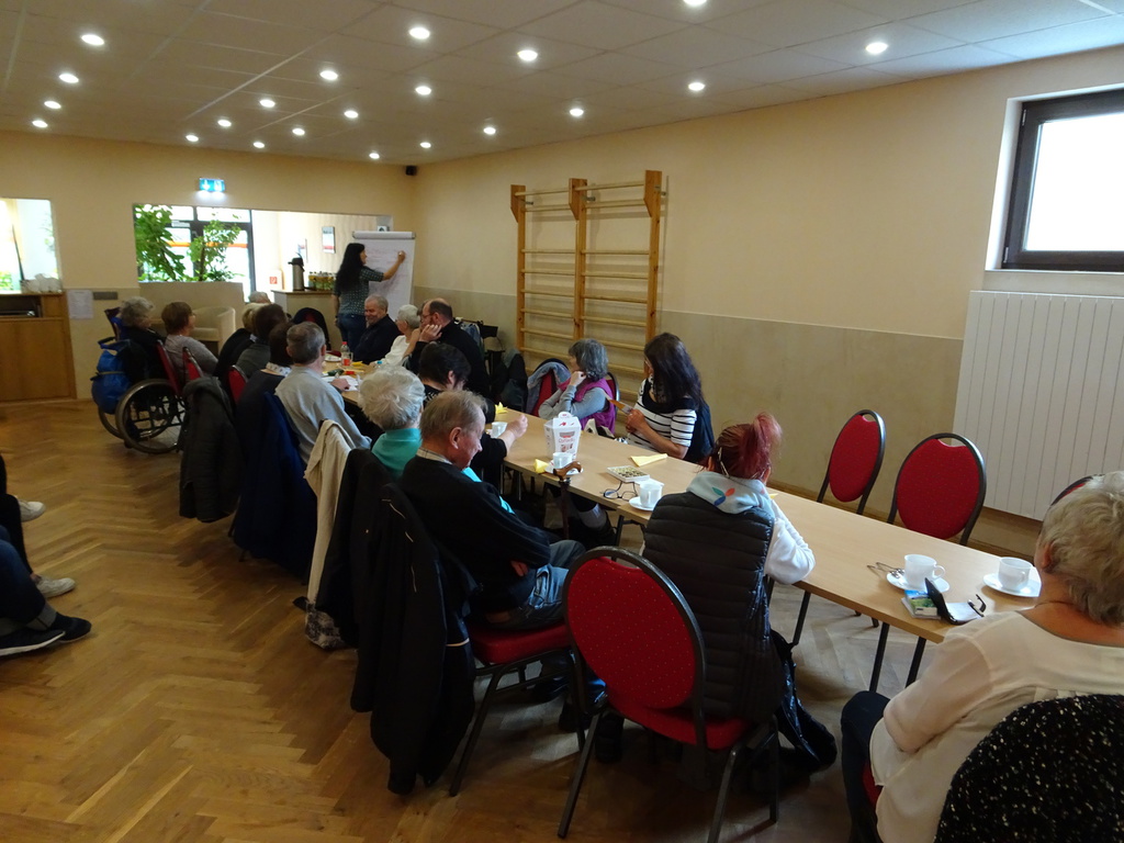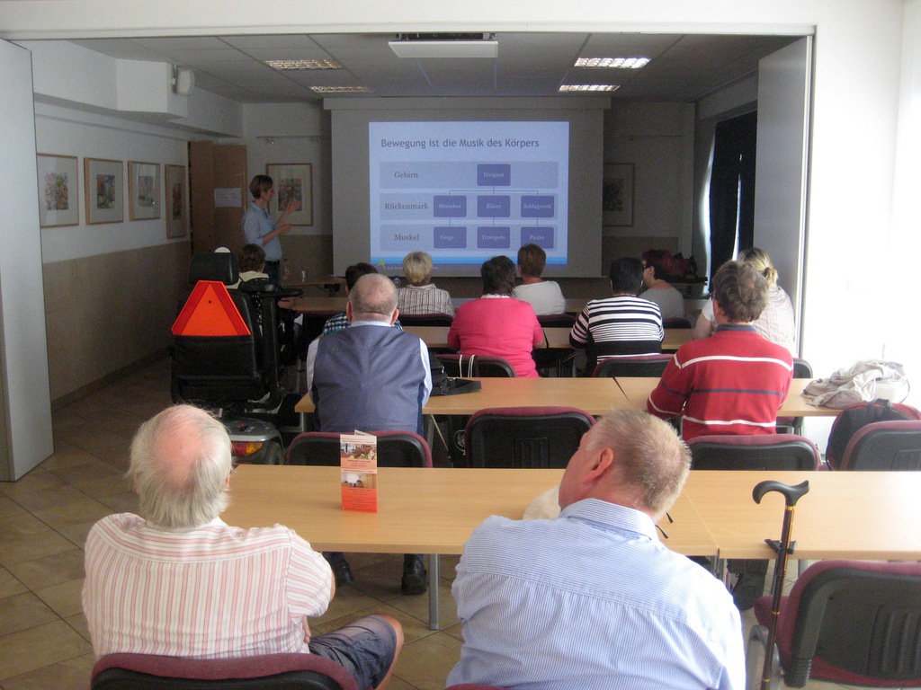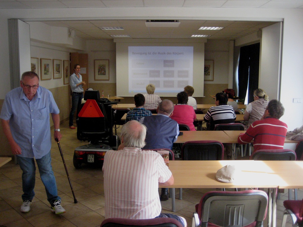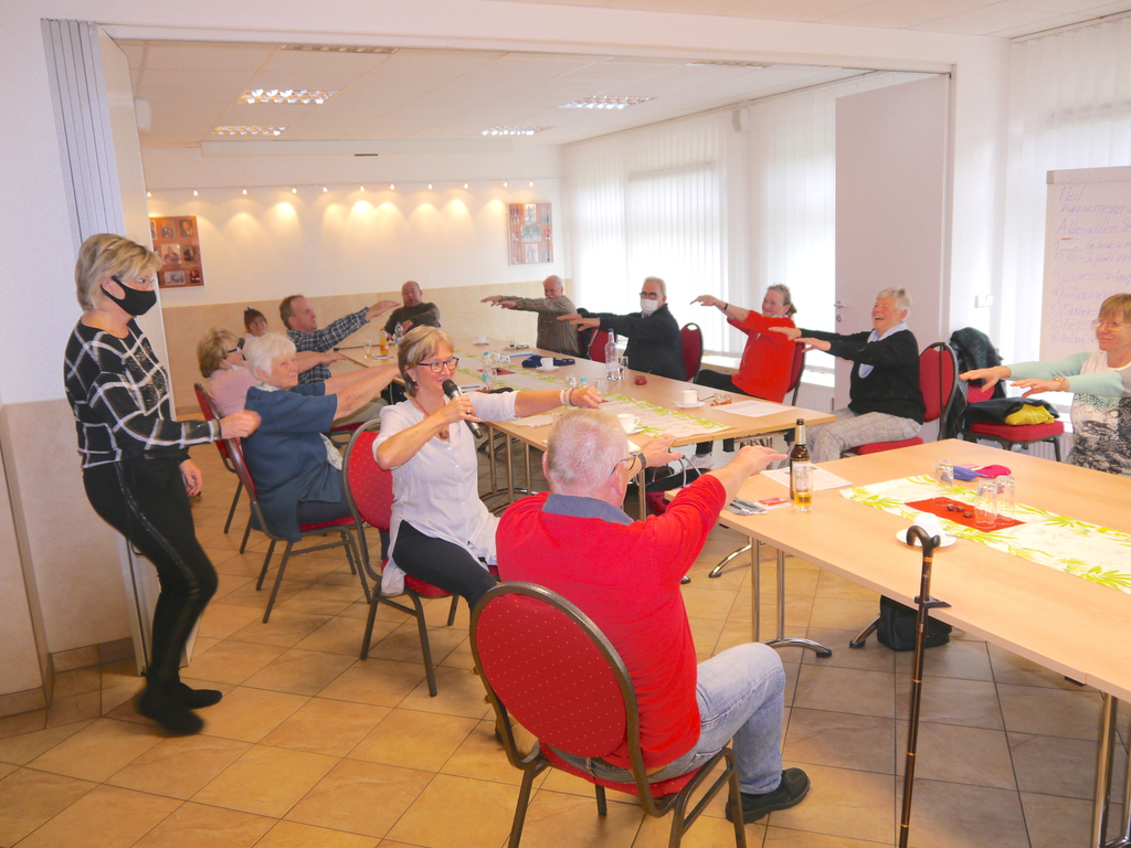 In zwei Gruppen wurden Bewegungsübungen im Sitzen und Stehen praktiziert – das hat allen, trotz großer Anstrengung, viel Freude bereitet. Eine Logopädie stellte dazu noch ein neues Gruppenangebot vor, das von den gesetzlichen Krankenkassen finanziell unterstützt wird.