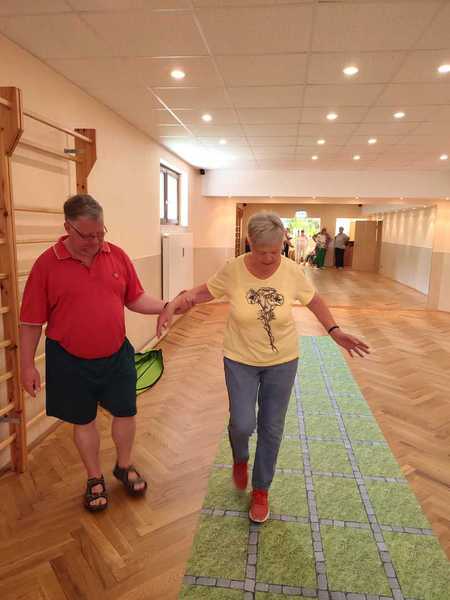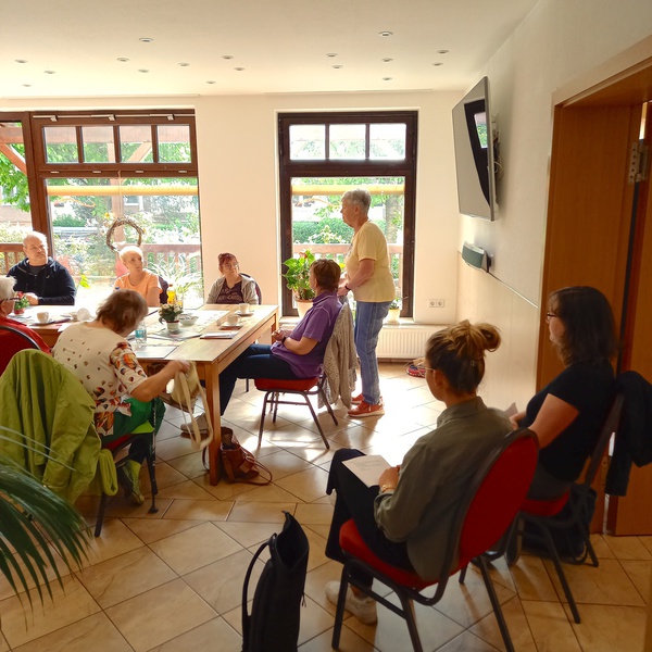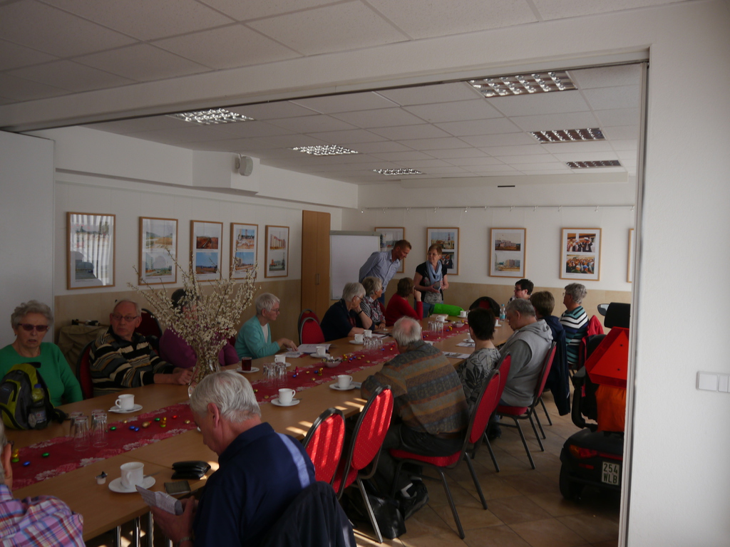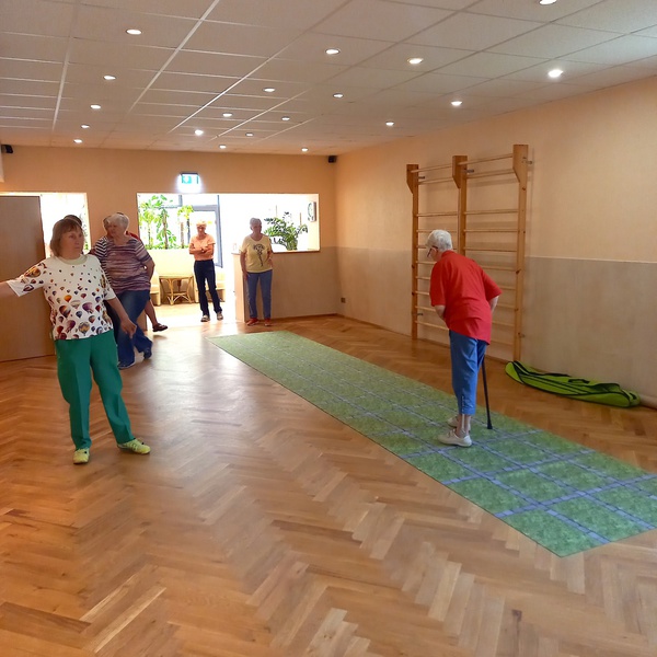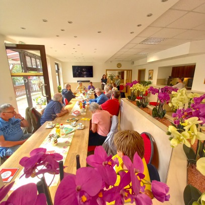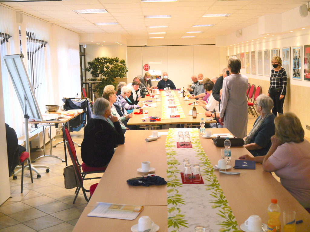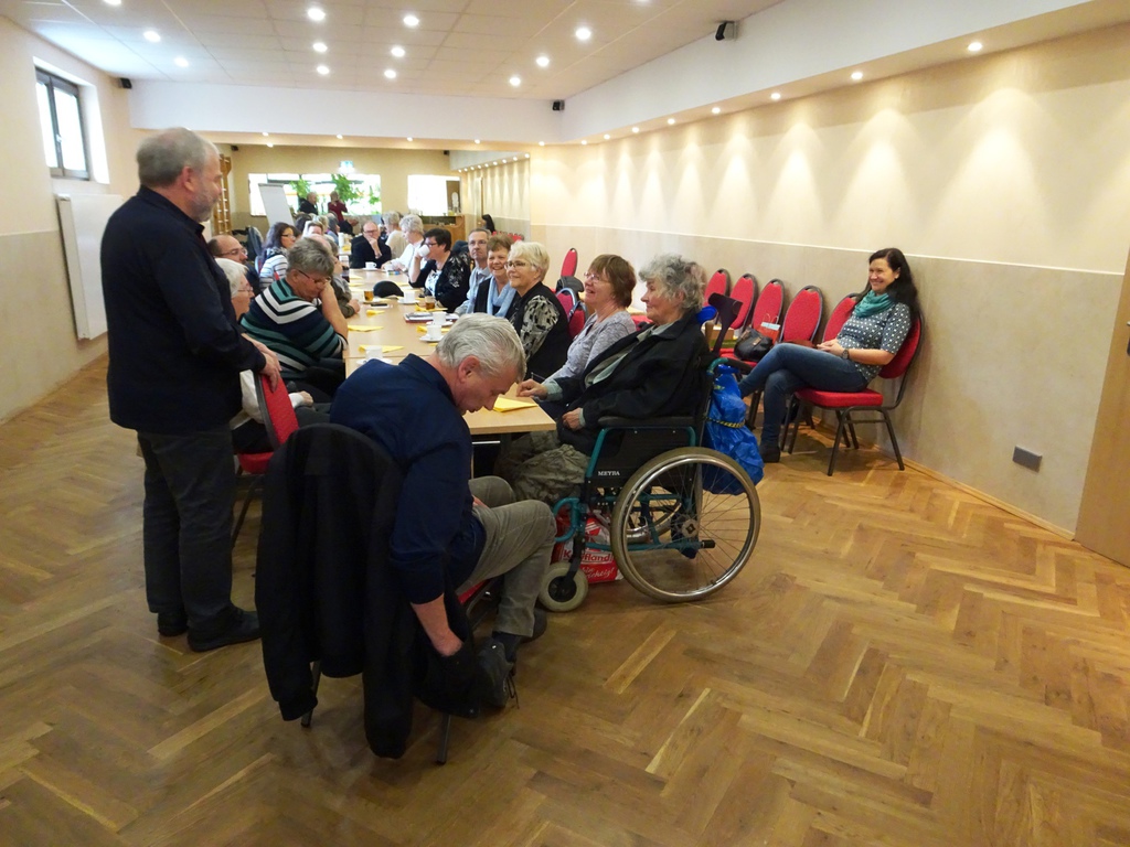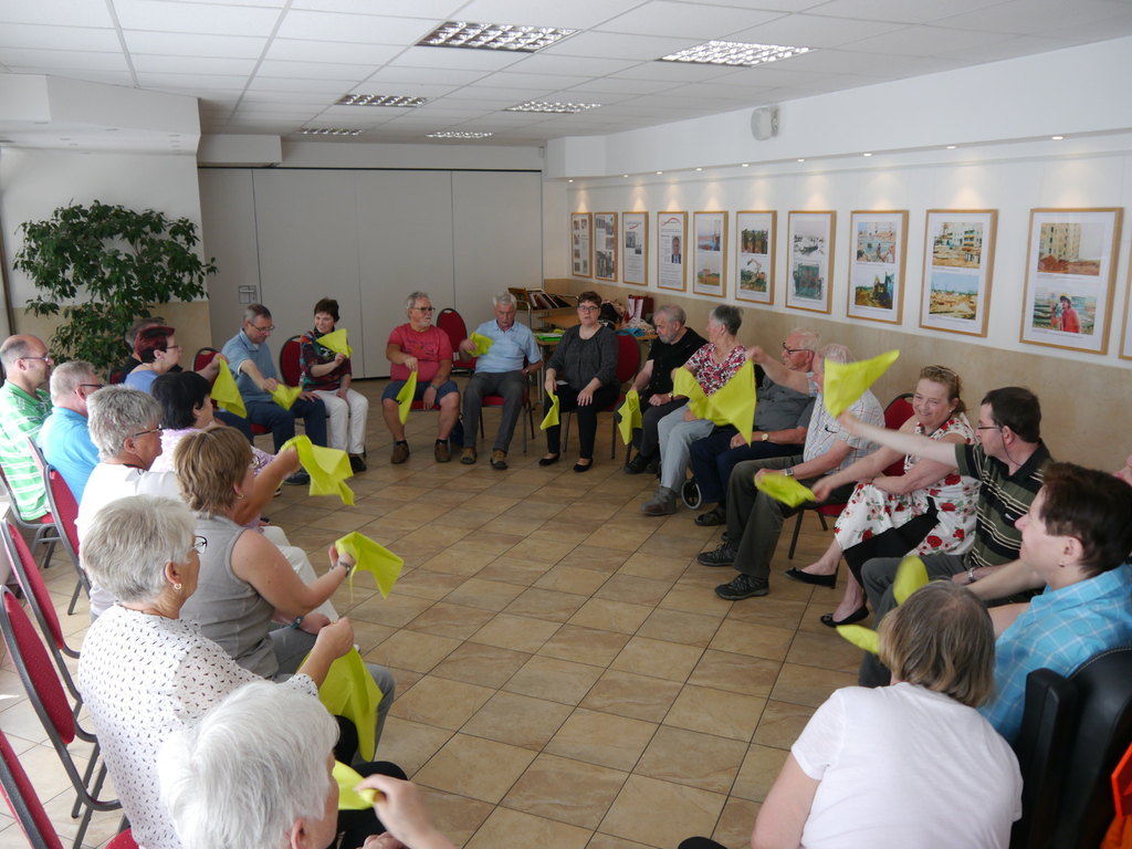 In zwei Gruppen wurden Bewegungsübungen im Sitzen und Stehen praktiziert – das hat allen, trotz großer Anstrengung, viel Freude bereitet. Eine Logopädie stellte dazu noch ein neues Gruppenangebot vor, das von den gesetzlichen Krankenkassen finanziell unterstützt wird.