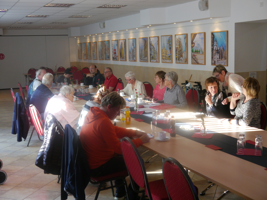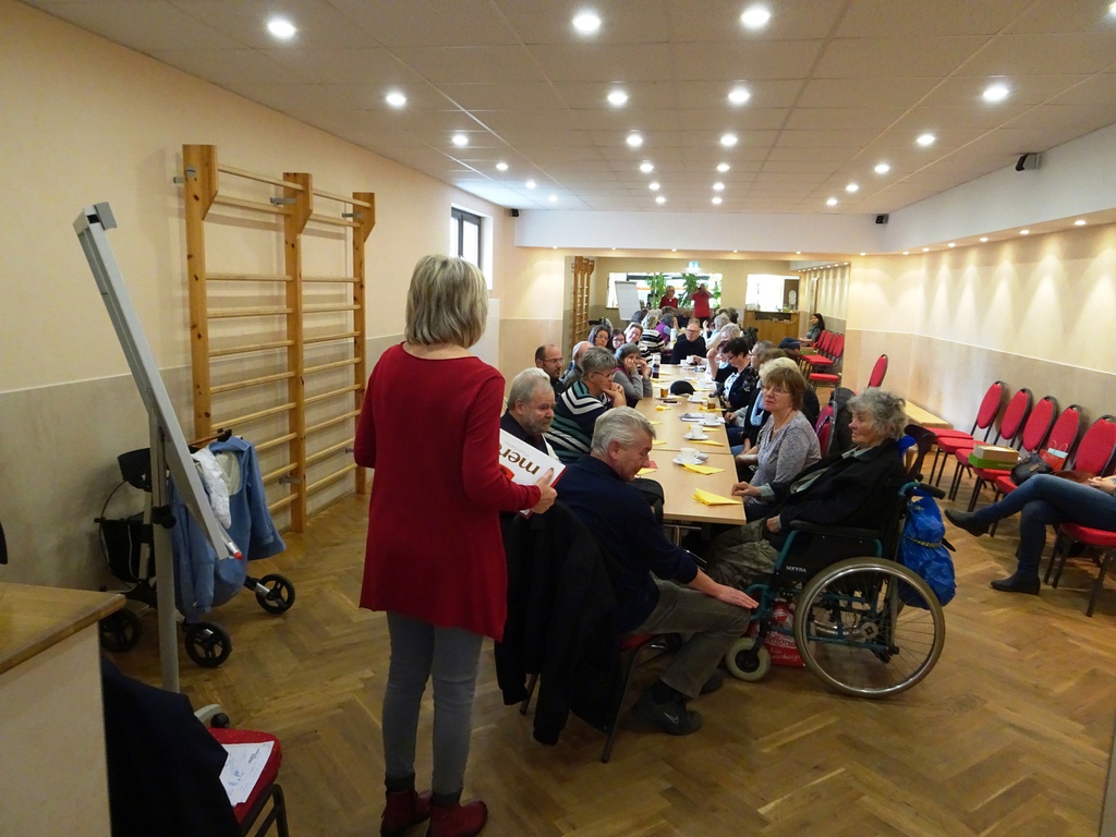Nach der Sommerpause und Außenveranstaltungen der SHG Schlaganfall widmete sich der Treff der Auswertung des Vergangenen und bereitete zukünftige Veran-staltungen vor. Carsten Zeuke als langjähriges Mitglied präsentierte stolz seine Goldmedaille und die Urkunde, die er bei den Deutschen Meisterschaften 2018 der Paraleichtathleten über die Distanz 5.000m erworben hat. Die Gruppe gratulierte ihm sehr herzlich zu diesem tollen Erfolg und wir schließen uns gern an. Die Termine für 2019 wurden schon mal notiert, nun geht es in die Planung, welche Veranstaltungen in der Goldsternstraße 9 stattfinden oder wo andere Ziele angestrebt werden. In kleinen Gruppen ging es spielerisch weiter, um Motorik, Gedächtnis und Konzentrationsfähigkeit zu testen bzw. zu trainieren. Seitens des JAV wurde das Angebot Soziale Dienstleistungen vorgestellt, das für einige Gruppenmitglieder von großem Interesse war. Sie sind trotz zum Teil großer Fortschritte in der Stabilisierung der Gesundheit nicht immer in der Lage, Alltägliches im Haushalt selbst zu bewältigen und ausreichende Hilfsangebote stehen nicht immer zur Verfügung.