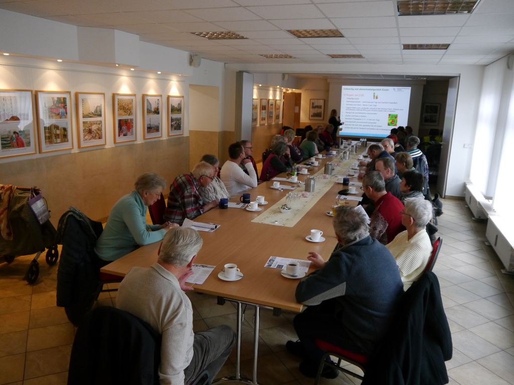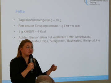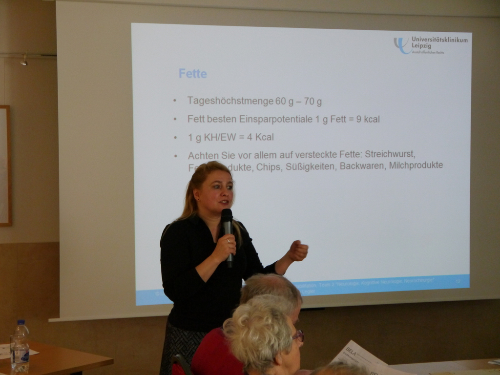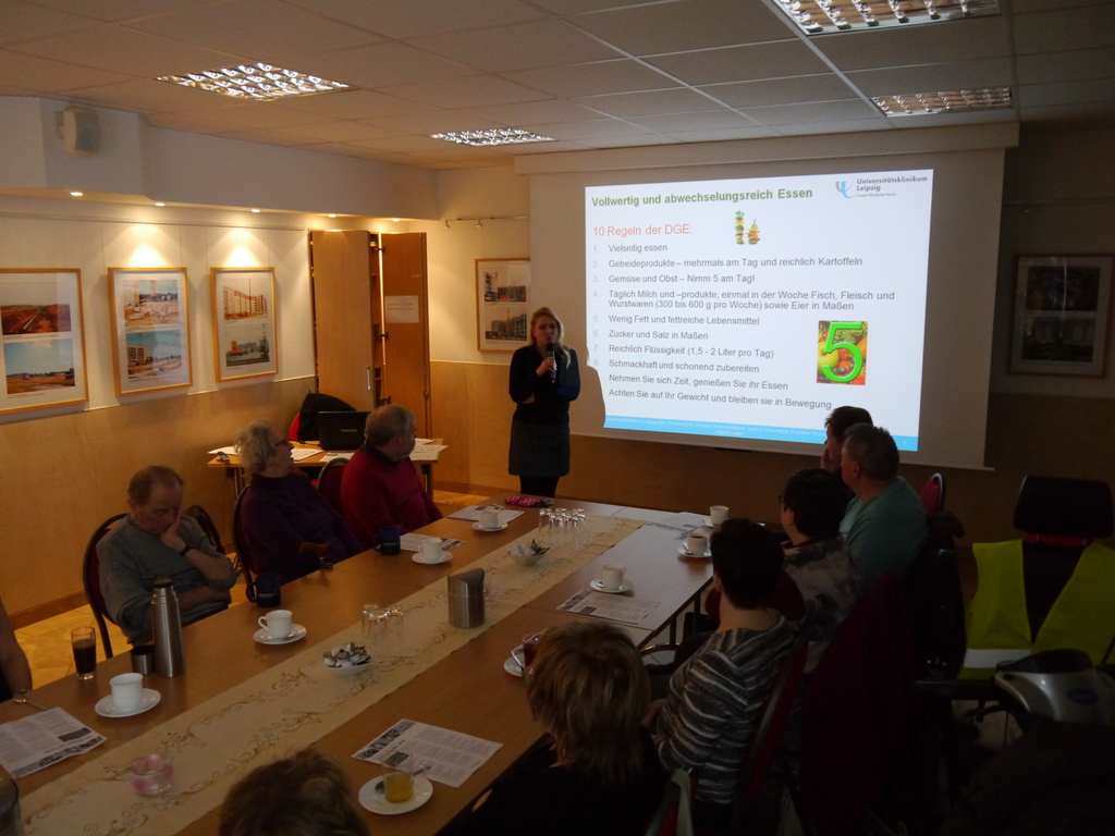 Eingeladen war Elvira Miedtank, Diplom-Sozialarbeiterin in der Universitätsklinik Leipzig, Bereich Tagesklinik für Kognitive Neurologie, die zum Thema der gesunden Ernährung einen informativen Vortrag vorbereitet hatte. Im anschließenden munteren Austausch konnte jeder Teilnehmer sein Wissen bzw. seine Erfahrungen mit bestimmten Essgewohnheiten oder Lebensmitteln einbringen. Als Anregung und Anleitung für Zuhause erhielt jeder Teilnehmer Material zum Nachlesen.