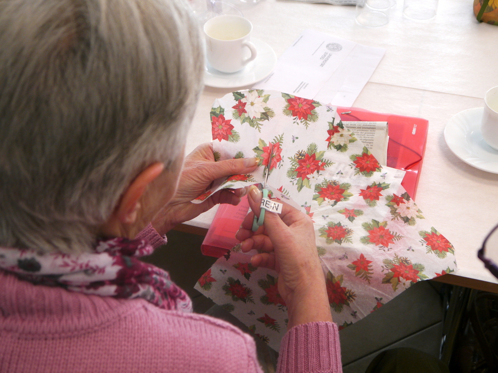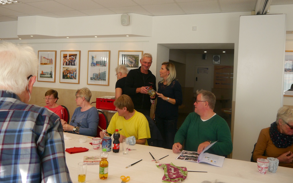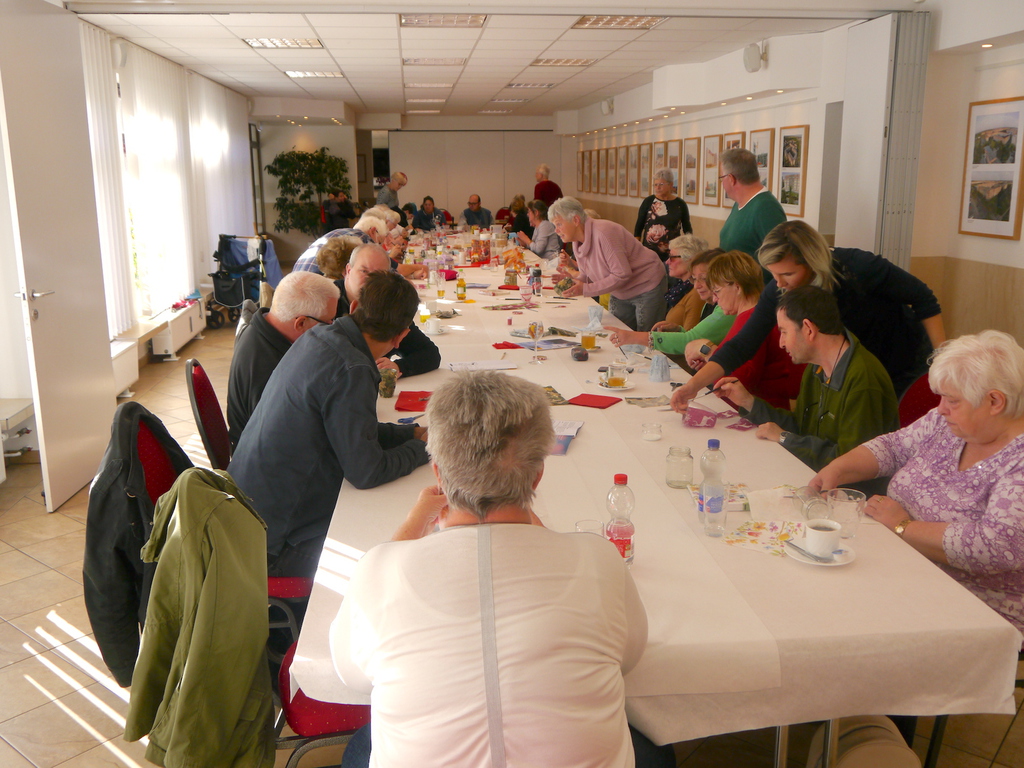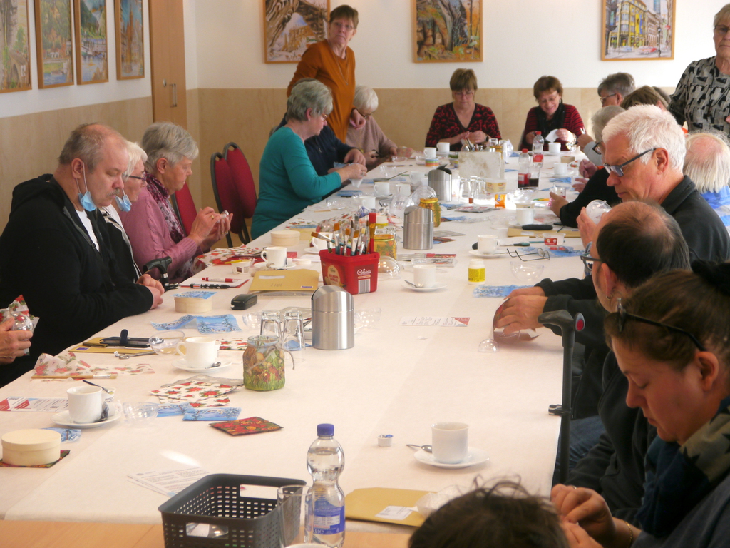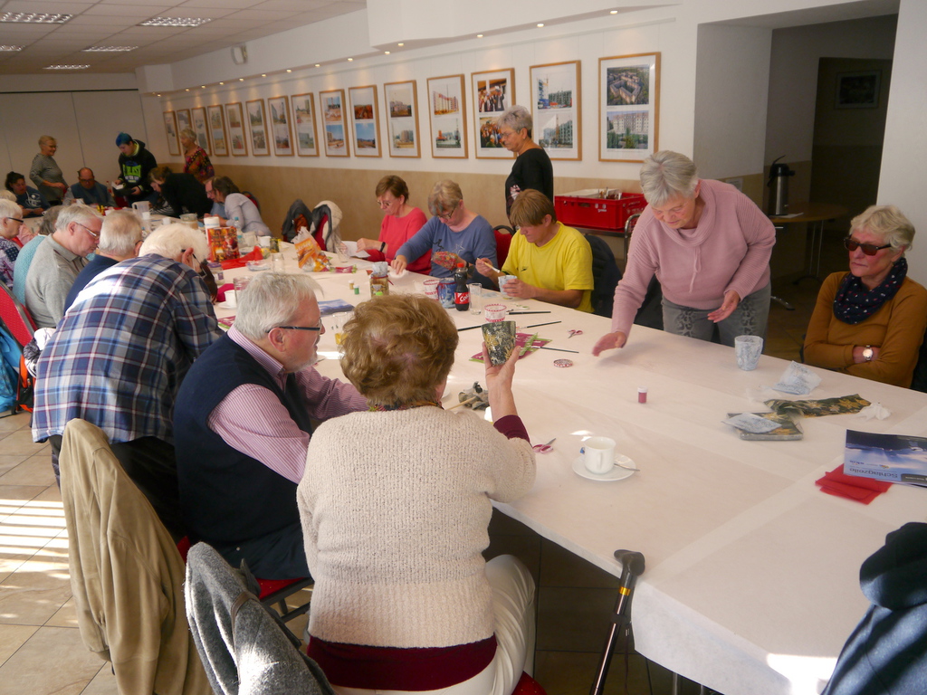 Nach einem Schlaganfall ist es von hoher Bedeutung, die eigene Feinmotorik zu trainieren. Die Selbsthilfegruppe Schlaganfall setzt daher bei jedem Treffen darauf, Spaßiges mit Sinnvollem zu kombinieren. Sehr schnell stellt sich dann heraus, dass die Gruppe sich gegenseitig stärkt: Wo der Eine Schwierigkeiten hat, hilft schnell ein Anderer. Auch die Mitarbeiterinnen und Mitarbeiter des Jugend- und Altenhilfevereins unterstützten die Gruppenmitglieder und halfen beim Kleben, Binden, Schneiden und Pinseln. An dieser Stelle ein herzliches Dankeschön für die Hilfe und den heiteren Nachmittag in den Räumlichkeiten in der Goldsternstraße.