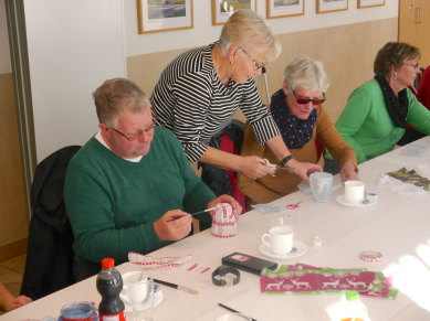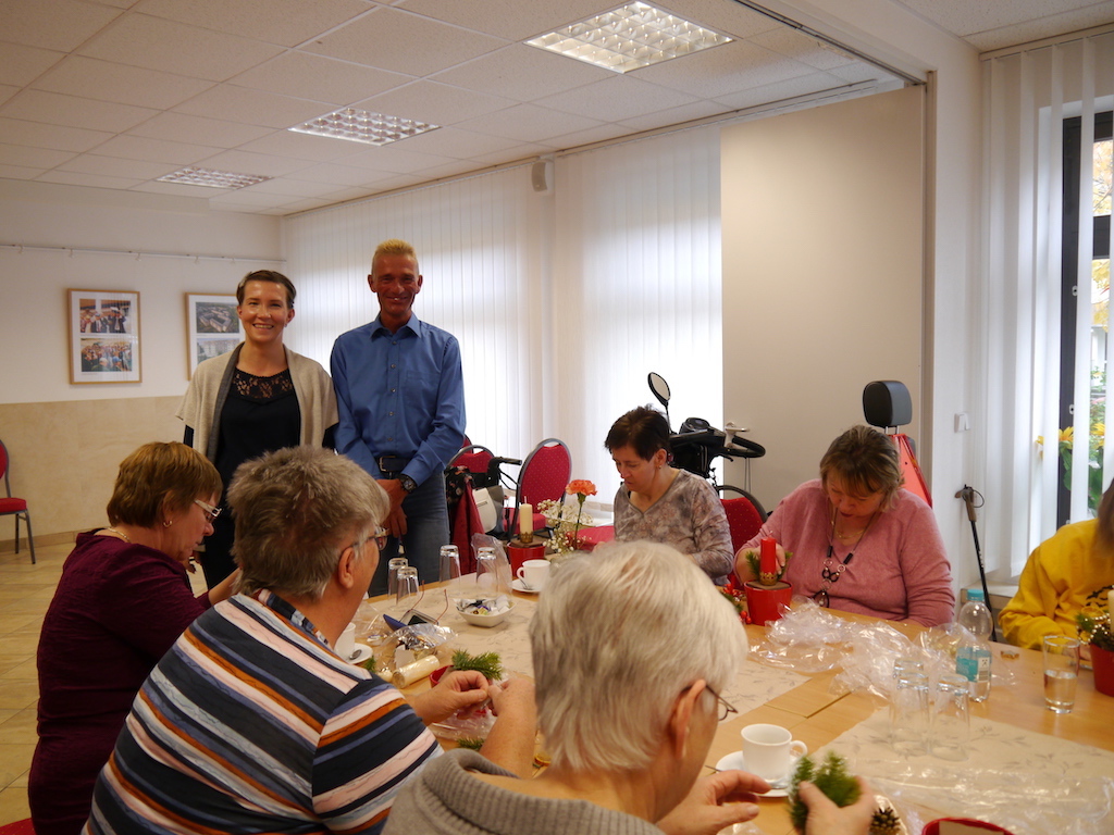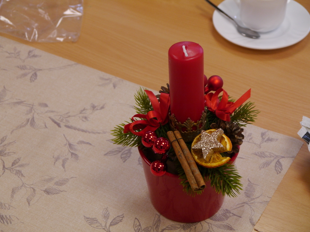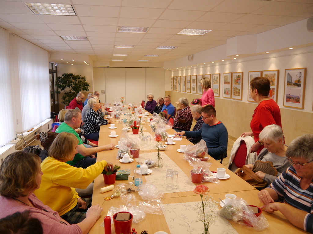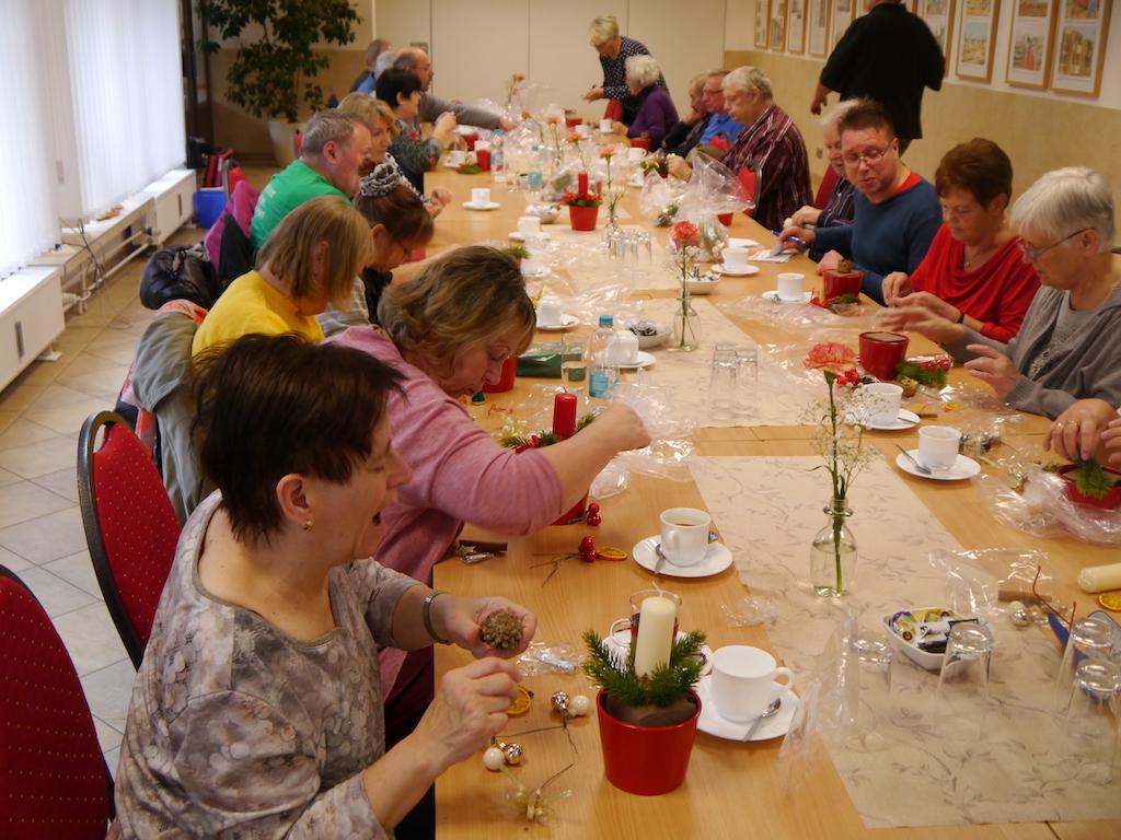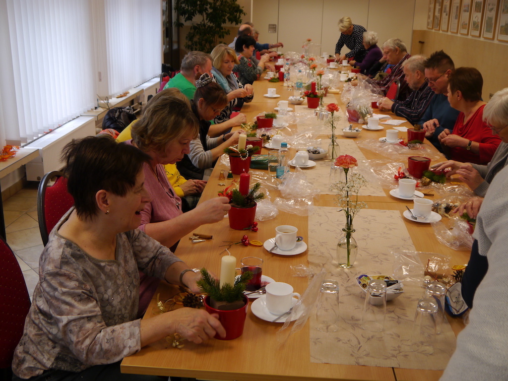 In geselliger Runde bastelten die Mitglieder der SHG Schlaganfall weihnachtliche Adventsgestecke. Da nach einem Schlaganfall häufig motorische Defizite zurückbleiben, sind feinmotorische Aufgaben ein wichtiger Therapiebestandteil zur Verbesserung der Beweglichkeit. Die Mitglieder der SHG trainierten somit ihre Bewegungsfertigkeiten und freuten sich am Ende über die selbstgebastelten Adventsgestecke!