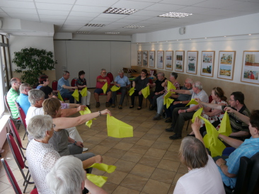 In Folge eines Schlaganfalls oder Unfalls erleiden viele Menschen Hirnschädigungen, welche oftmals auch mit Mobilitätseinschränkung einhergehen. Daher führten die Mitglieder der SHG Schlaganfall zu ihrem Treffen Anfang Juni 2019 gemeinschaftlich ein paar kleine Übungen im Sitzen durch, bei welchen sie insbesondere die Koordination von Auge und Hand trainierten. Da die Übungen weder viel Platz noch besondere Gerätschaften benötigen, können diese auch ganz einfach zuhause nachgemacht und weiter trainiert werden. Nach dem Training wurde noch in gemütlicher Runde zusammen gesessen und bei einem Tässchen Kaffee über die verschiedensten Themen gesprochen.