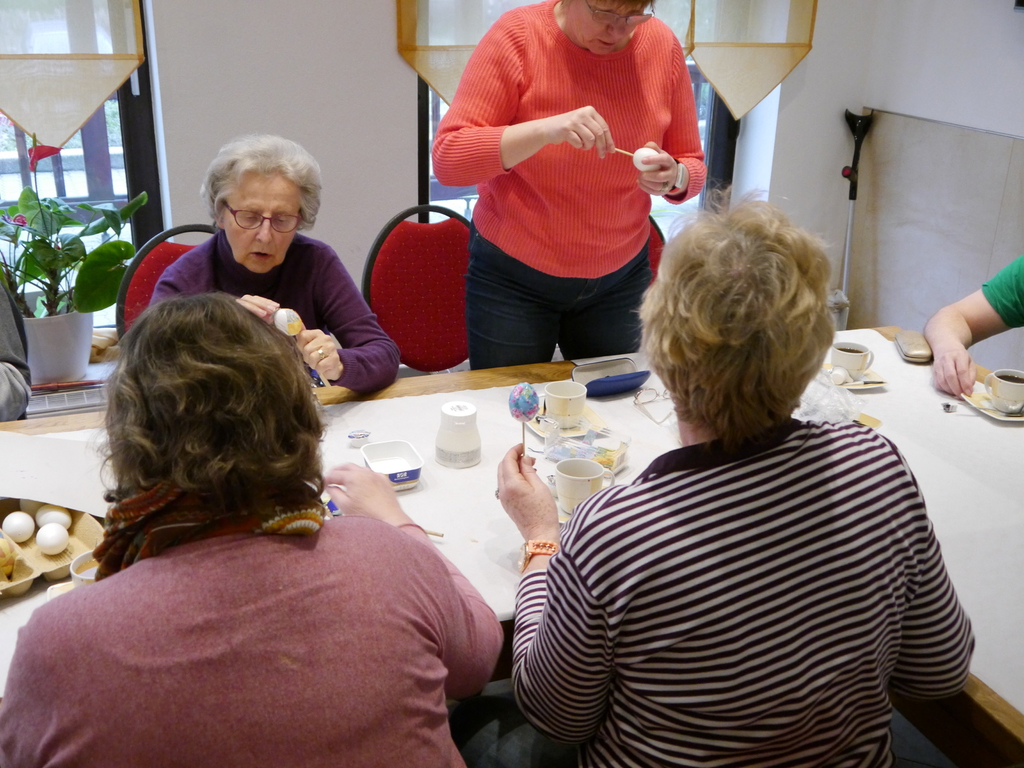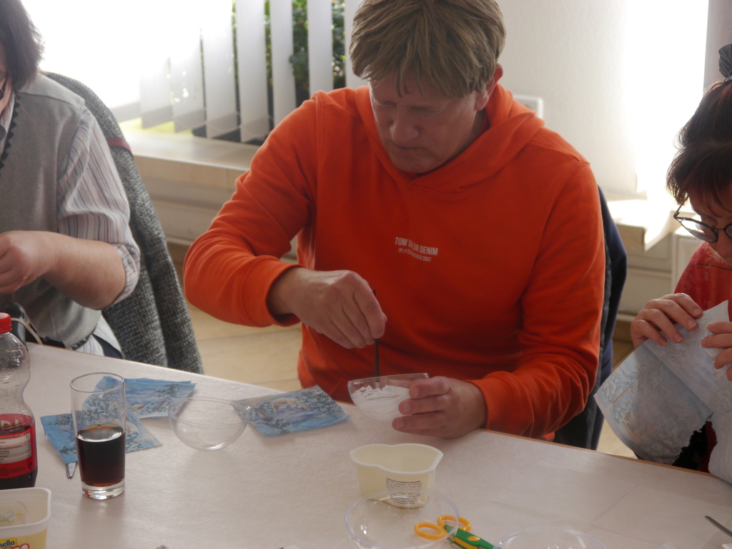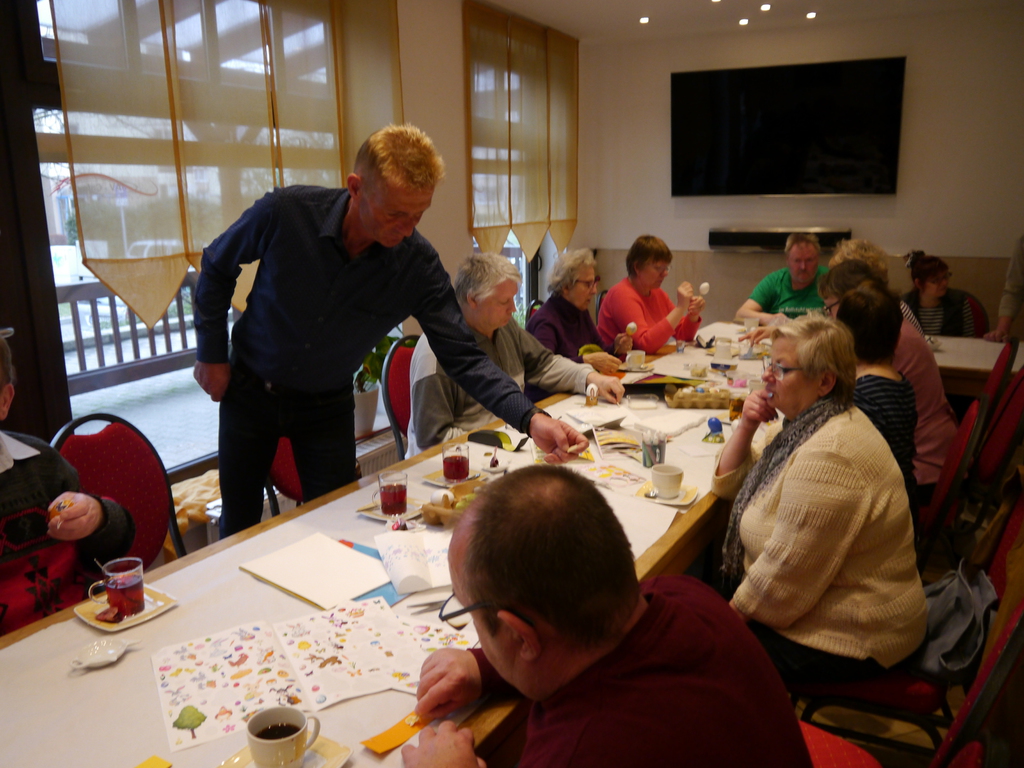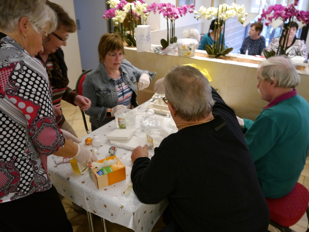 Die Teilnehmer trainierten dabei insbesondere ihre feinmotorischen Fertigkeiten und unterstützten sich gegenseitig. Im Ergebnis entstand dekorativer Osterschmuck, so dass das Osterfest nun kommen kann!