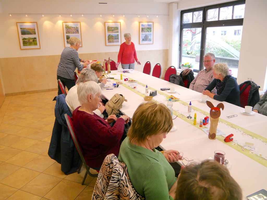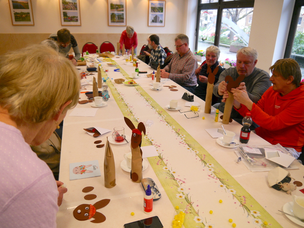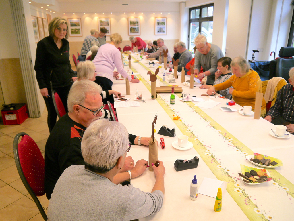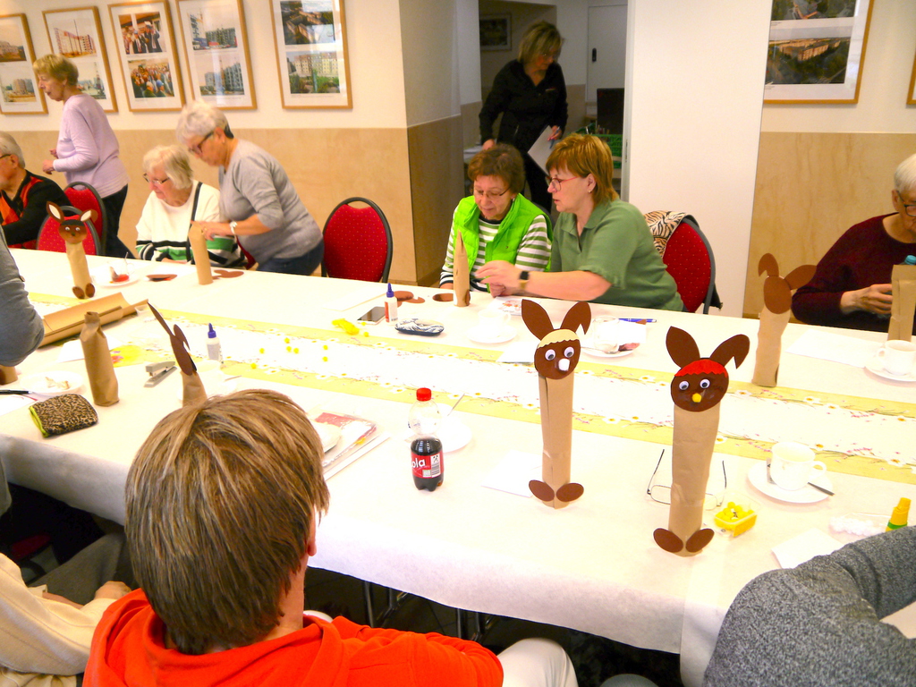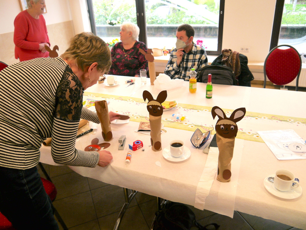 Die Gruppe unterstützte sich gegenseitig beim Basteln von süßen Osterhasen, welche sich für das immer näher rückende Osterfest z.B. als dekoratives Highlight im Osternest platzieren lassen. Die Ergebnisse können sich sehen lassen – die lange Bastel-Tafel in unseren Vereinsräumlichkeiten in der Goldsternstraße füllte sich schnell mit putzigen Häschen. Der gesellige Nachmittag stimmte alle freudig auf das Osterfest.
