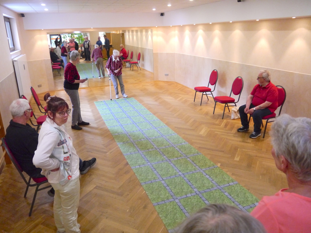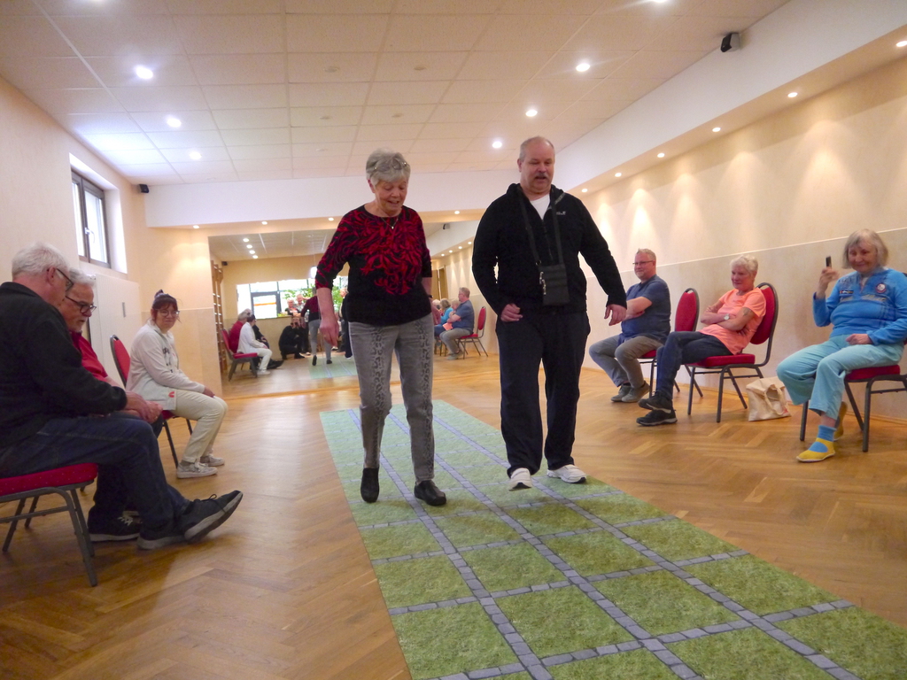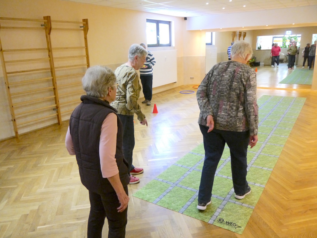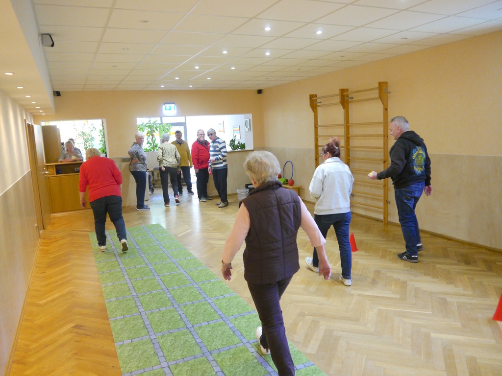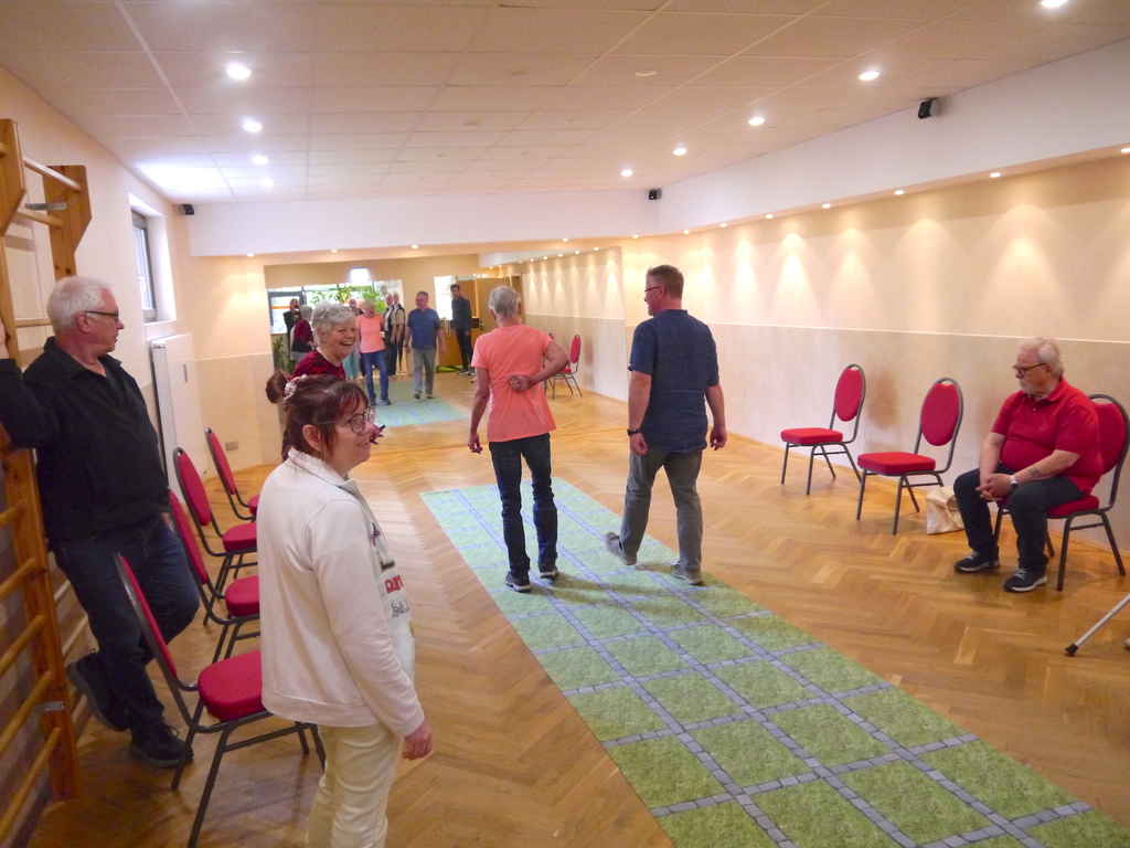 Ergänzt wurde das Angebot durch gezielte Gang- und Gleichgewichtsübungen auf einer G-WEG®-Matte, die mit einem simulierten Pflastersteinmuster auf grünem Untergrund gestaltet ist. Diese Matte dient der Förderung eines sicheren Gangs, der Trittsicherheit sowie der gezielten Sturzprophylaxe. In kleinen Gruppen wurden verschiedene Bewegungsabläufe eingeübt und durch zusätzliche Hindernisse wie Pylonen und Reifen ergänzt. Alle Übungen fanden unter Anleitung und in einem geschützten Rahmen statt, in dem gegenseitige Rücksichtnahme und Motivation selbstverständlich waren.