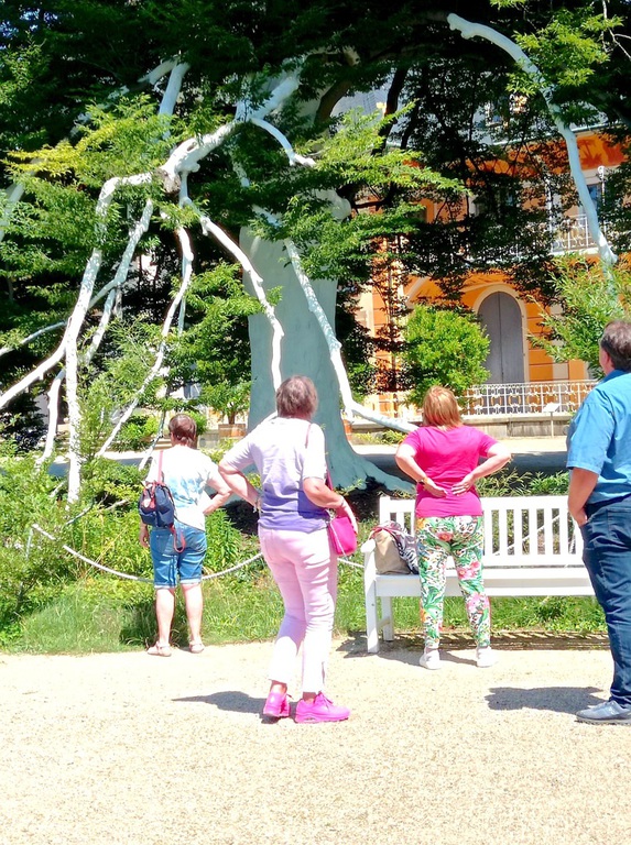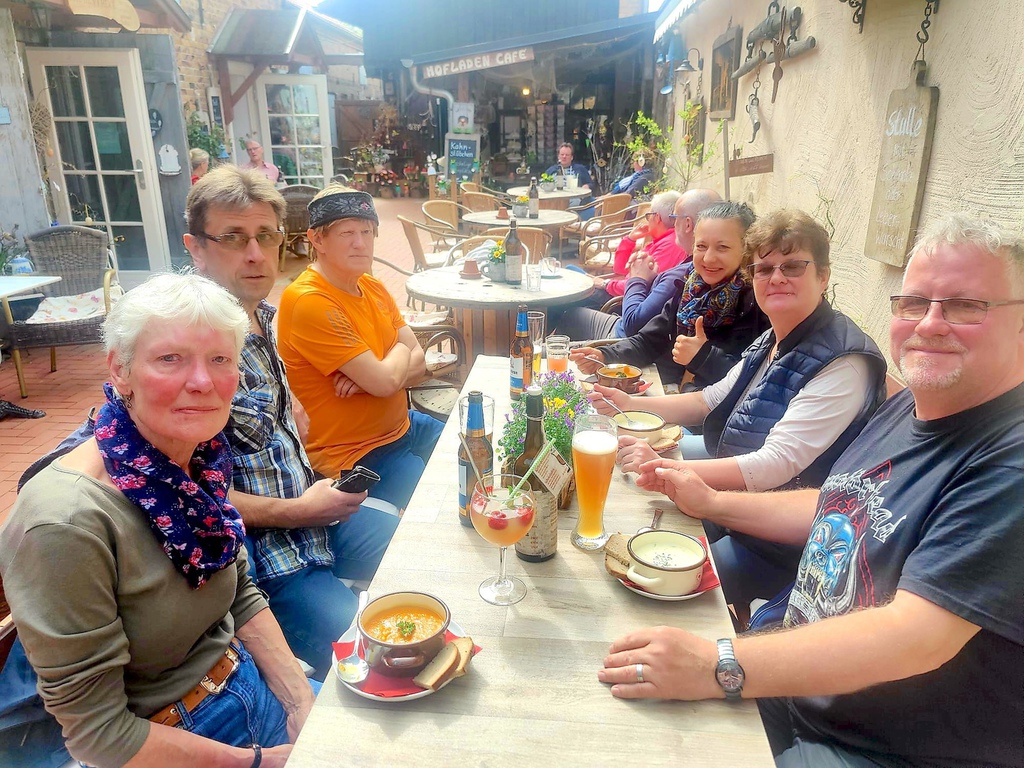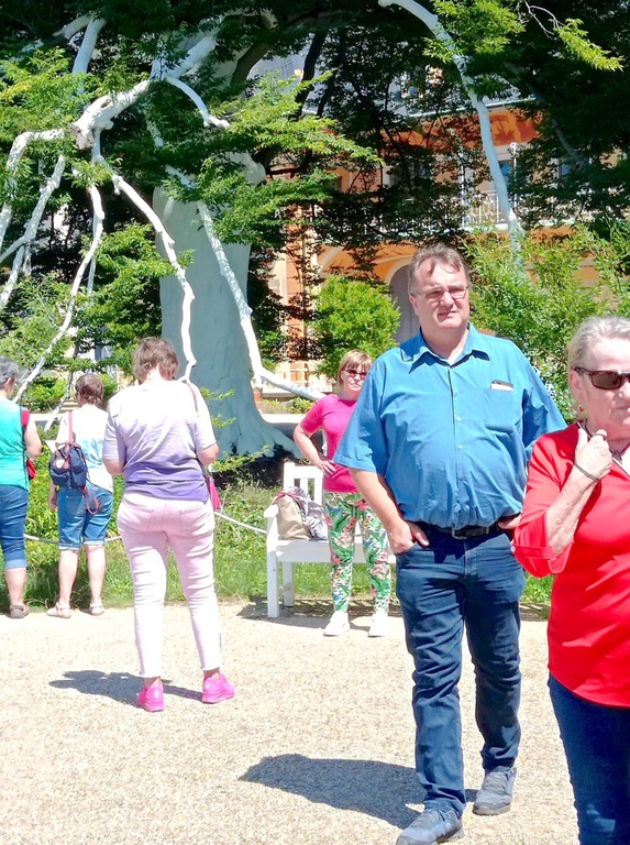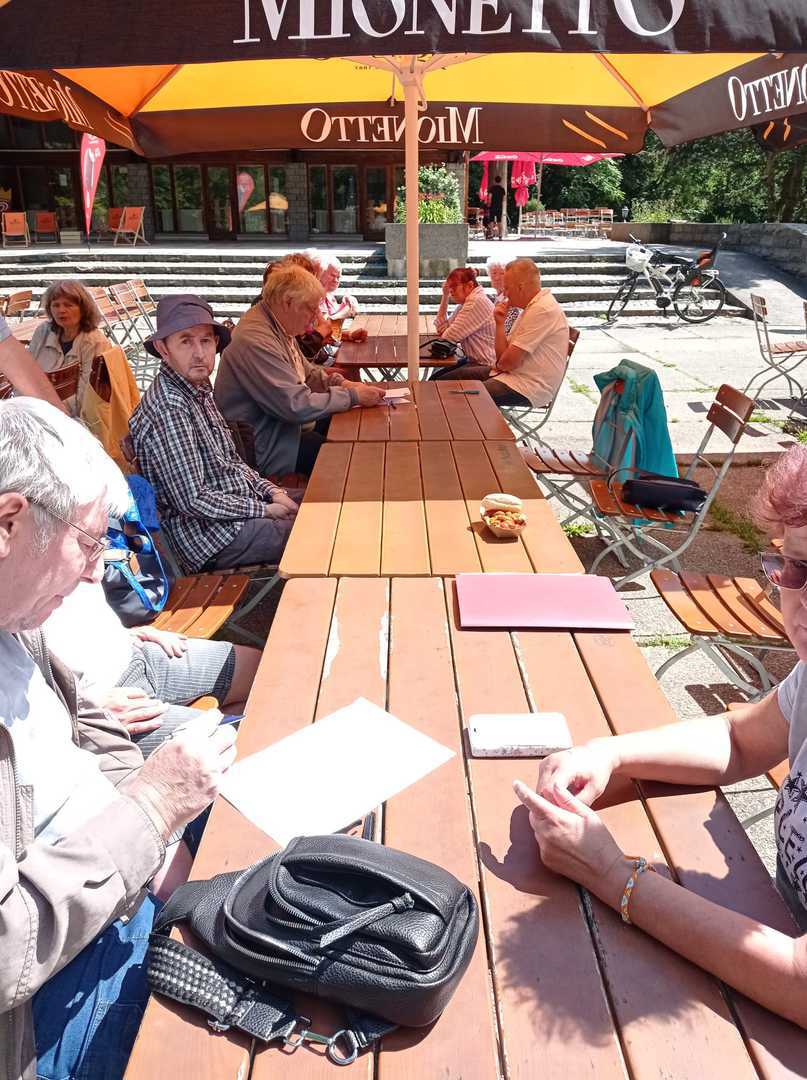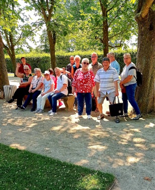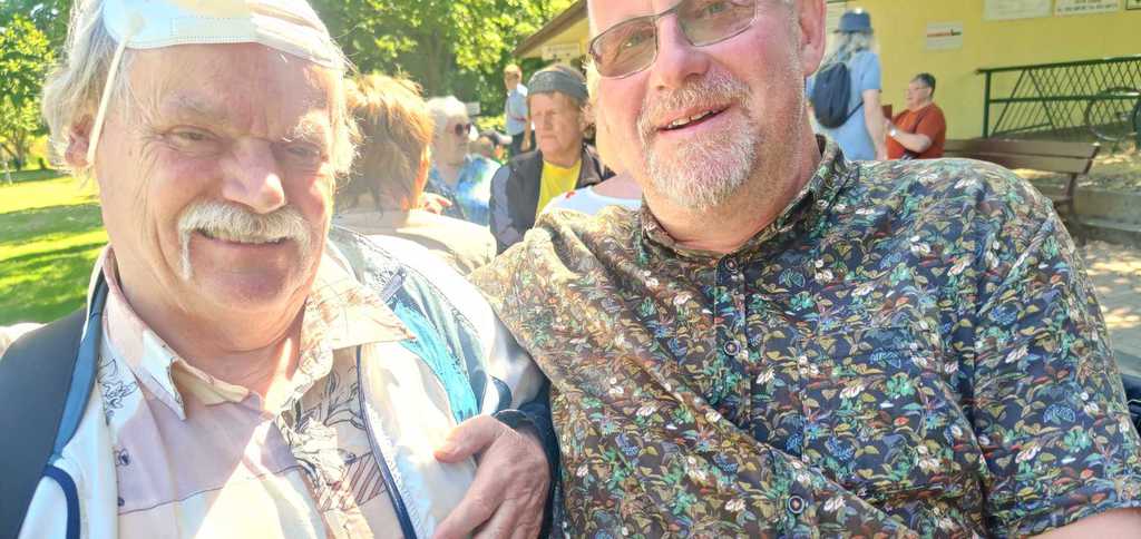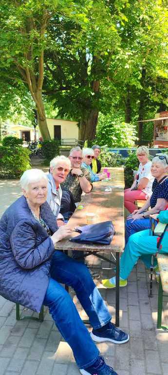 Da gab es zwei Mitglieder, UWE und CHRISTIAN, die eine „Durchhalte-Medaille“ verdienen. Was sich die beiden Fußkranken zugemutet haben, ist lobenswert. Aber auch Dagmar möchte ich nicht vergessen, mit neuem Knie diese Strapaze mit zu machen: 1000 mal Lob. Obendrauf organisierte sie uns allen einen schönen Ausflug mit reibungslosem Ablauf. Danke auch an unsere Mitstreiter, die sich um einen Bus bemüht haben und ein sehr gutes Händchen dafür hatten. Während der Kaffeepause im SCHATTEN gab es genügend Zeit, auch mal persönliche Worte an den einen oder anderen zu richten. Meine Einschätzung, ihr seid großartig, Danke für die Ausdauer. Außerdem ist mir positiv aufgefallen, wie umsichtig alle mit den Schwächeren umgegangen sind, obwohl alle mit Einschränkungen behaftet sind.