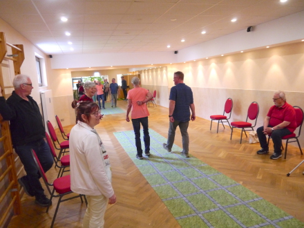 Im angrenzenden Sportraum der Vereinsräumlichkeiten in der Goldsternstraße praktizierten unsere Mitglieder die Übungen und unterstützten sich gegenseitig bei den Gehübungen. Auch bei den Sitzgymnastik-Übungen entstand eine motivierende und sich gegenseitig unterstützende Gruppenatmosphäre.