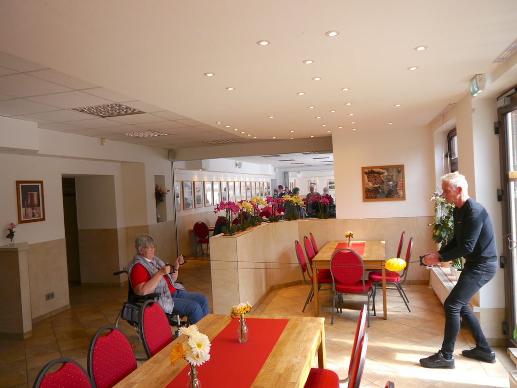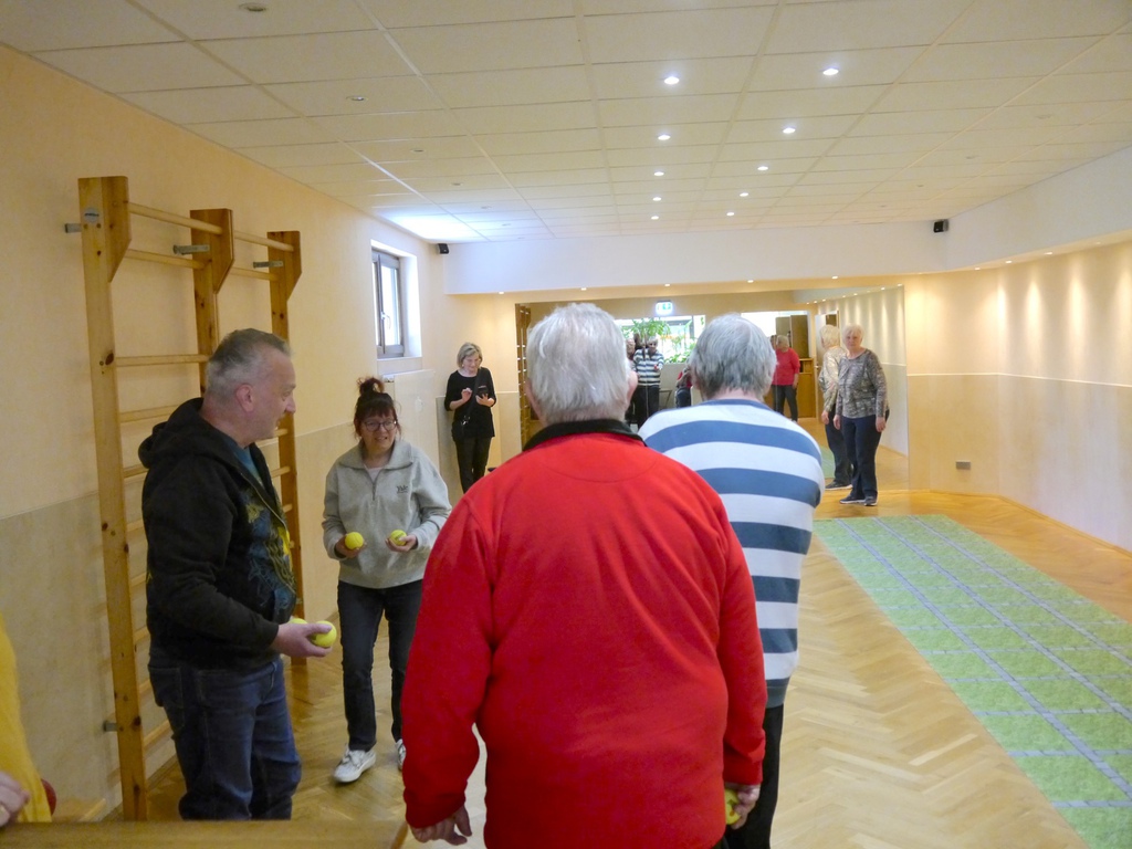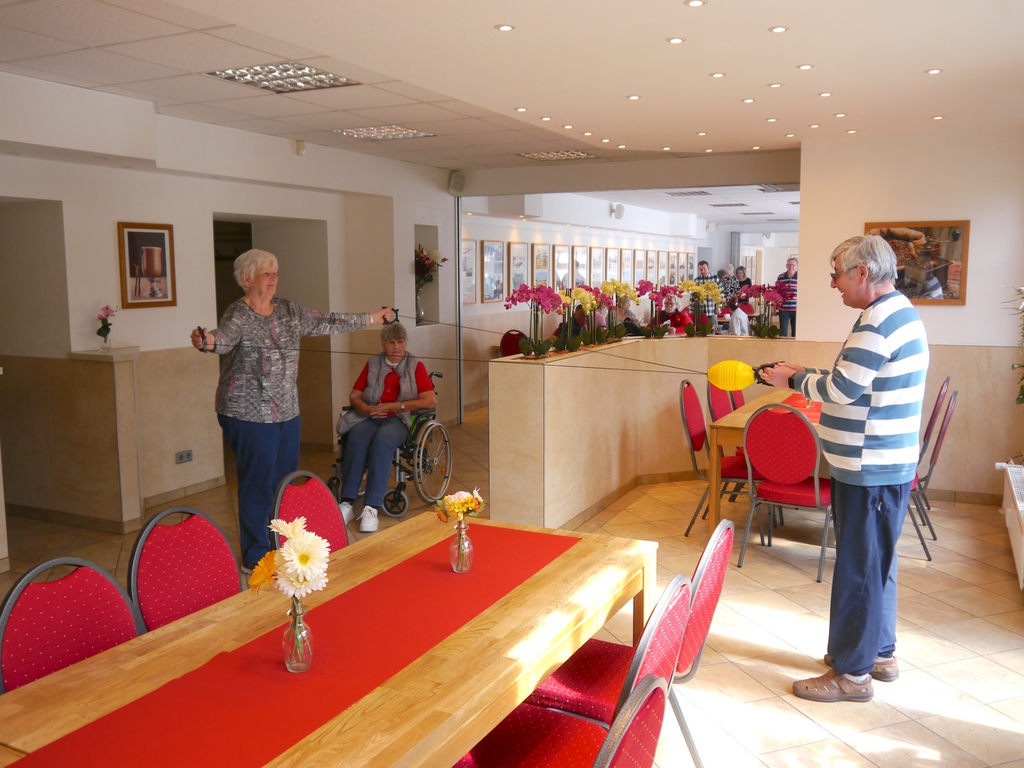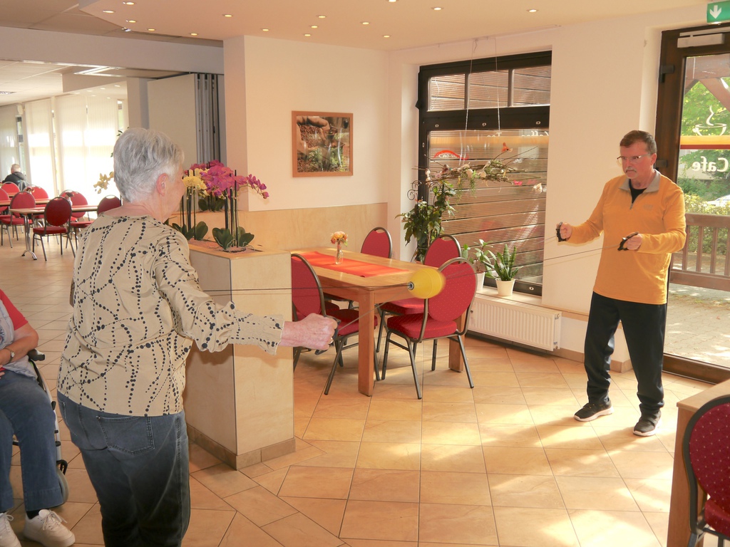 Ein zentraler Bestandteil des Tages war das gezielte Bewegungstraining. Dabei kamen verschiedene Trainingsgeräte zum Einsatz, die auf die besonderen Bedürfnisse von Menschen nach einem Schlaganfall abgestimmt sind. Besonders im Fokus stand ein sogenannter Flexibar, auch bekannt als Schwingstab oder Schwingband, mit gelber Mittelrolle. Das Gerät wurde von jeweils zwei Personen über Seilführungen in Schwingung versetzt. Durch die rhythmischen Bewegungen der Kugel wurden Reaktionsfähigkeit, Koordination und Konzentration gleichermaßen trainiert. Der große Vorteil: Die Anwendung ist auch sitzend möglich und somit auch für Personen mit eingeschränkter Mobilität geeignet. Die gemeinsame Nutzung des Geräts förderte zudem das soziale Miteinander und trug spürbar zur guten Stimmung bei.