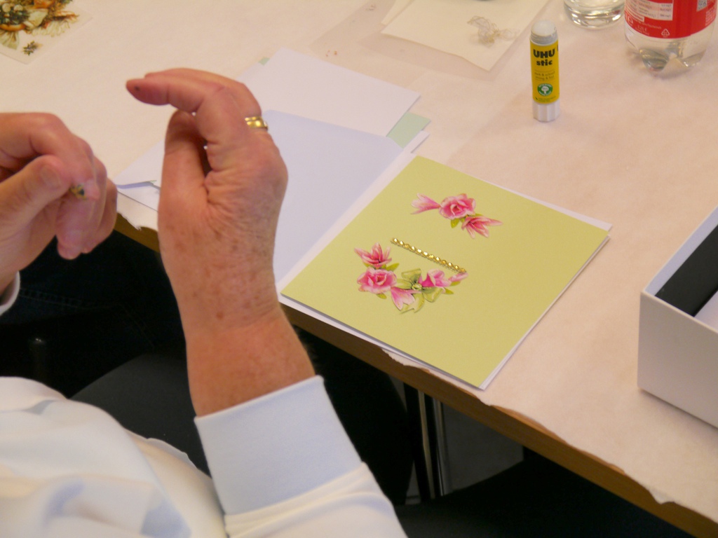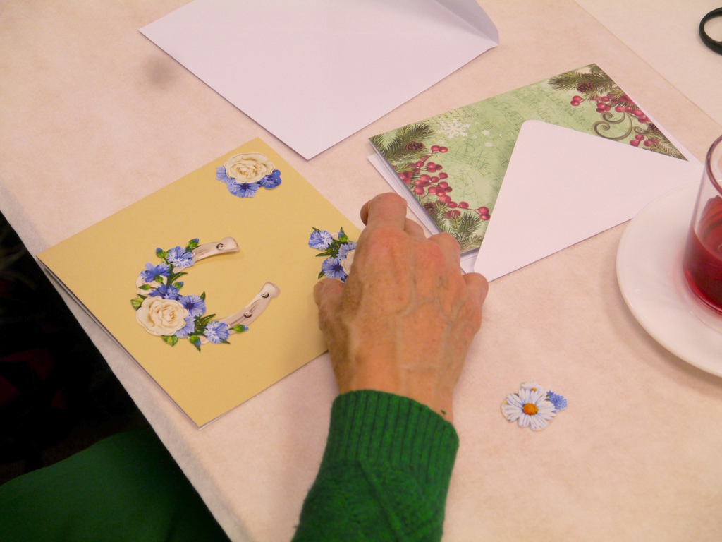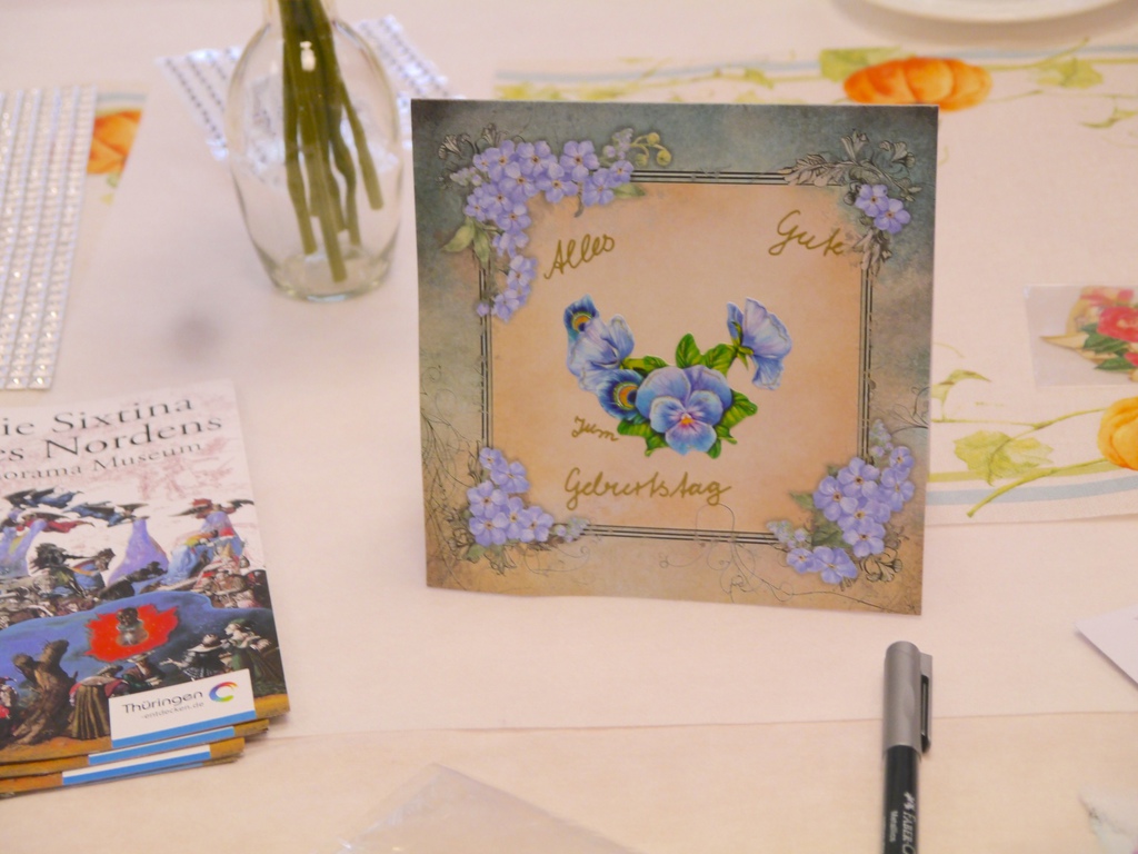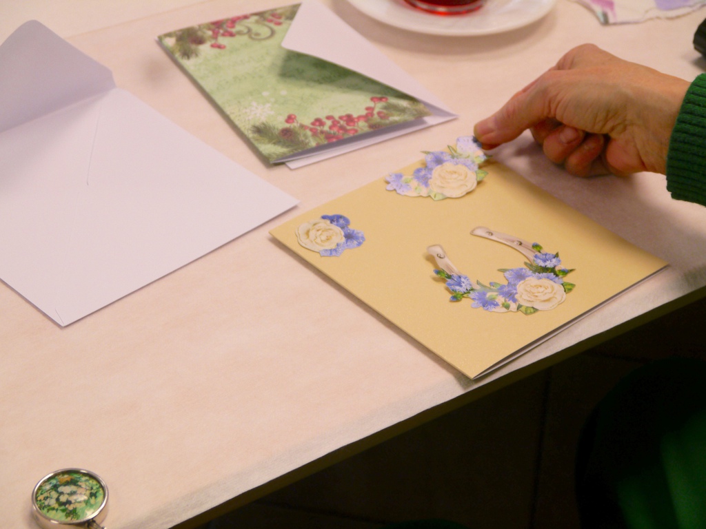 Rund um den liebevoll gedeckten Tisch entstanden mit viel Sorgfalt und Kreativität ganz unterschiedliche Karten – von floralen Motiven über nostalgische Drucke bis hin zu festlichen Designs. Die große Materialauswahl bot reichlich Inspiration, und schnell entwickelten sich Gespräche über Bastelideen, persönliche Vorlieben und Erinnerungen.