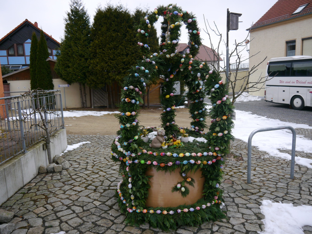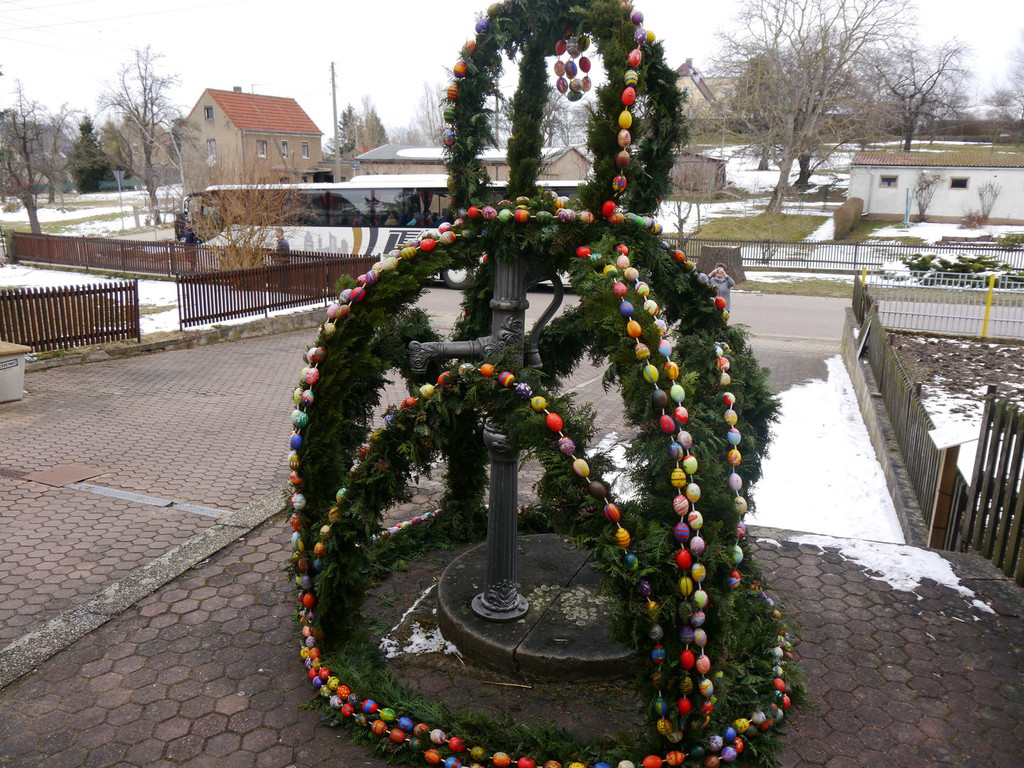 der Gemeinde Hirschstein mit ihren originellen Osterbrunnen.