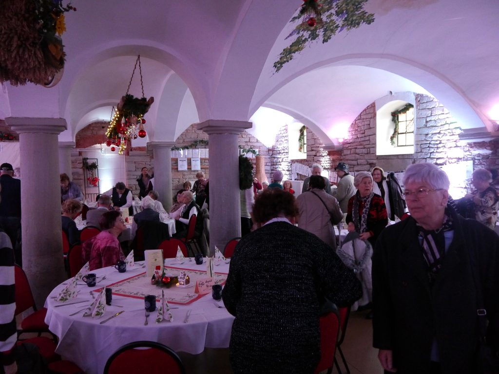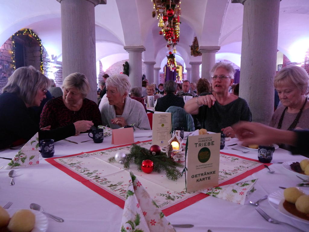 Unsere Weihnachtsbusfahrt führte uns nach Würchwitz auf das dortige Weingut Triebe. In der festlichen Winzerfesthalle erwartete unsere Vereinsmitglieder ein schmackhaftes Mittagsmahl, dem sich eine stimmungsvolle Weihnachtsrevue mit den »Original Saaletalern« anschloss. In der Programmpause wurde eine weihnachtliche Kaffeetafel mit hausgebackenem Thüringer Festtagskuchen serviert. Nach dem Festprogramm fuhren wir zum Werksverkauf der »Zetti Goldeck Süßwaren« in Zeitz, wo sich jeder nach Belieben mit vielerlei Leckereien eindecken konnte.